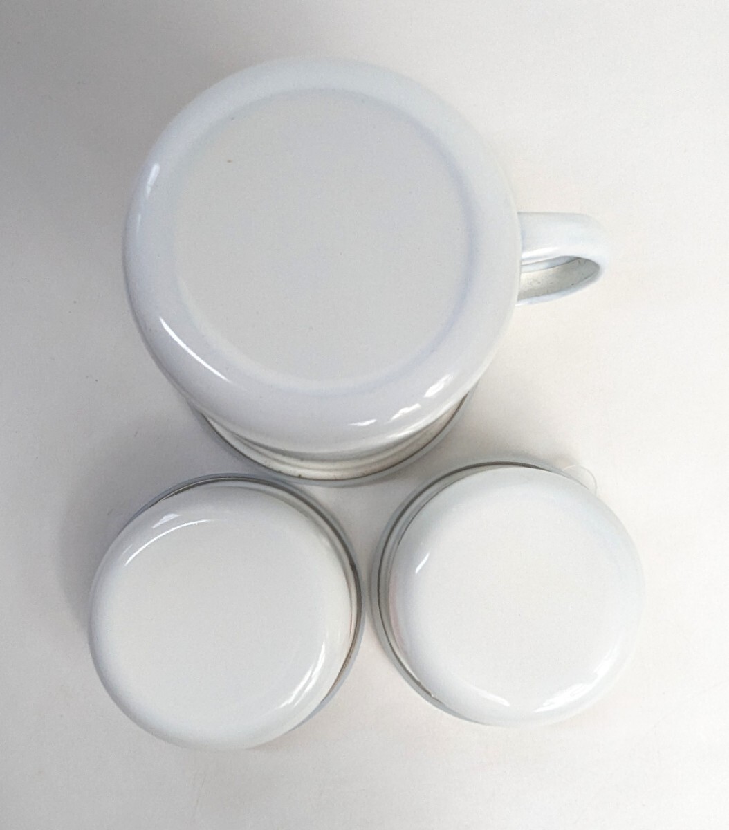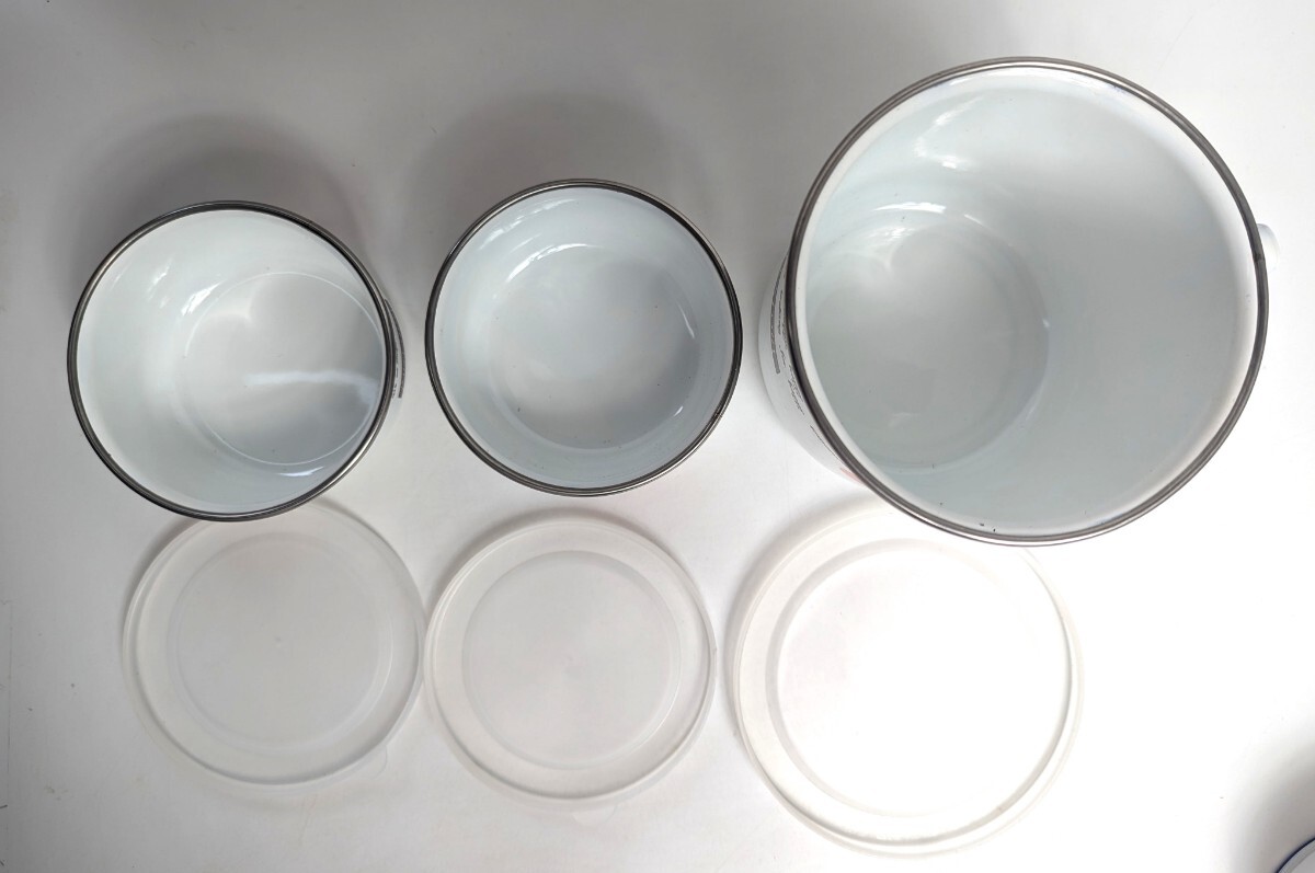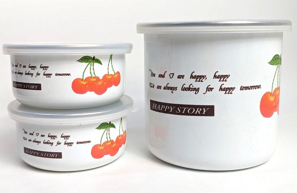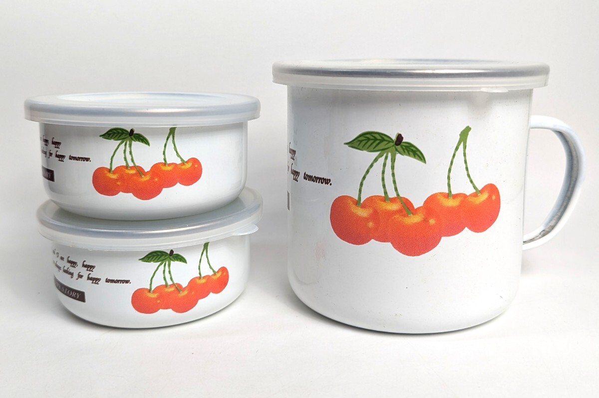 ホーロー 蓋付き 保存容器 3個セット チェリー柄 入れ子タイプ 大、持ち手付き(黒点があり) 直径12.3cm高さ11.1cm 小、2個 直径10cm高さ5cm (蓋含む)ぐらいです。未使用品です。小2個を大の中に入れて発送します。
