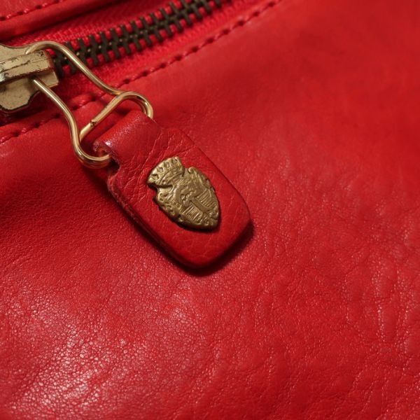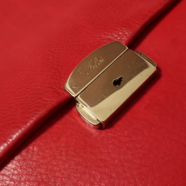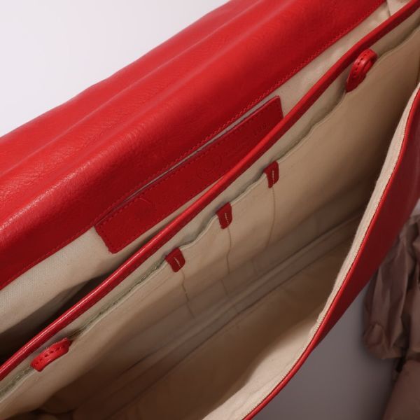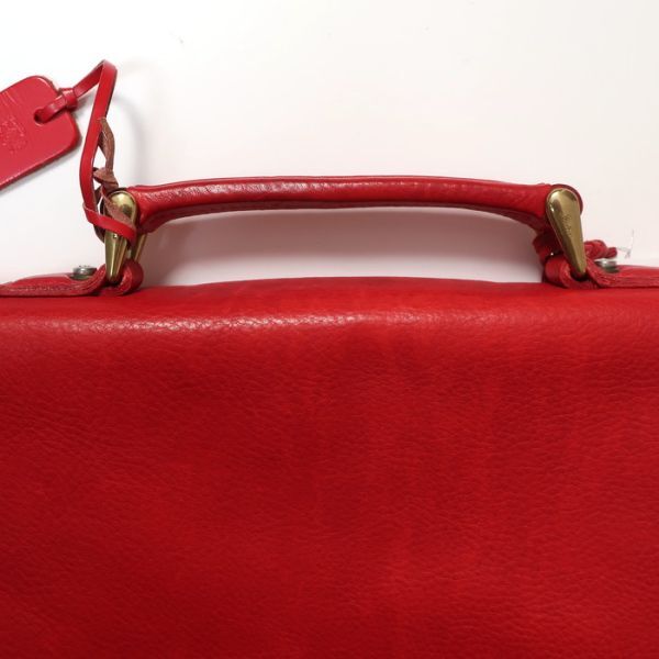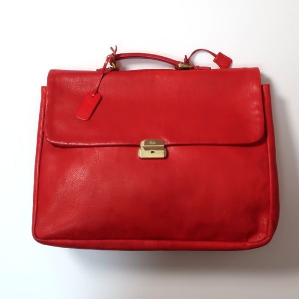 イタリアらしい上品なレッドを採用したブリーフケース。ゴールドの金具で開閉する点もエレガント。外側にジップポケット、内側にもポケットを完備しており、機能性も安心です。目立った使用感のない綺麗な状態です。ぜひお好きな方にお使いいただければ幸いです。