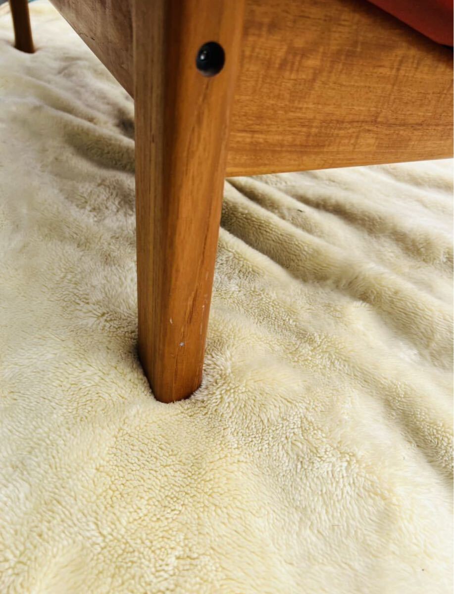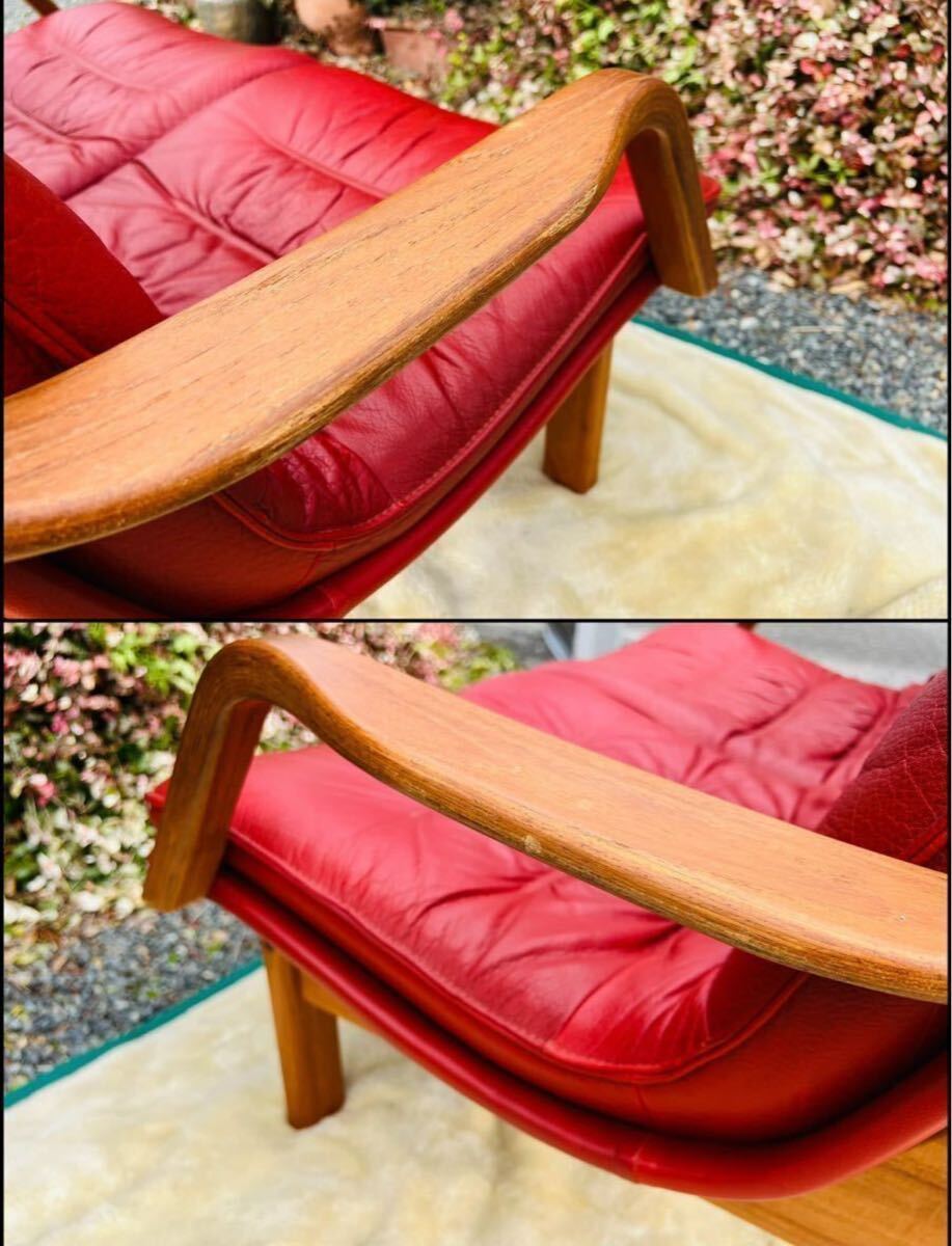 チークの暖かみのあるフレームに落ち着きのある赤色の座面が素敵なソファとなっております。