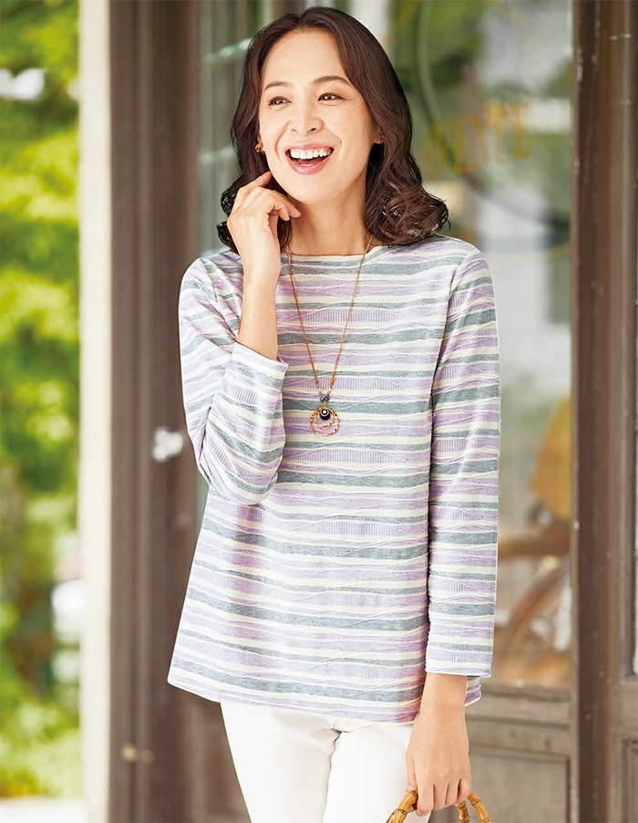 商品説明 | ・・春から夏までさらりと着られる綿混タックジャカードのボートネックプルオーバー ・特殊な紡績方法で彩りの良い杢調表現が特徴の「リバーエース」を使用して、色の重なりがきれいな表情豊かなタックジャカード ・一枚でも、インナーとしても活躍してくれるベーシックな7分袖のデザインで季節を越えて重宝するアイテム ・さらっとした綿混素材で着心地もやわらか |