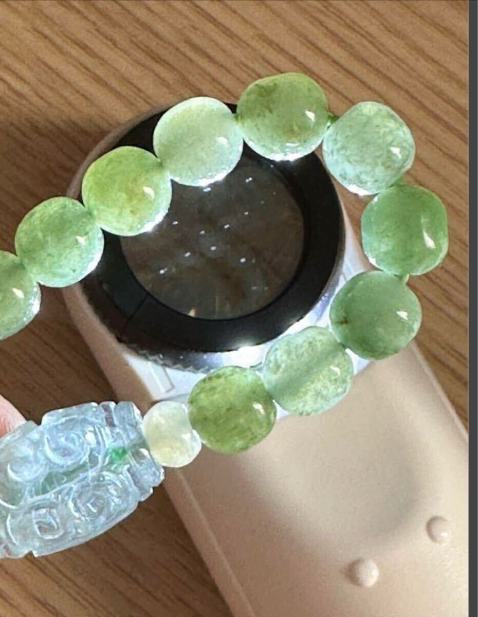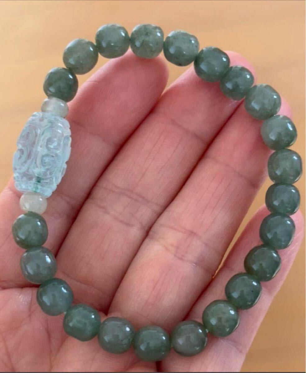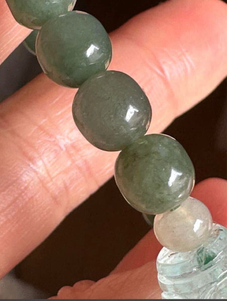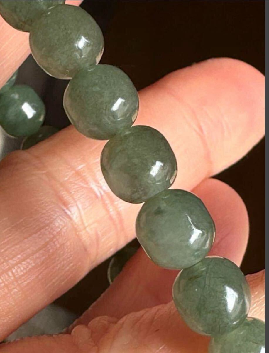 湖グリーンの楕円ぽい22粒と丸い白2粒のミャンマー本翡翠+1粒アクアマリンのブレスレットです。