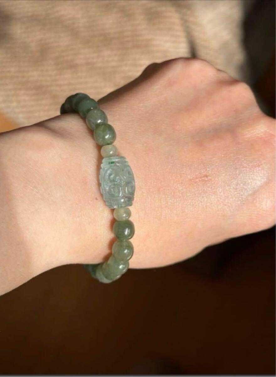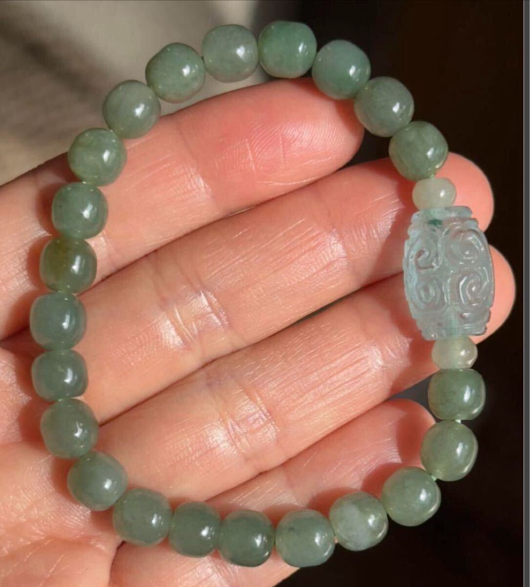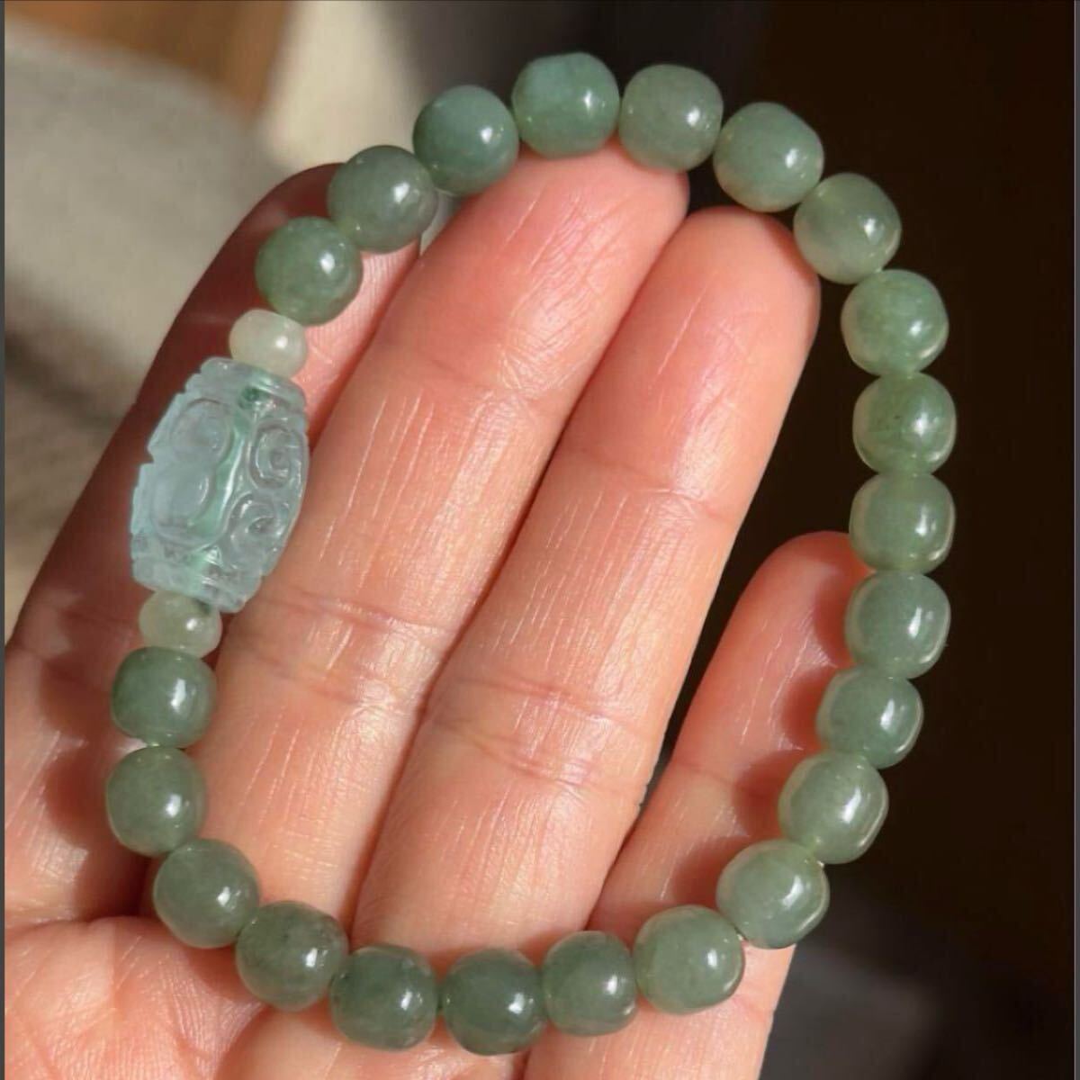 湖グリーンの楕円ぽい22粒と丸い白2粒のミャンマー本翡翠+1粒アクアマリンのブレスレットです。