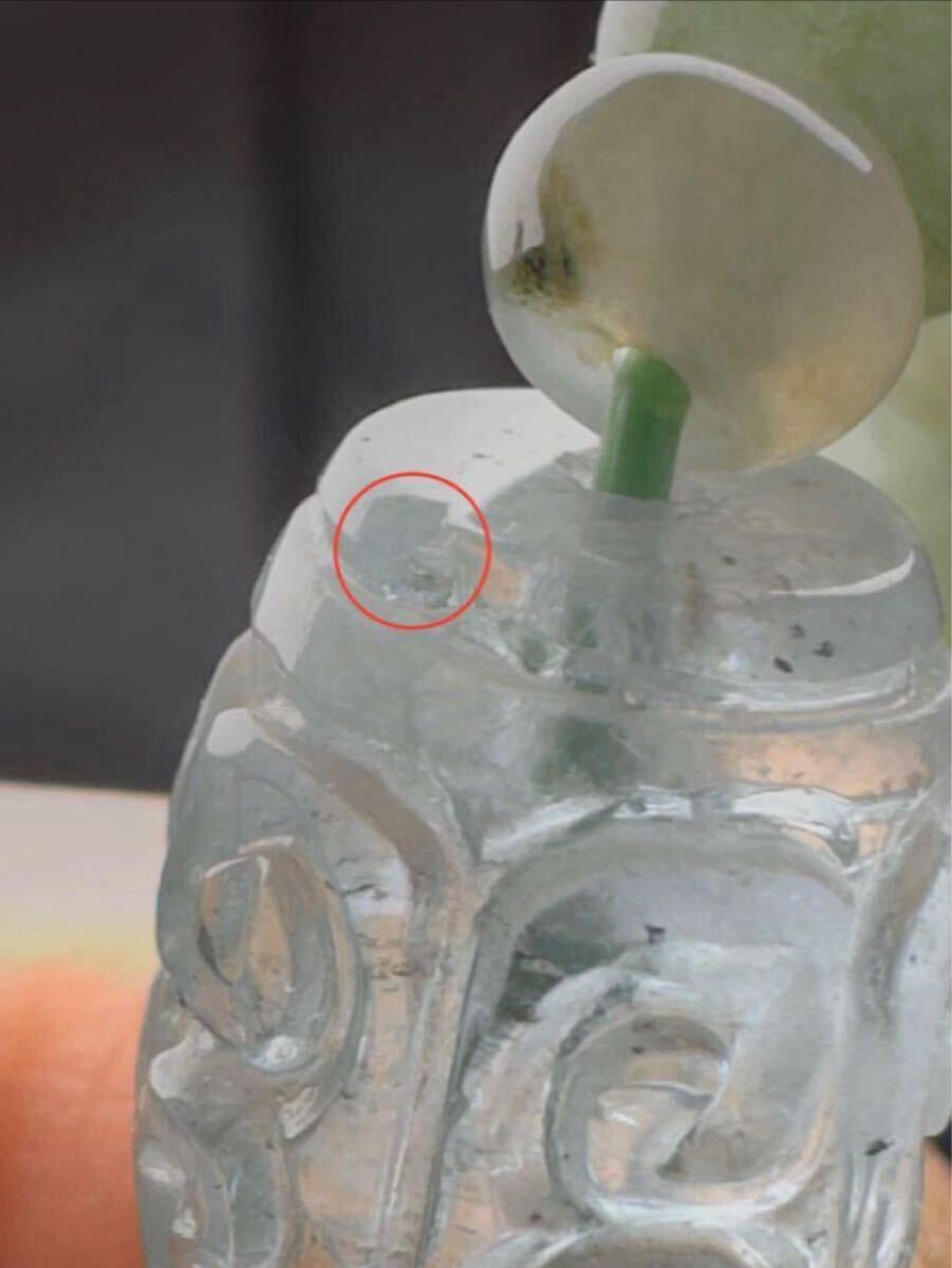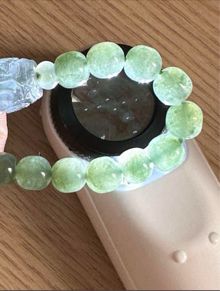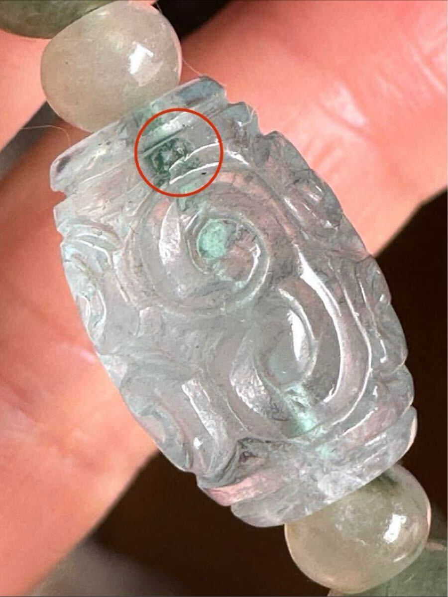 画像9の通り一箇所原石の結晶による出来てしまった欠けが有りますが、極大きく拡大しないと気がつかない程度です。また画像6にマーキングした箇所は(緑色)紐の色の写りで白の紐に交換してから出荷します。