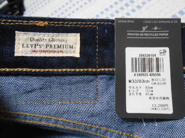新品!リーバイス プレミアム 512 ビッグE W33・L32 リンス 288330104 501XX 511 ワンウォッシュ 濃紺