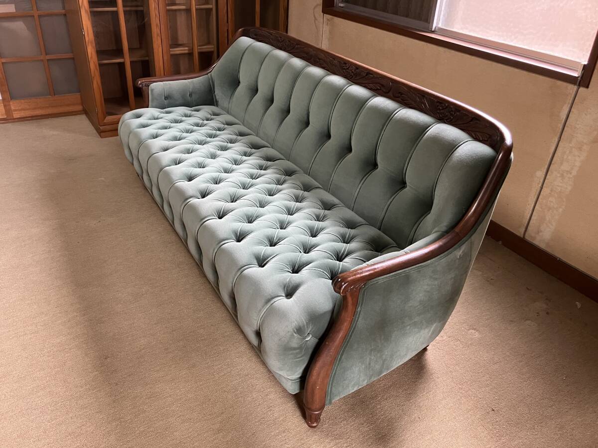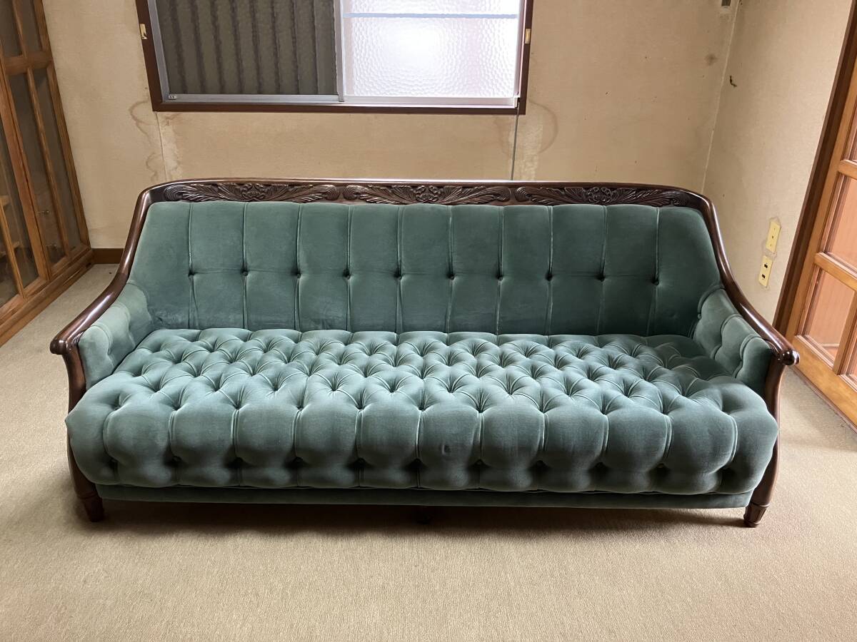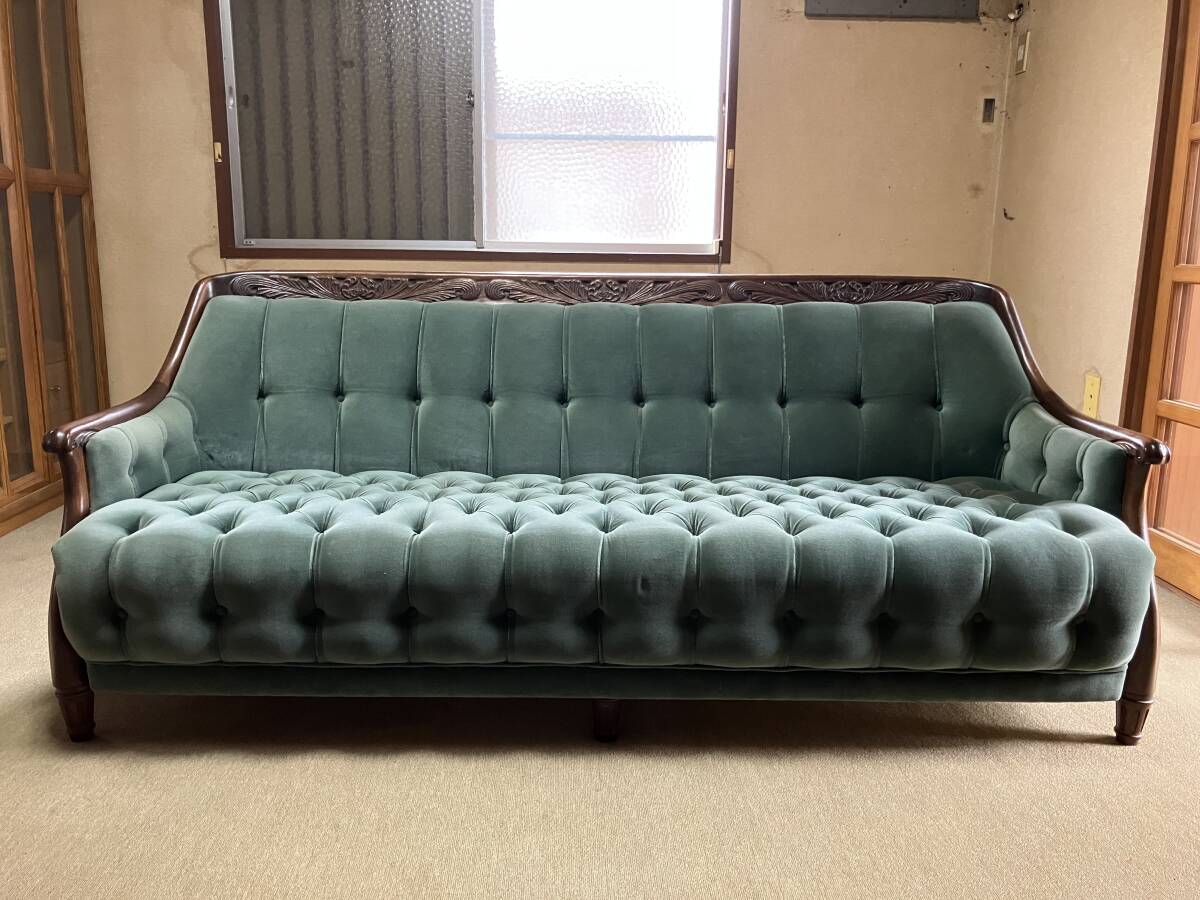 | マルニ木工 Maruni オールドマルニ 3人掛け ソファ アームチェア ベロア グリーン 鋲打ち 彫刻 高級 ヴィンテージ レトロ アンティーク調 |
