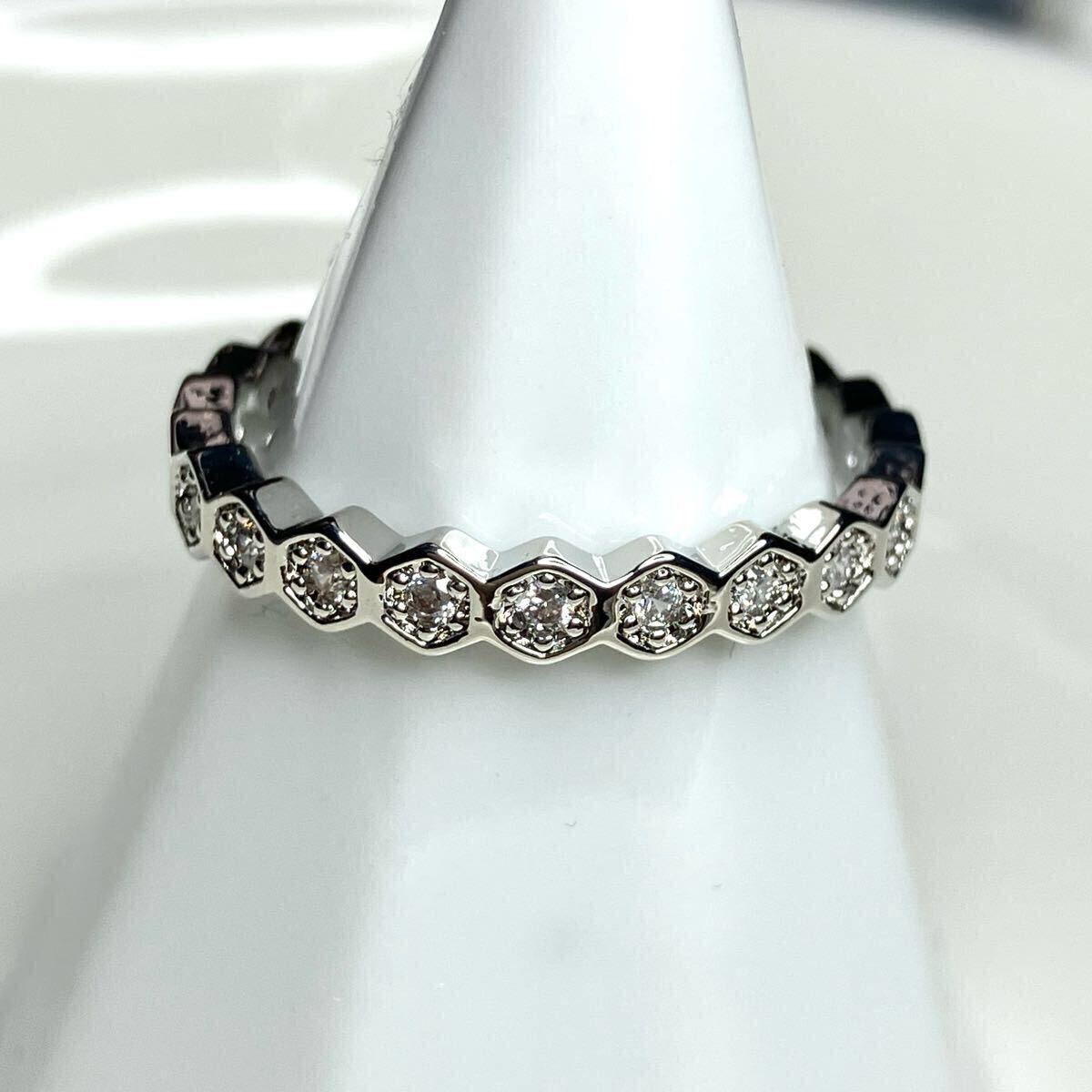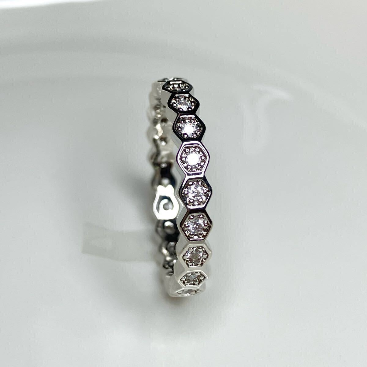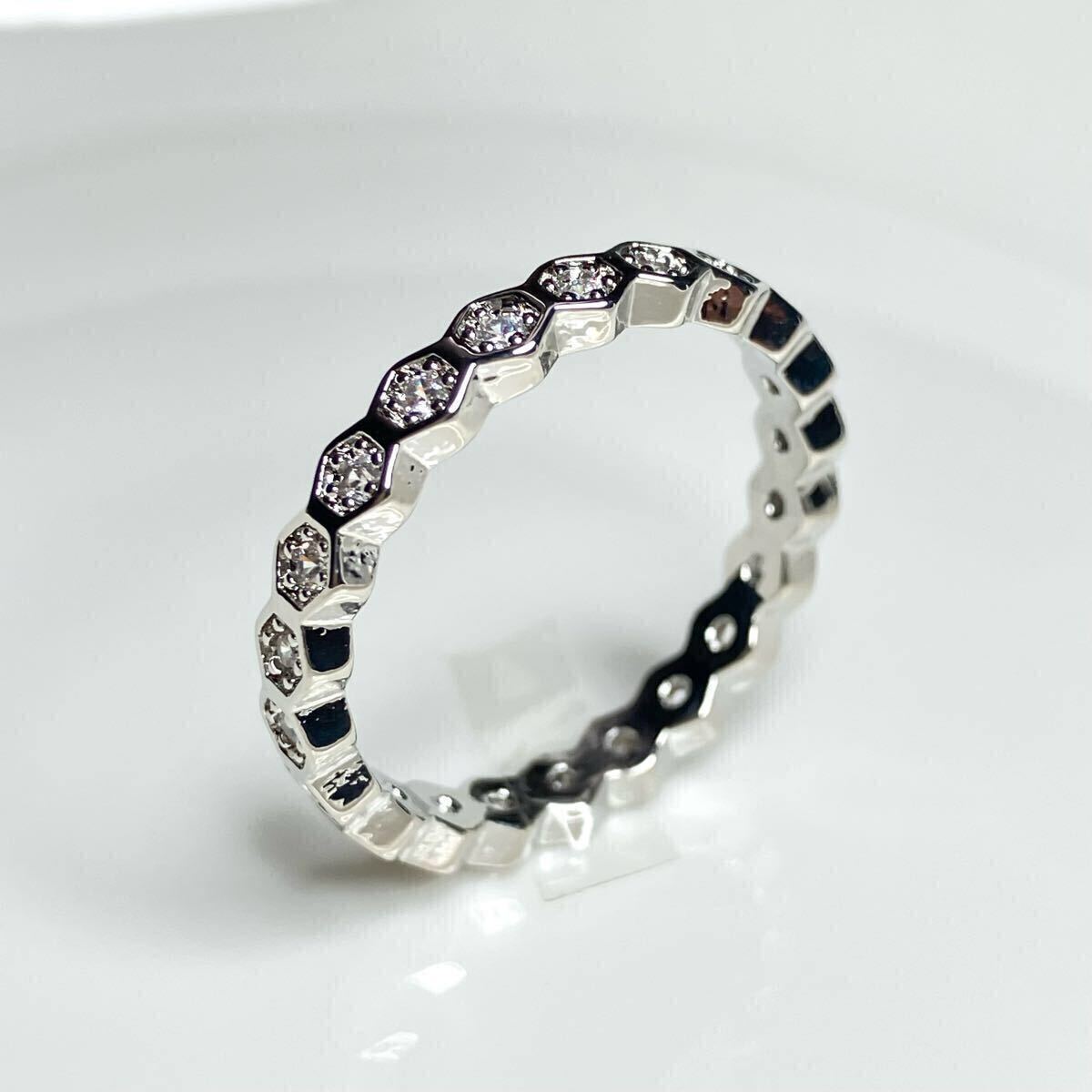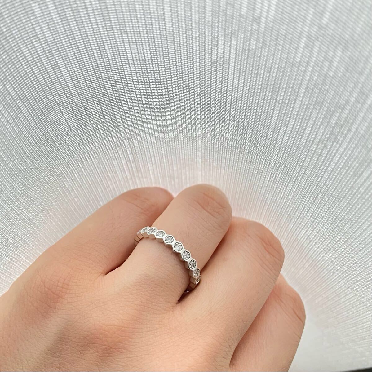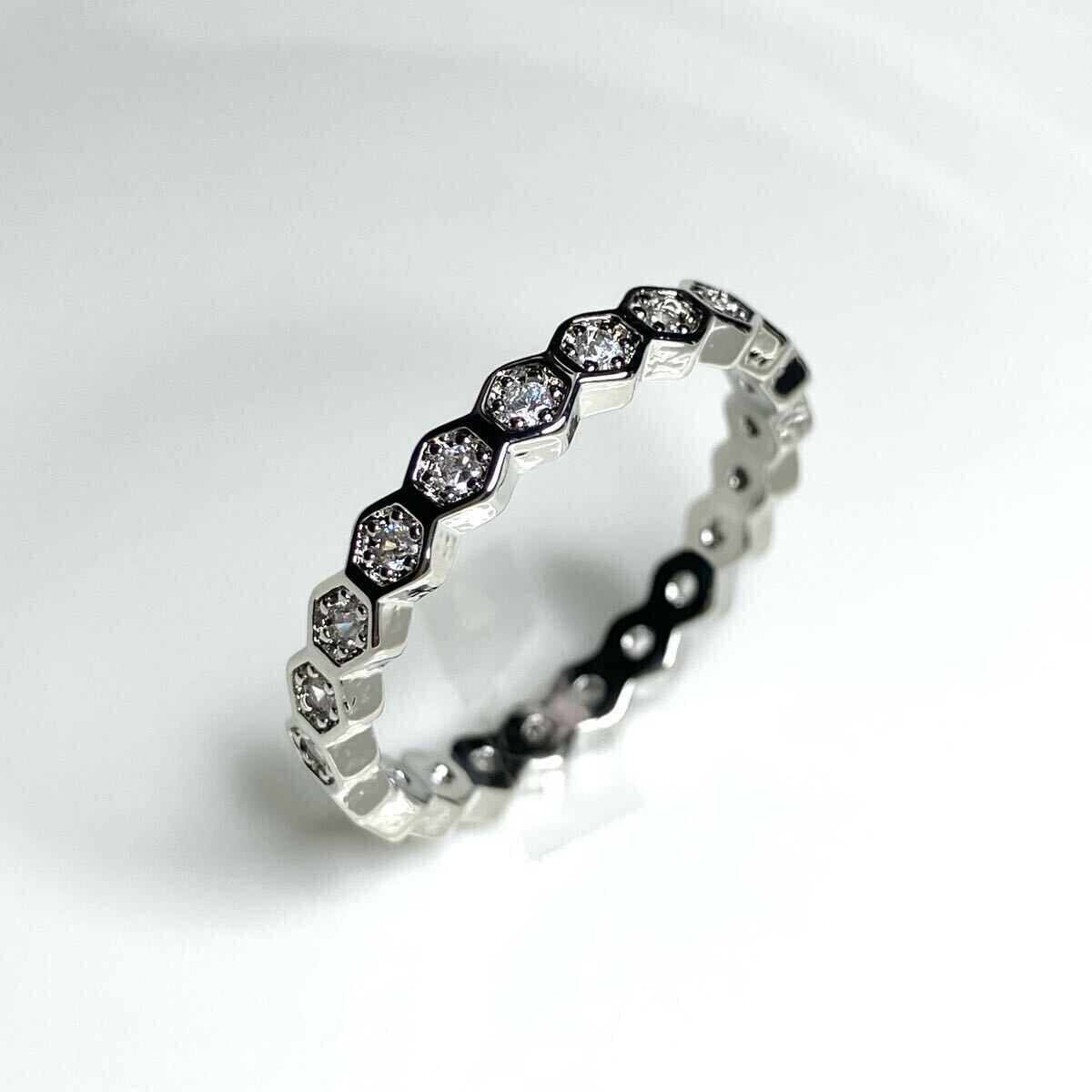 六角形のモチーフに、華やかな輝きを放つ直径2mmのCZダイアモンドを散りばめた、フルエタニティリングです。シンプルながら存在感のあるお品です。重ね付けにもおすすめです。