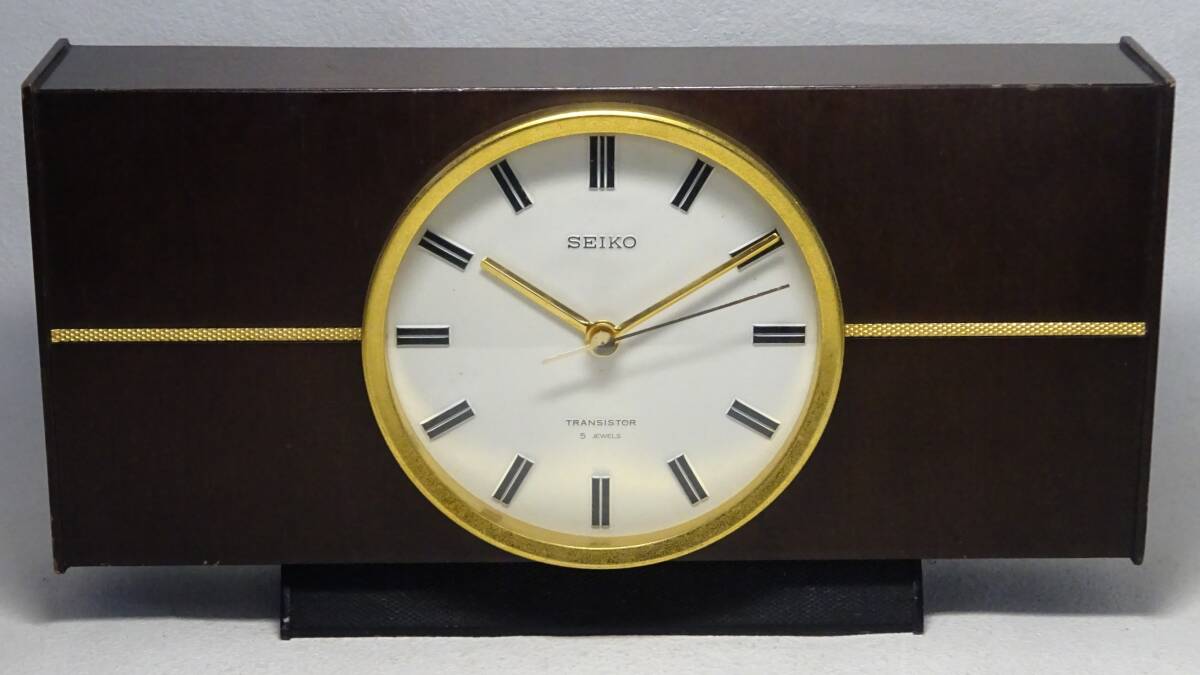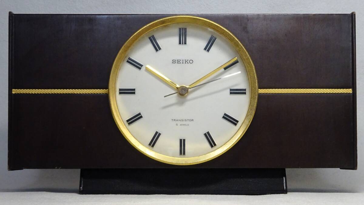 サイズ・幅:32cm 奥行:8cm 高さ:16.5cmアクセスいただきありがとうございます。この品は置き時計です。セイコーのトランジスタ時計です。シンプルながら高級感のある品です。電池を入れ半日ほど動作確認しました。赤いボタンを押すと動きます。ラベルを見るとS49年に修理しているようです。インテリアにお薦めです。経年による使用感・汚れがあるので、写真を参考にして下さい。中古品とご理解の上でNC・NRでお願いします。出来るだけ迅速な対応を心掛けますが、仕事上連絡が遅くなる場合もあるのでご了承下さい。