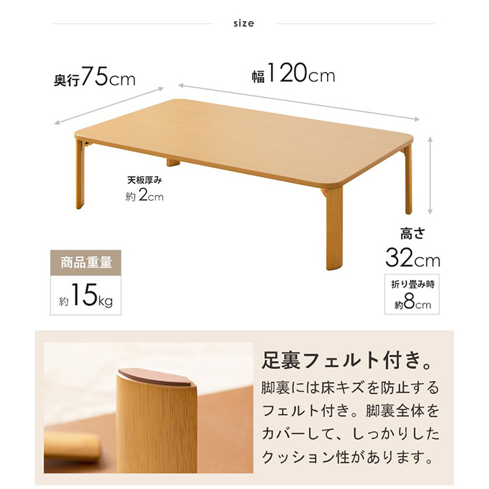 仕様:耐荷重:天板約15kg、脚部折りたたみ式、脚裏クッション付き