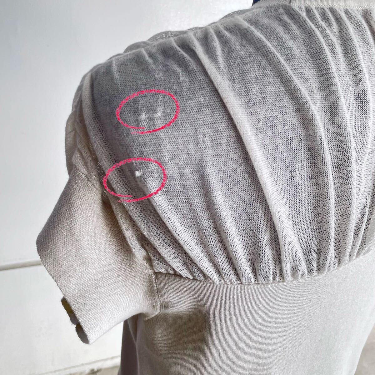 バストより下はストレッチ糸をいれながらハリ感の出る編地で編みたて、肩周りは軽さの出る天竺編みでギャザーを入れています。上下対比のある編地使いがキーポイントになります。フレンチスリーブのように軽く肩を覆うデザインで、春を思わせるエアリーインナーです。