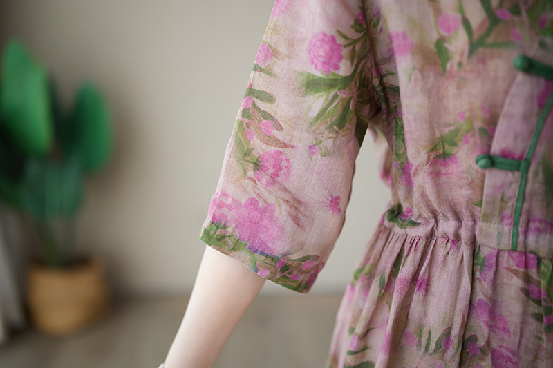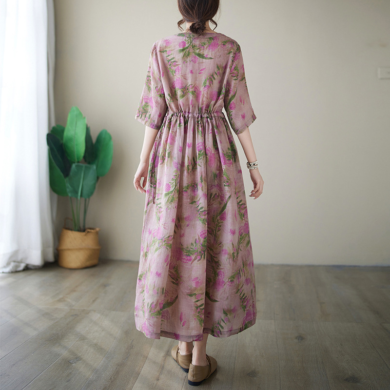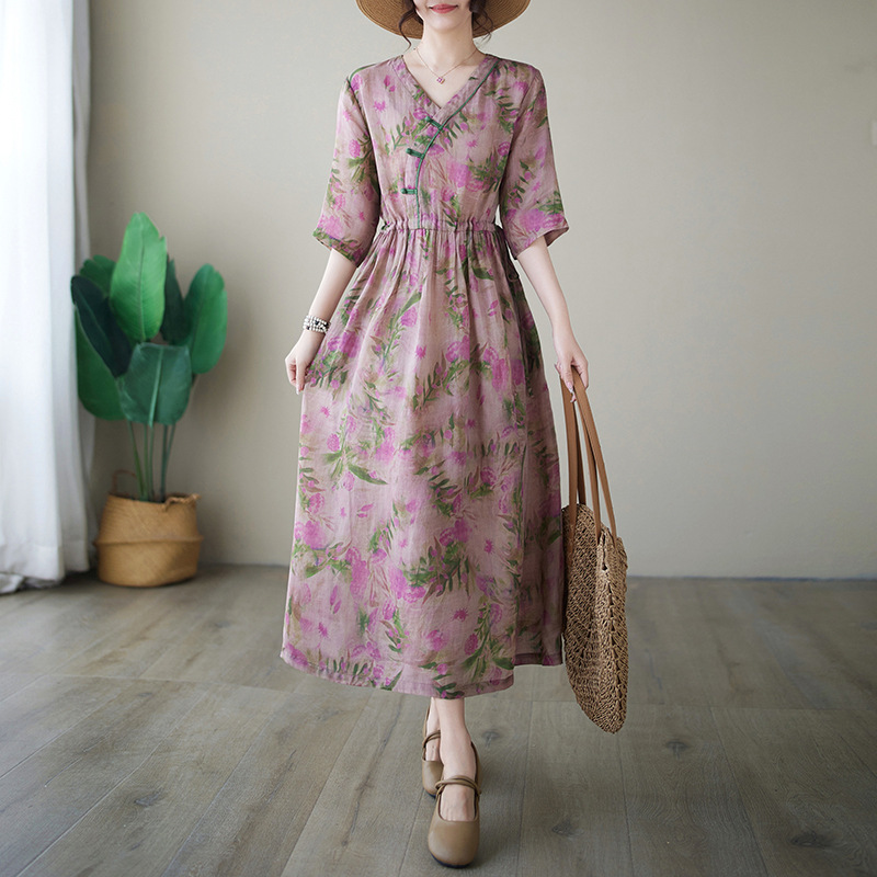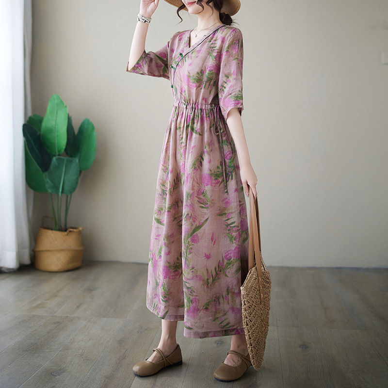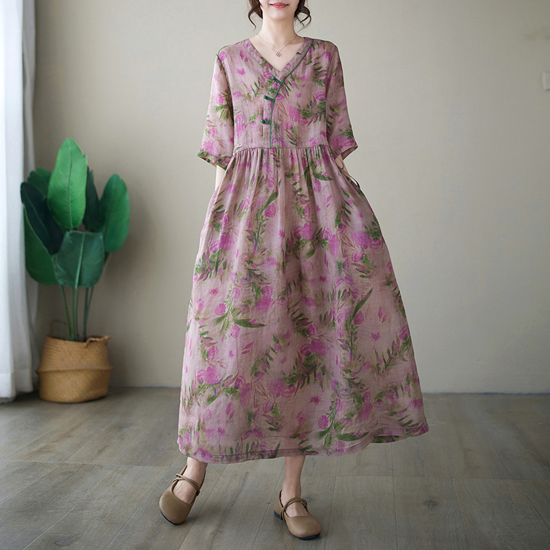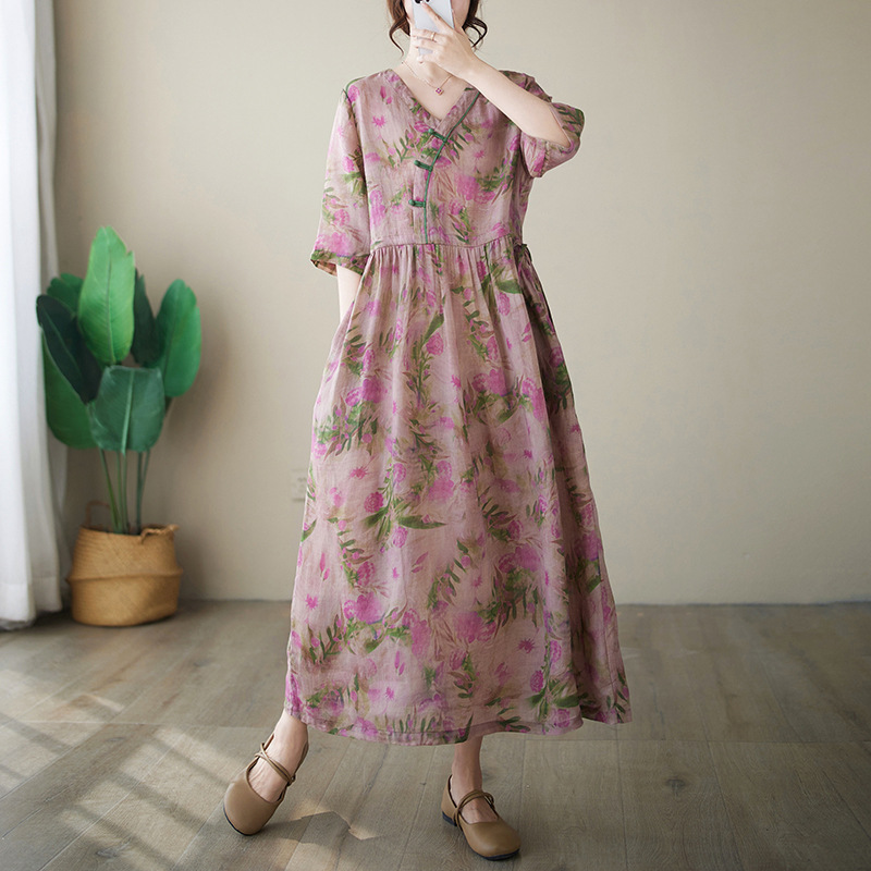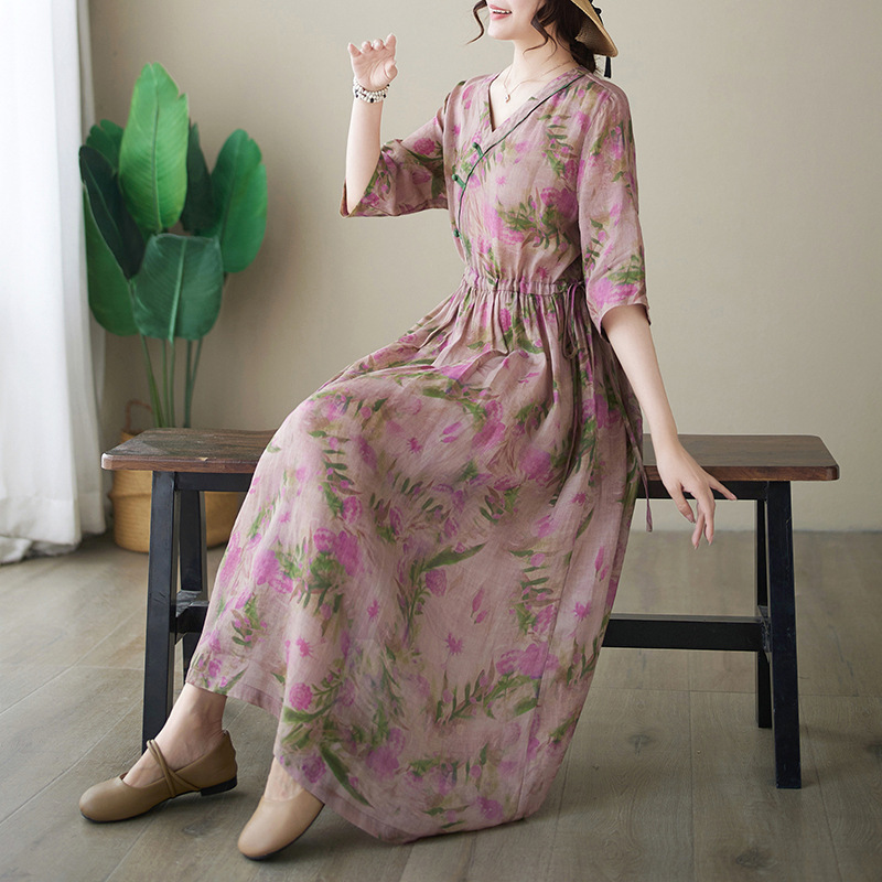 「同梱1万円送料無料」花柄ワンピースレディース着痩せ Vネック半袖 大きいサイズ 通勤 OL ロ ングワンピース プリント柄 切り替え 復古風