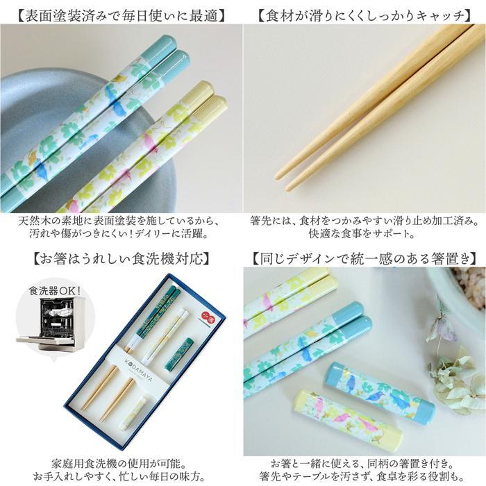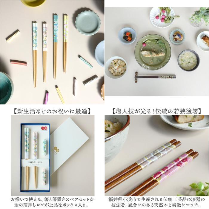 | 商品説明 | ・・【毎日の食卓をもっと豊かに】 ・おしゃれにテーブルコーディネート♪「KODAMAYA ペアギフト 箸2膳と箸置き2個」。 ・【新生活などのお祝いに最適】 ・お揃いで使える、箸と箸置きのペアセット☆金の箔押しロゴが上品なボックス入り。 ・【職人技が光る!伝統の若狭塗箸】 ・福井県小浜市で生産される伝統工芸品の漆器の技法を。風合いのある天然木と素敵にマッチ。 ・【表面塗装済みで毎日使いに最適】 ・天然木の素地に表面塗装を施しているから、汚れや傷がつきにくい!デイリーに活躍。 ・【食材が滑りにくくしっかりキャッチ】 ・箸先には、食材をつかみやすい滑り止め加工済み。快適な食事をサポート。 ・【お箸はうれしい食洗機対応】 ・家庭用食洗機の使用が可能。お手入れしやすく、忙しい毎日の味方。 ・【同じデザインで統一感のある箸置き】 ・お箸と一緒に使える、同柄の箸置き付き。箸先やテーブルを汚さず、食卓を彩る役割も。 ・【食卓に映えるおしゃれなデザイン】 ・植物や小鳥など、それぞれ印象の異なるデザインをラインナップ。お気に入りをチョイス! ・【箸の魅力を伝えるKODAMAYA】 ・自然の息吹がこだまする福井県小浜市から伝統の職人技と想いをのせて、若狭塗の魅力をお届け。 |