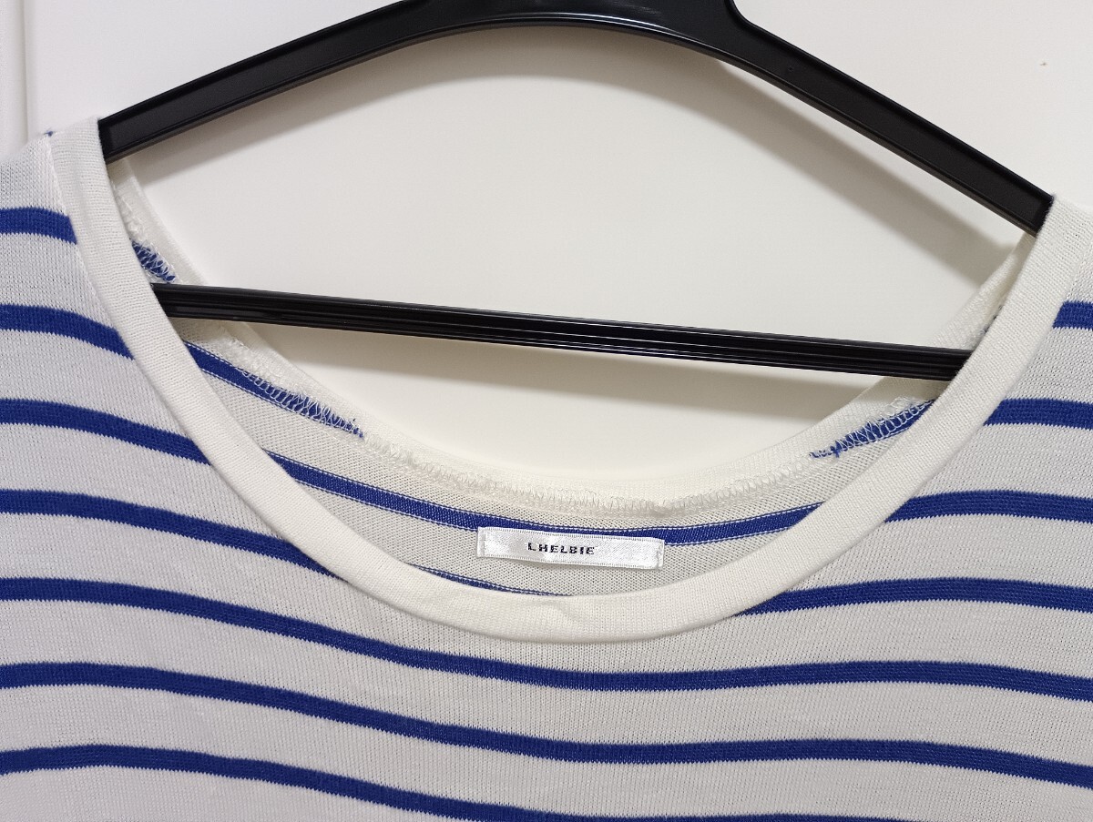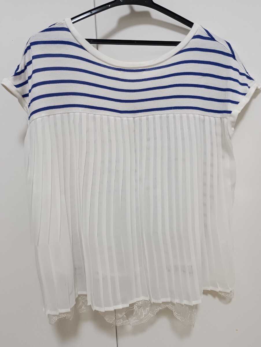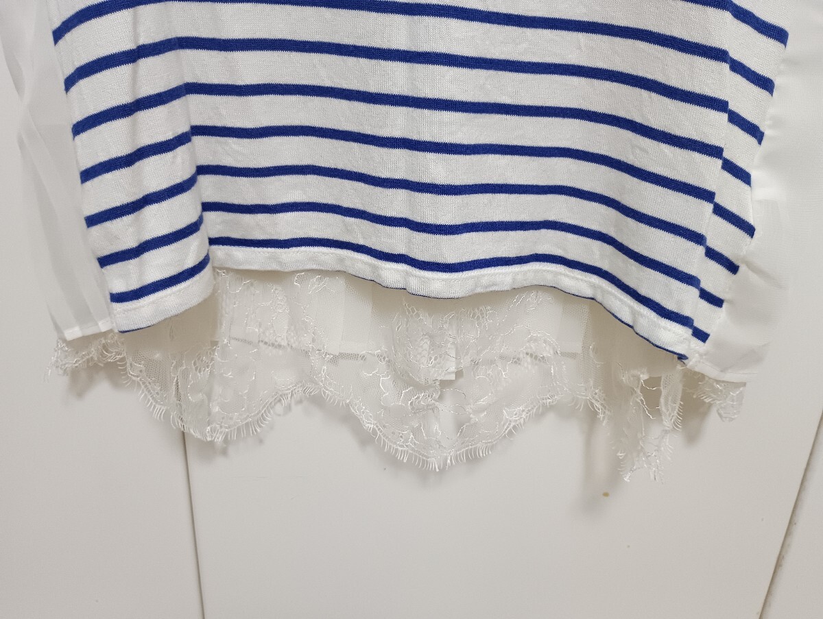 LHELBIE ブルー&白色ボーダーのトップスです。後ろはレース2枚ドッキングしてます。フリーサイズです。サイズは着丈約54cm、身幅約45cmです。