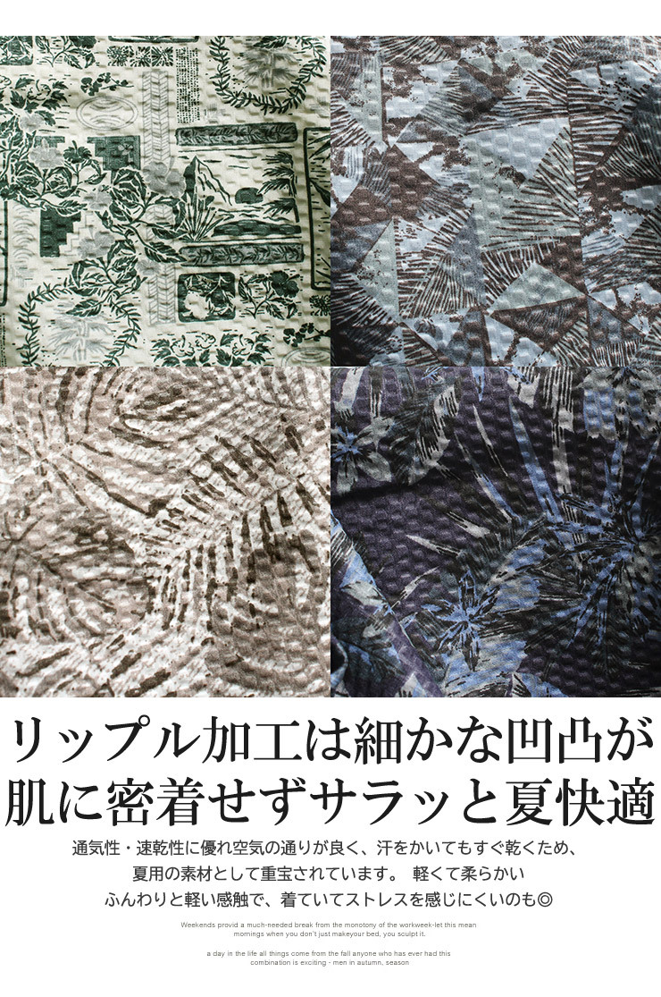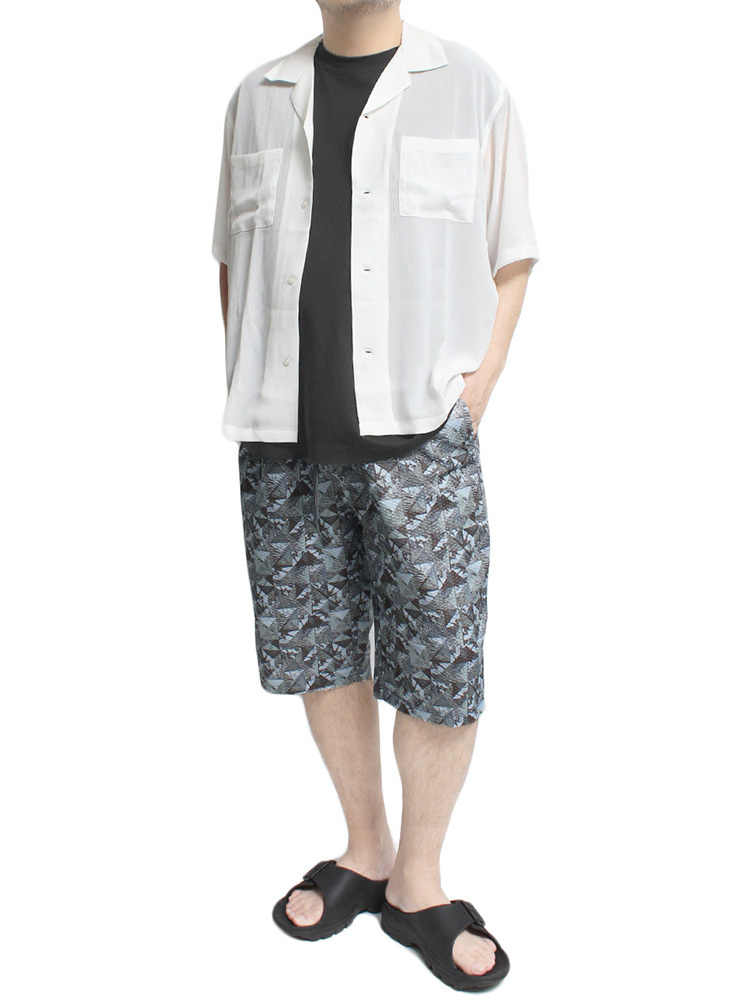 商品説明 | 表面にさざ波のような細かい凹凸(シボ感)が特徴のライトリップル素材を使用した、膝下丈のショートパンツ。 |