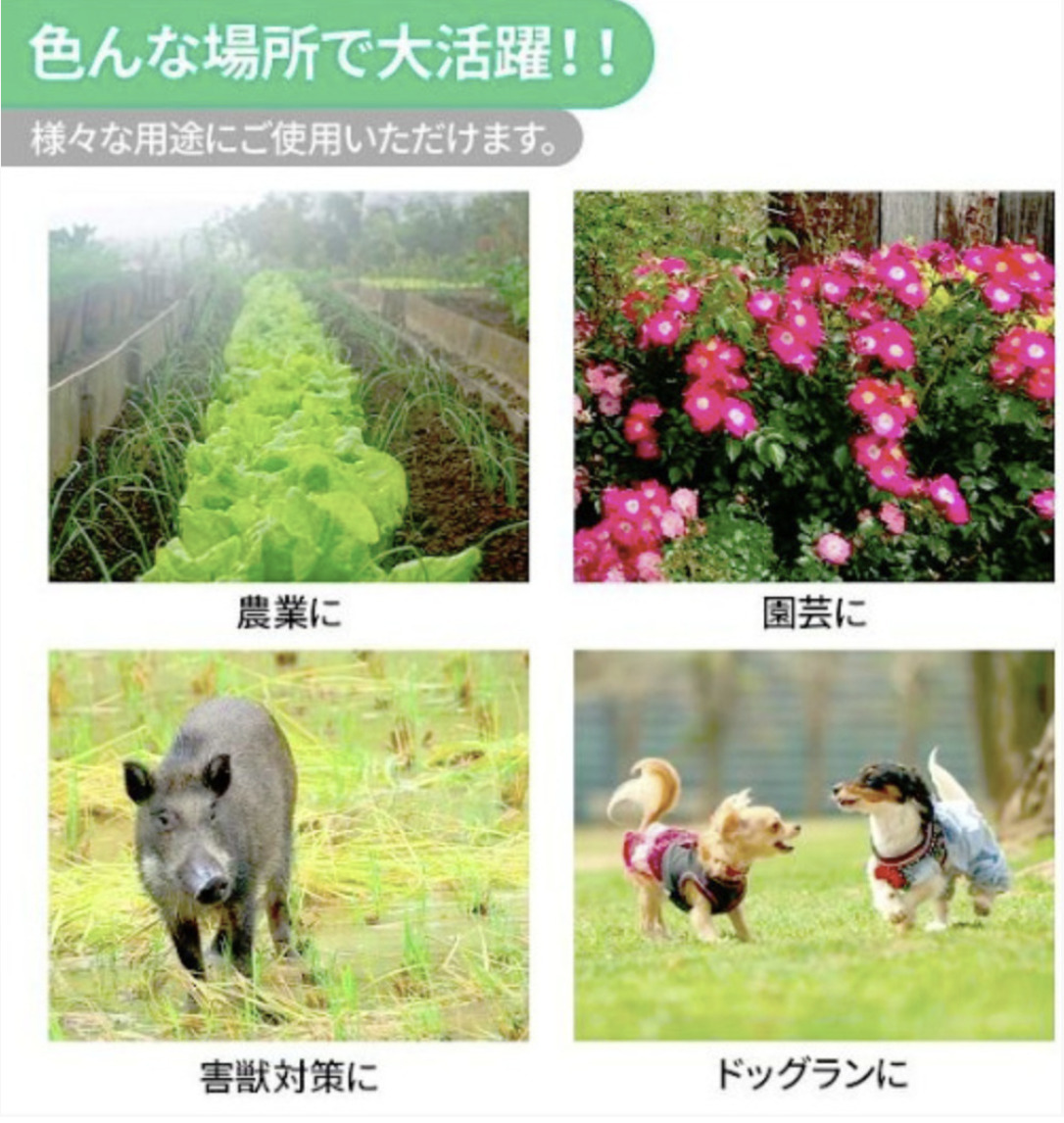 害獣対策だけでなく、ドッグラン (逃走防止) や 駐車場 (境界区分)、 管理地 (出入り禁止区分)などにもご使用頂けます。