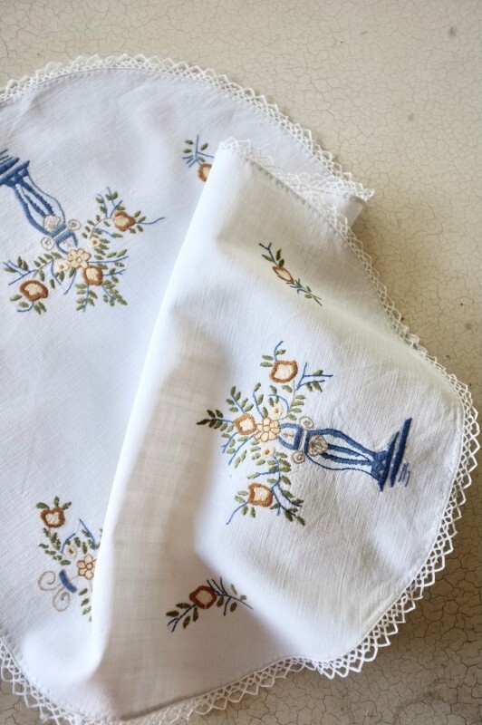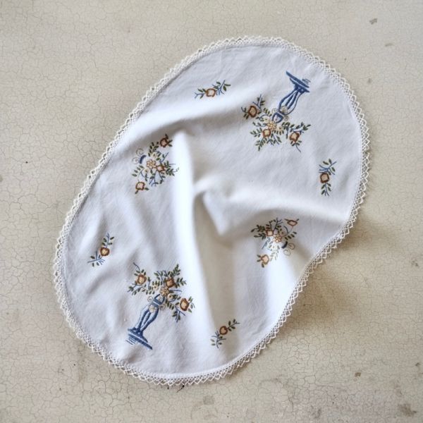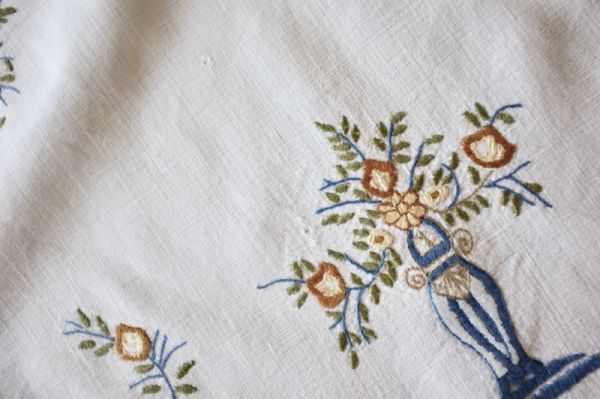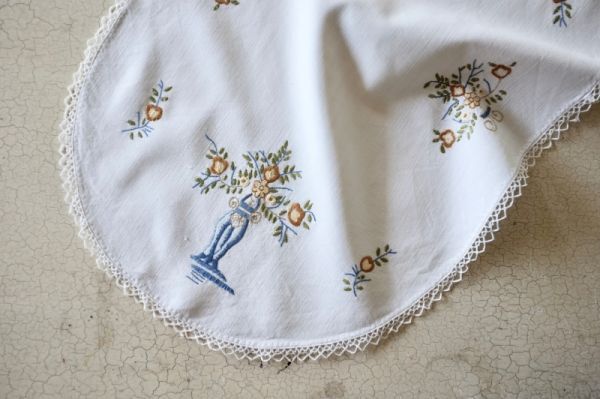 フランス 65c 手刺繍手縫 リネン 青の花瓶とカフェオレ花とテーブルセンター アンティーク 刺繍 麻 ヴィンテージ レース ハンドメイド