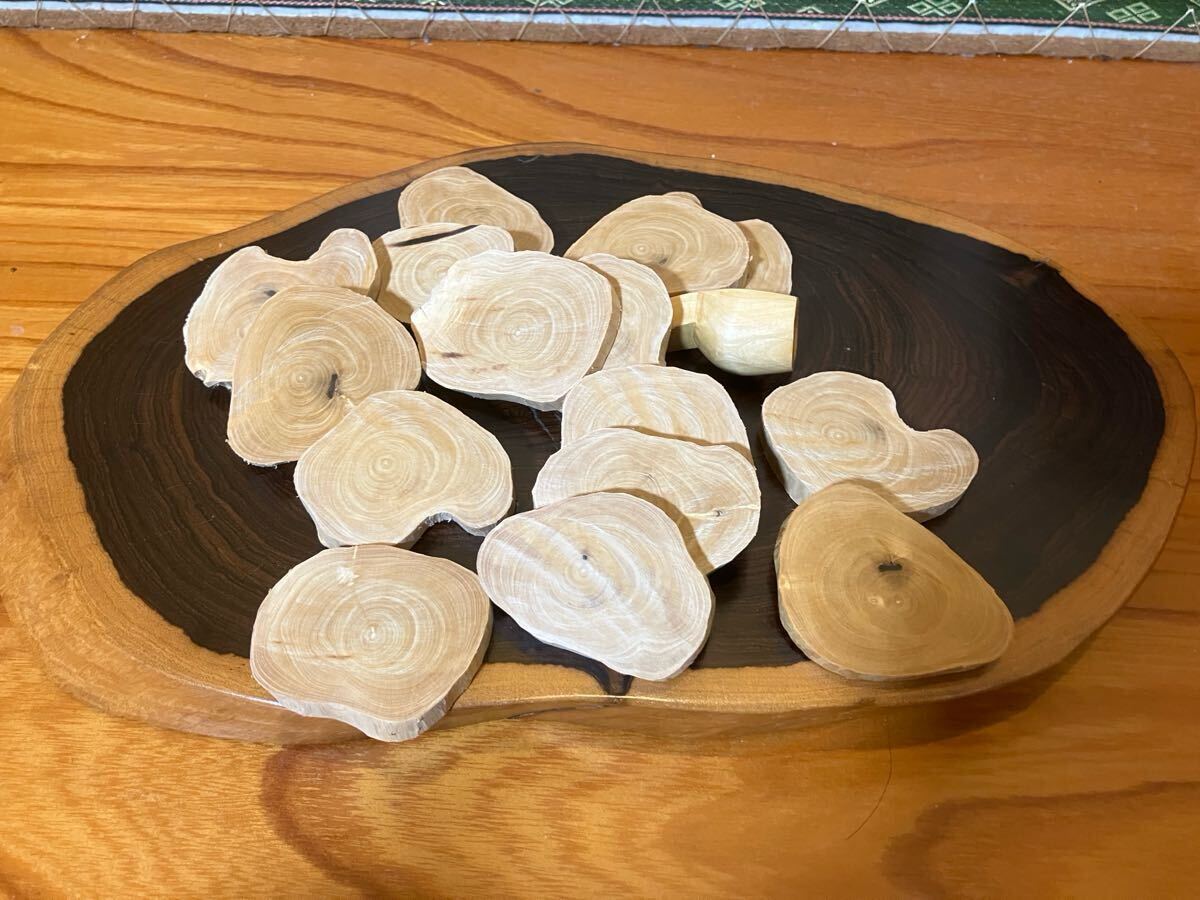 採取場所は、非常に痩せた土地でまた、丘陵地であり、他高木等隣接自生し陽当たも悪い環境等特殊な環境下で自生していたゲッキツは、成長が極端に遅くなり結果、非常に緻密な年輪を形成し、印鑑材のツゲとほぼ変わらない硬度を持っております。