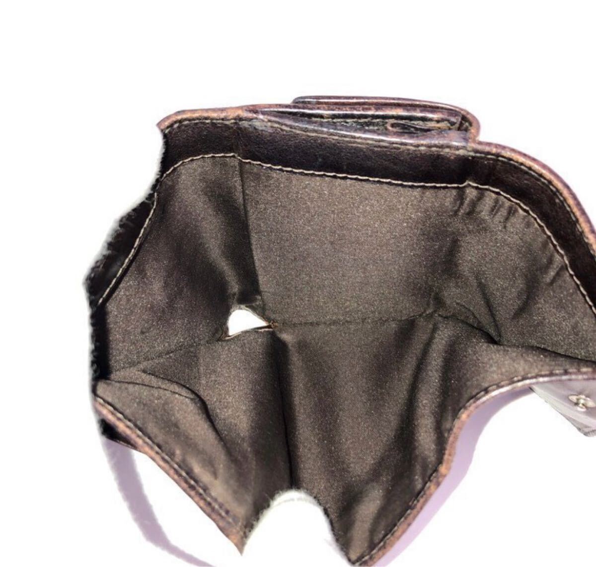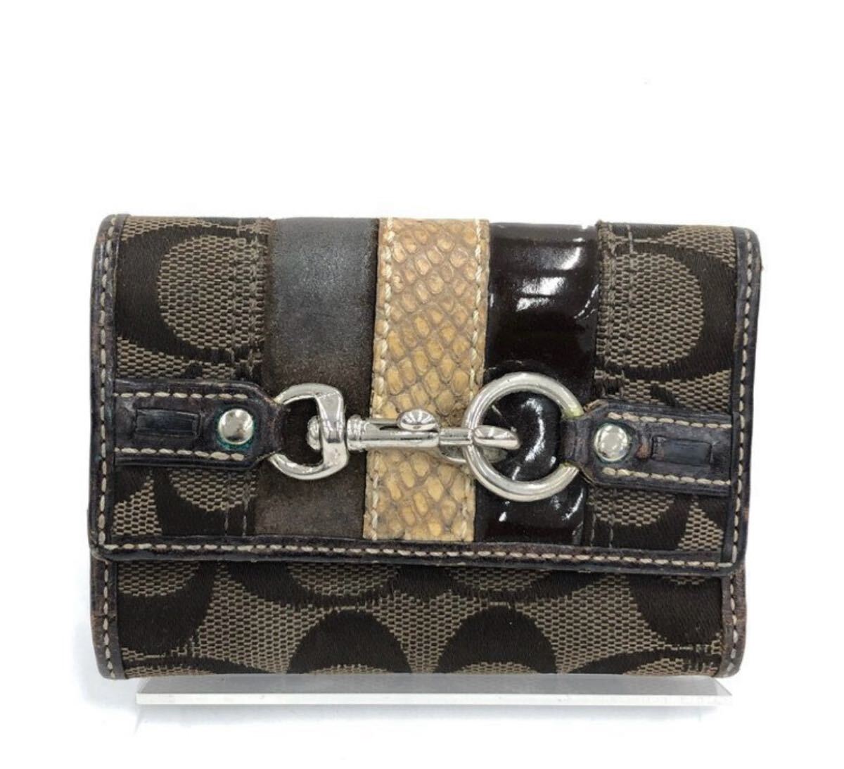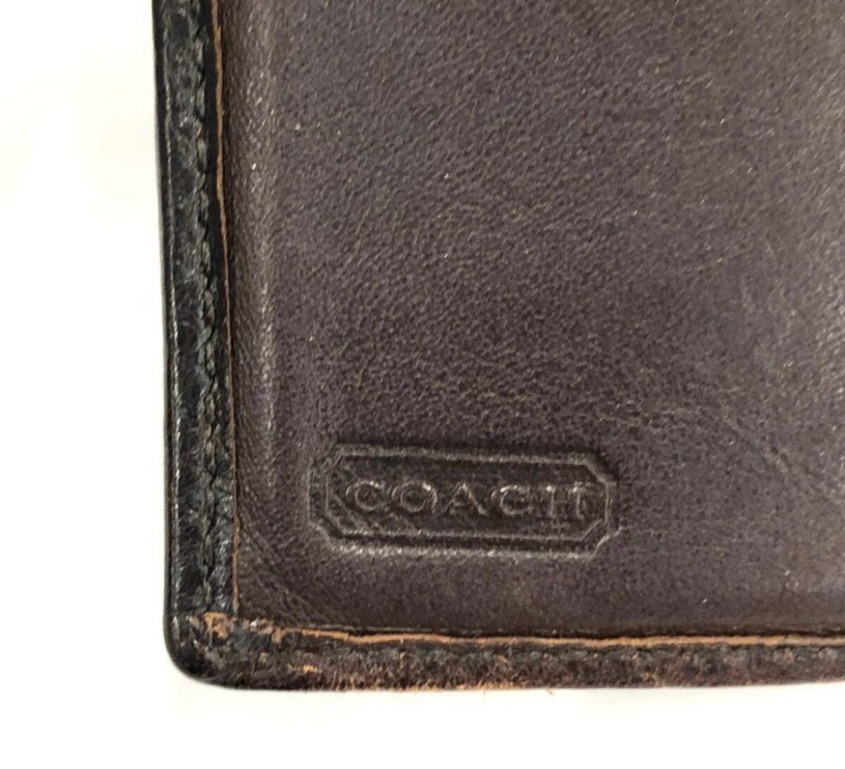 コーチのロゴが特徴的な三つ折り財布、キャンバスとレザーのコンビネーションで耐久性も抜群。