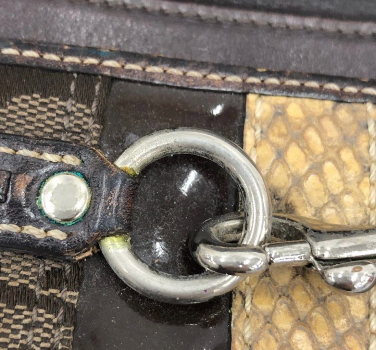- 特徴: シルバーの金具と蛇柄のアクセント