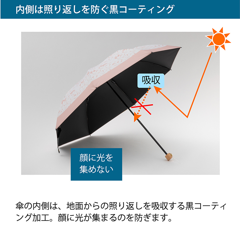 内側はブラックで地面からの照り返しを吸収し、顔への照りの集中を防ぎます。