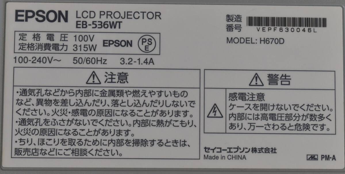 1円スタート EPSON リモコン付き プロジェクター EB-536WT 3400lm WXGA 3.7kg 3LCD方式 HDMI パネル画素数1280x800【使用時間:1059h】