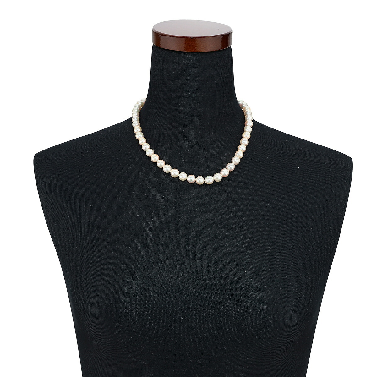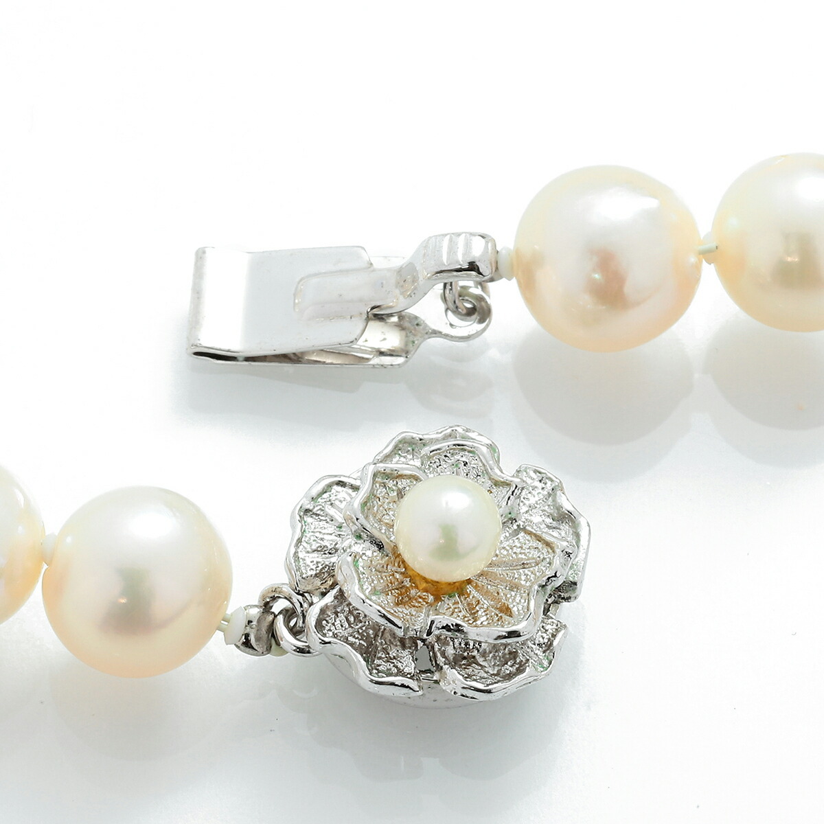 鮮やかな光沢が美しい真珠を一粒一粒丁寧に連ねたネックレス。クラスプには優美なフラワーモチーフを添え、細部にまで気品を宿すデザインに仕上げました。セレモニーや華やかな集いの場に、静かに寄り添いながらも、そっと存在感を添えてくれます。