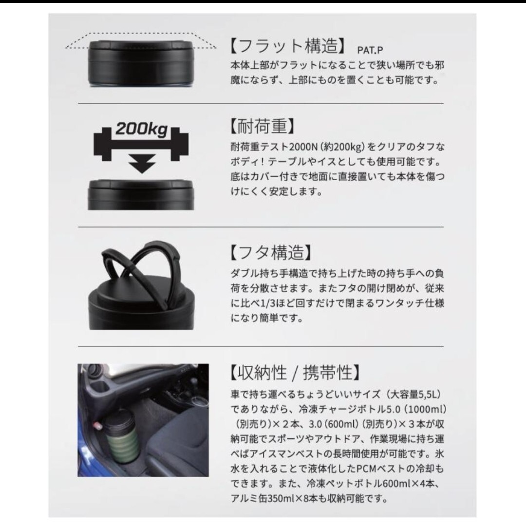 ◆車で持ち運べるちょうどいいサイズでありながら、冷凍チャージボトル5.0(1000ml)(別売り)×2本、冷凍チャージボトル3.0(600ml)(別売り)×3本が収納可能でスポーツやアウトドア、作業現場に持ち運べばアイスマンベストの長時間使用が可能です。