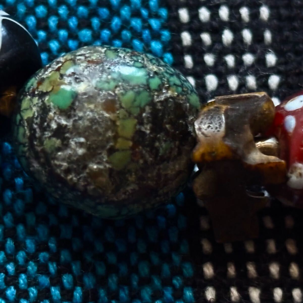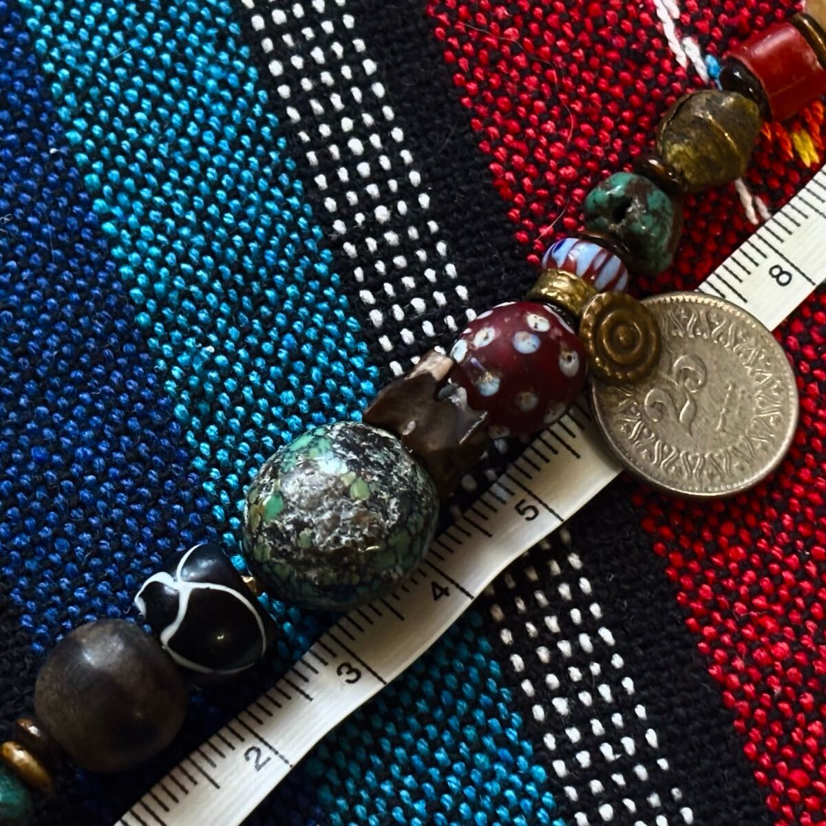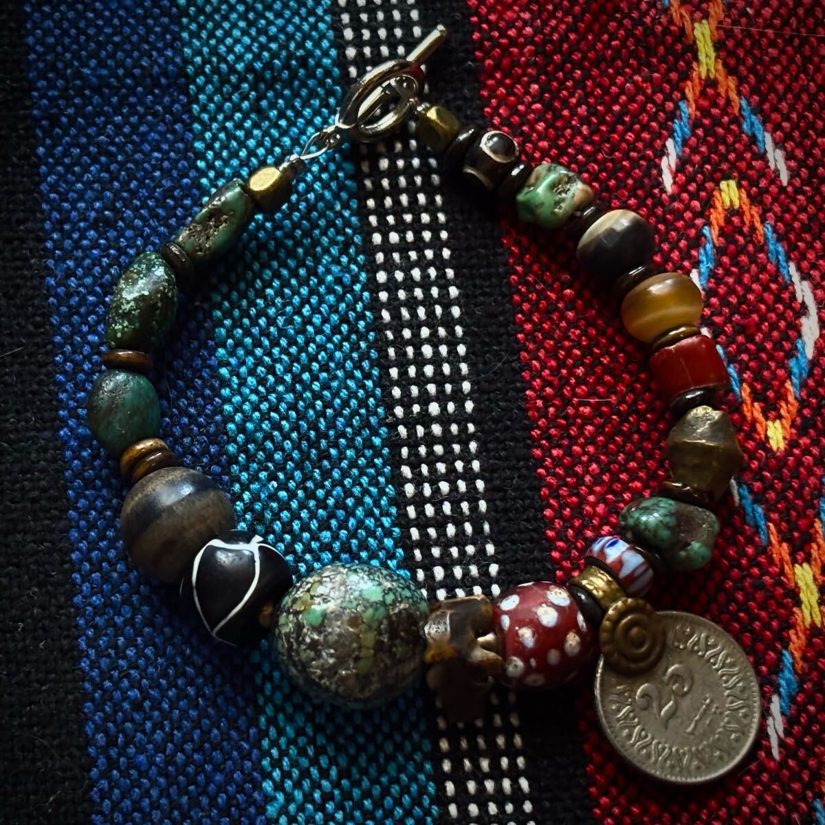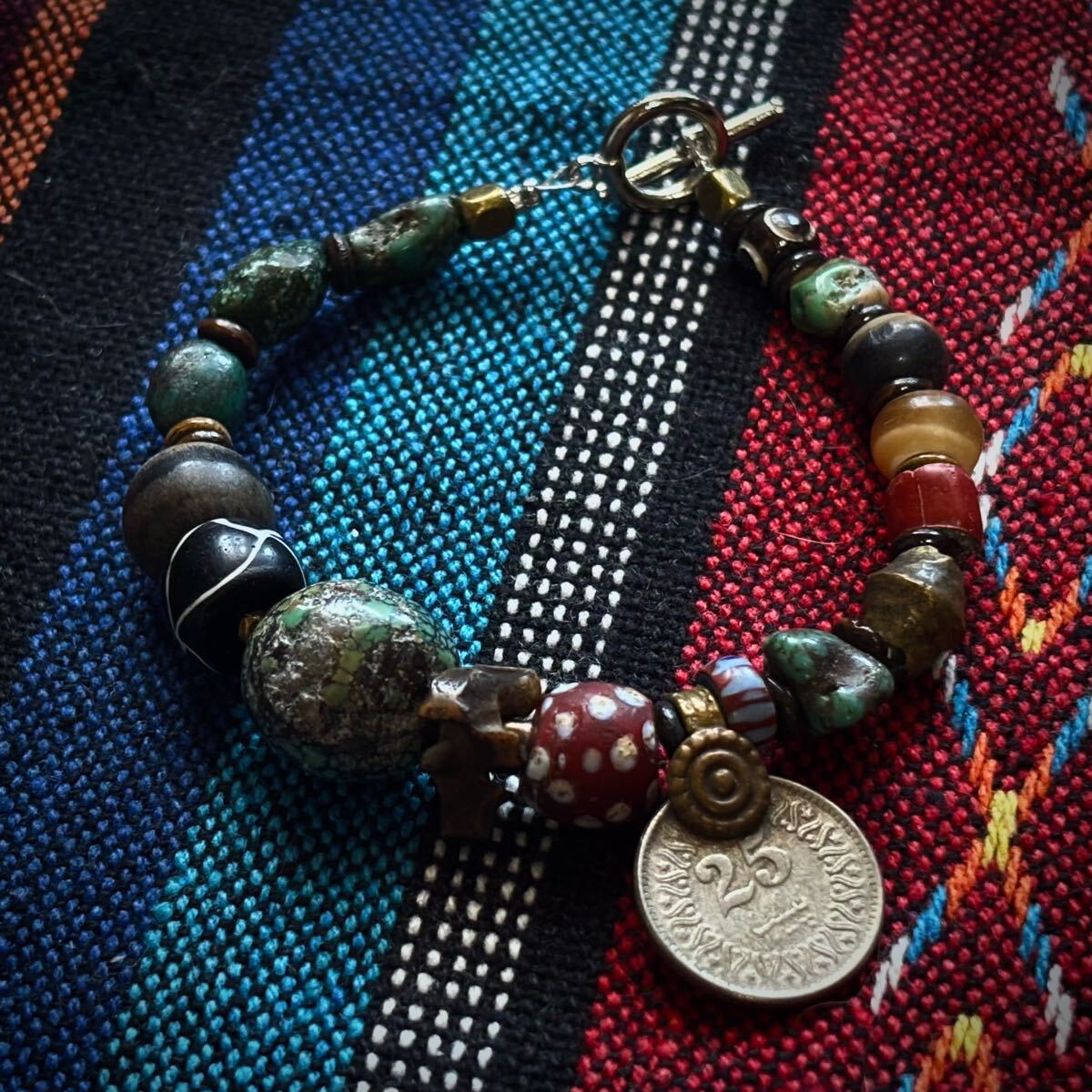 アンティークの古いチベタンターコイズ、1800-1900年初期にヴェネチアで作られたスカンク、アワラシェブロン、グリーンハーツ、ラトルスネイク、アフリカの古い蛇骨、水牛の角、エチオピアンブラス、アフガニスタンのクチ族のコインチャームを繋いだブレスレットです