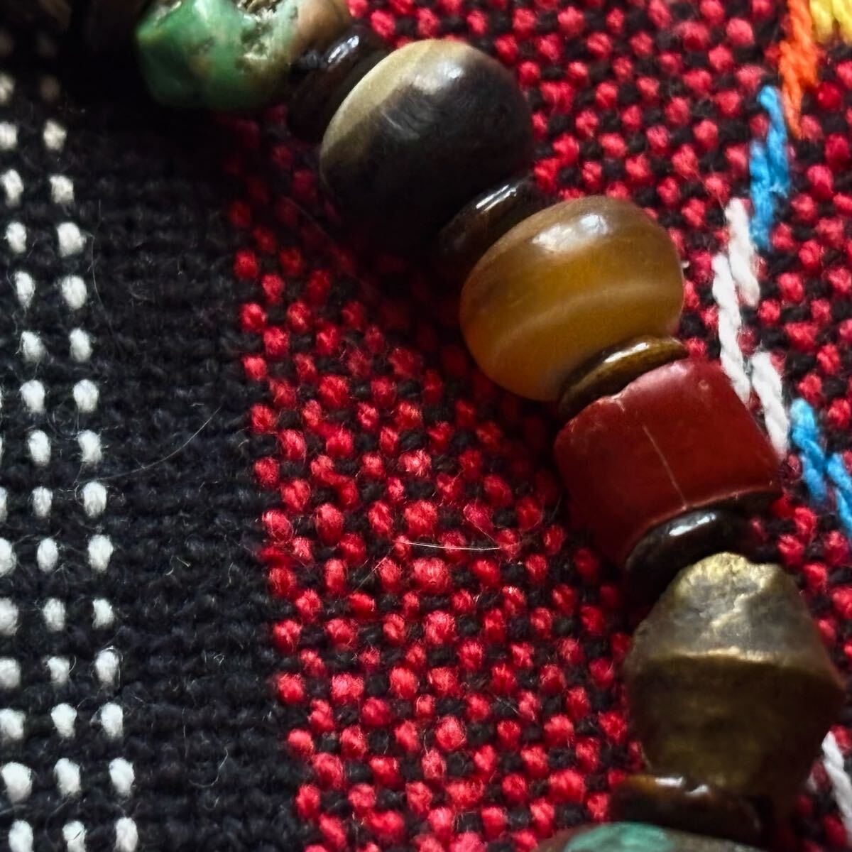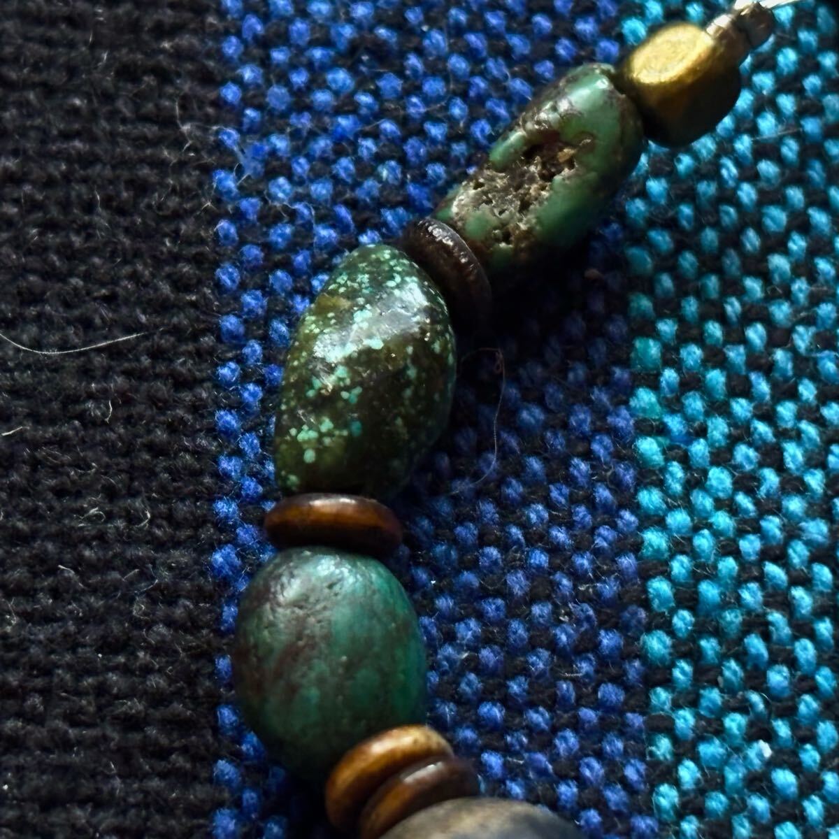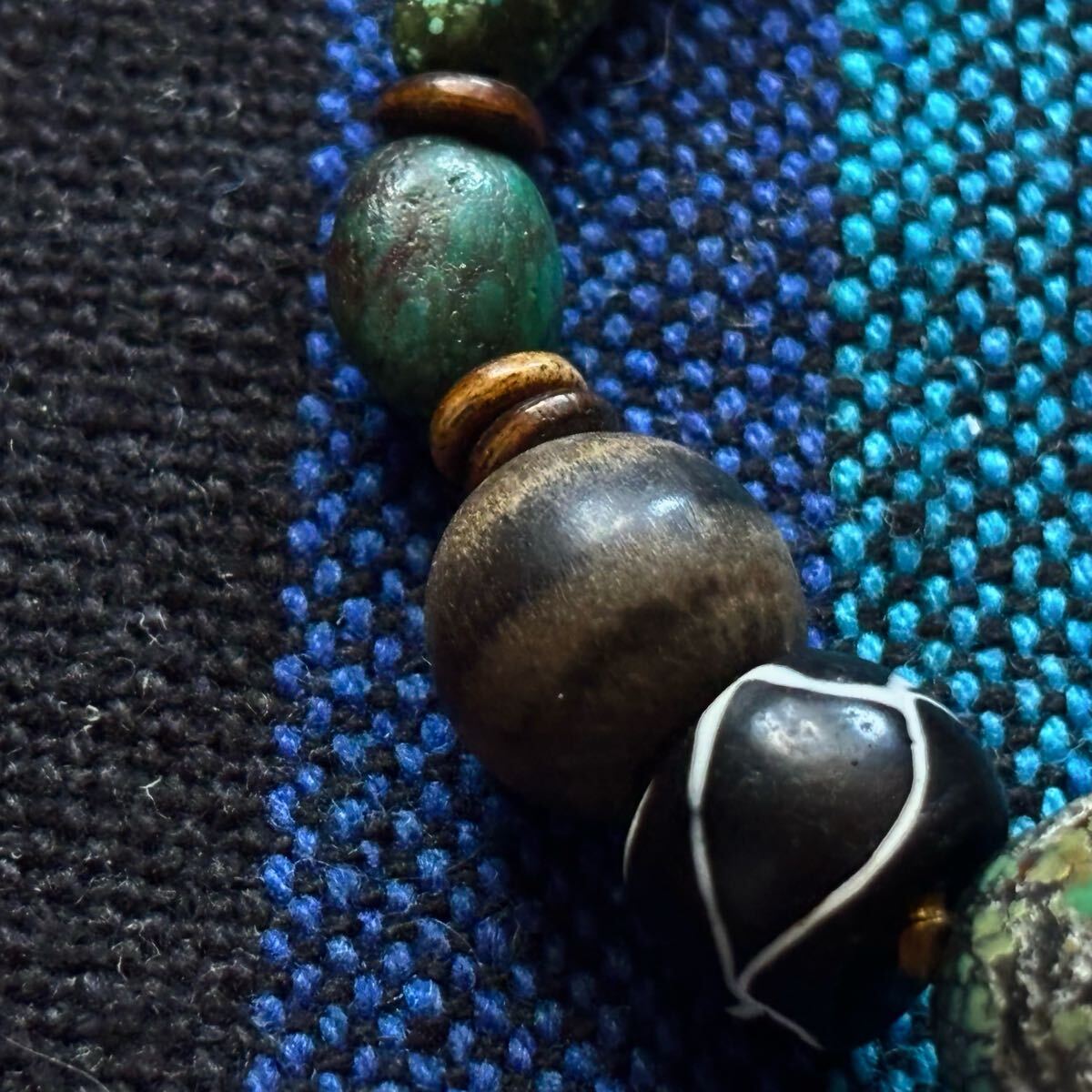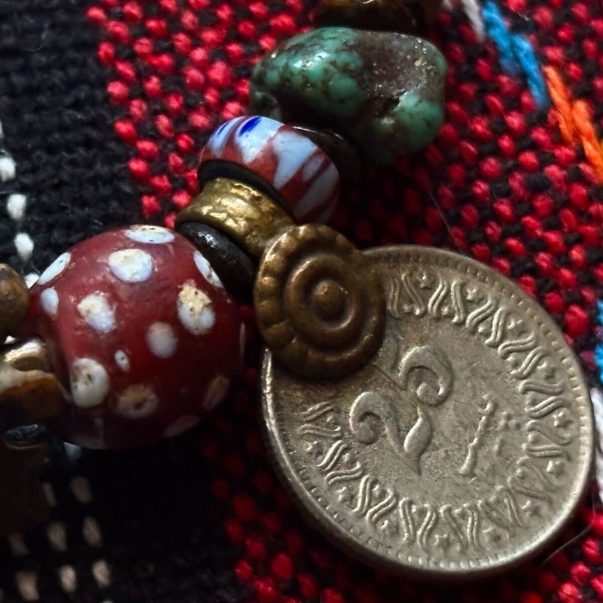 アンティークの古いチベタンターコイズ、1800-1900年初期にヴェネチアで作られたスカンク、アワラシェブロン、グリーンハーツ、ラトルスネイク、アフリカの古い蛇骨、水牛の角、エチオピアンブラス、アフガニスタンのクチ族のコインチャームを繋いだブレスレットです