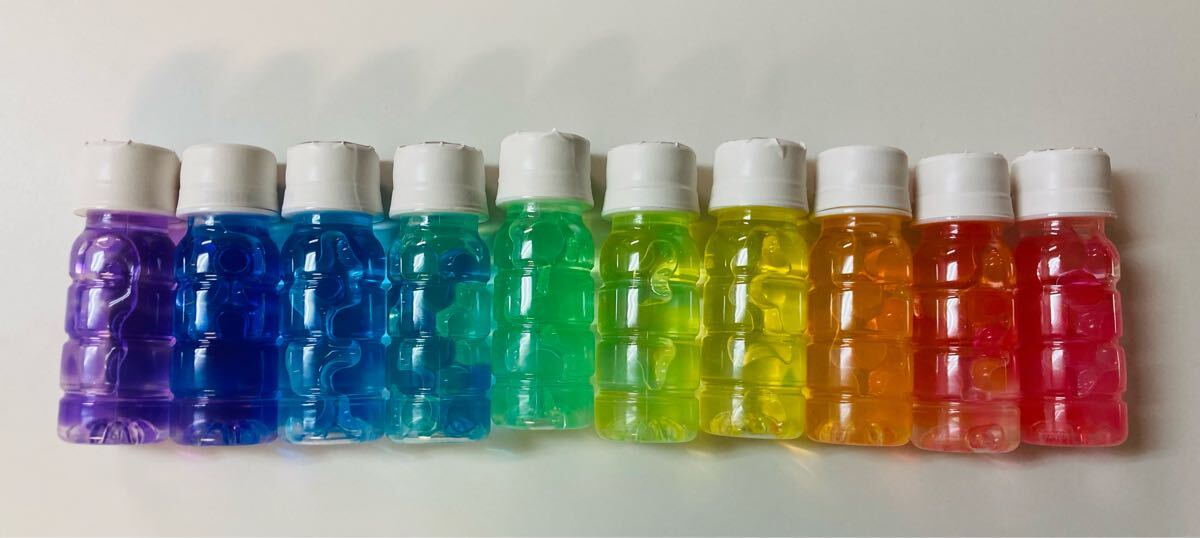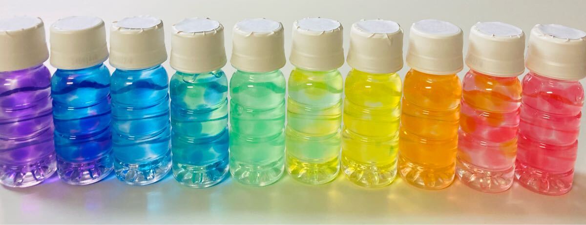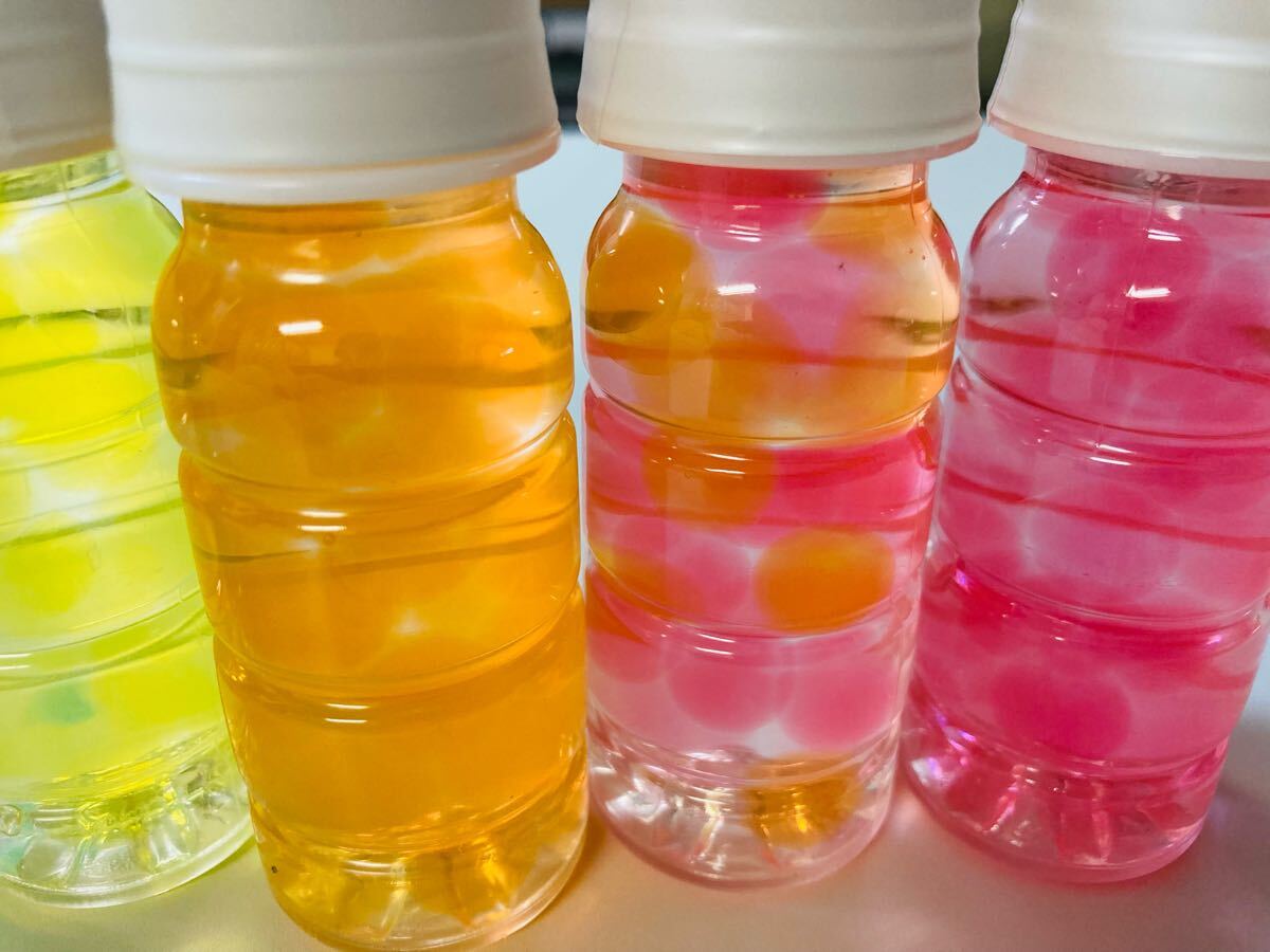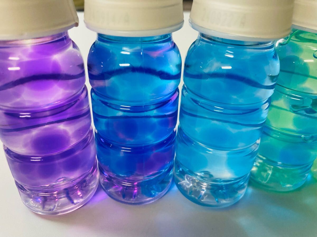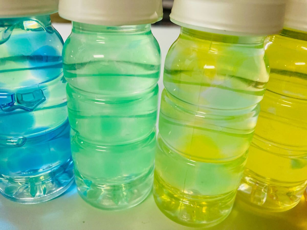 手作りで、水とウォータービーズが入っており、ビニールテープで口を止めています。