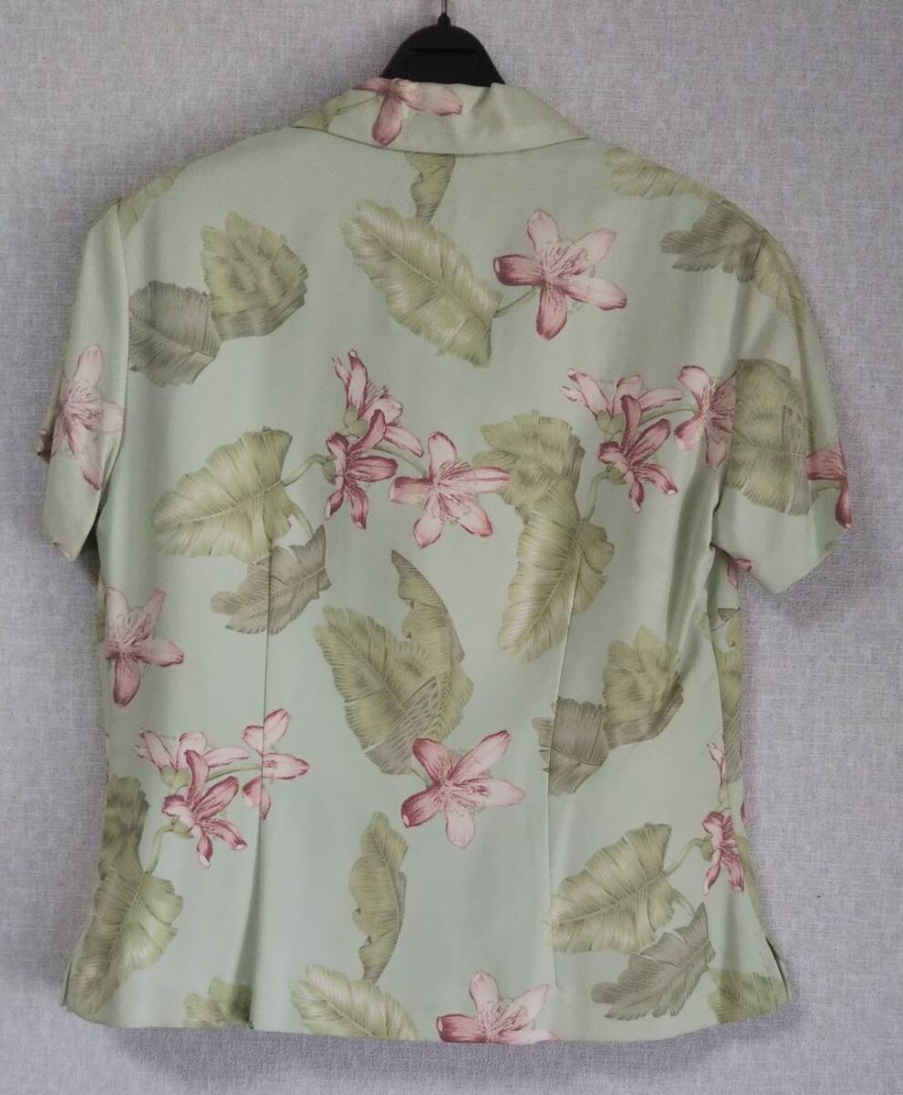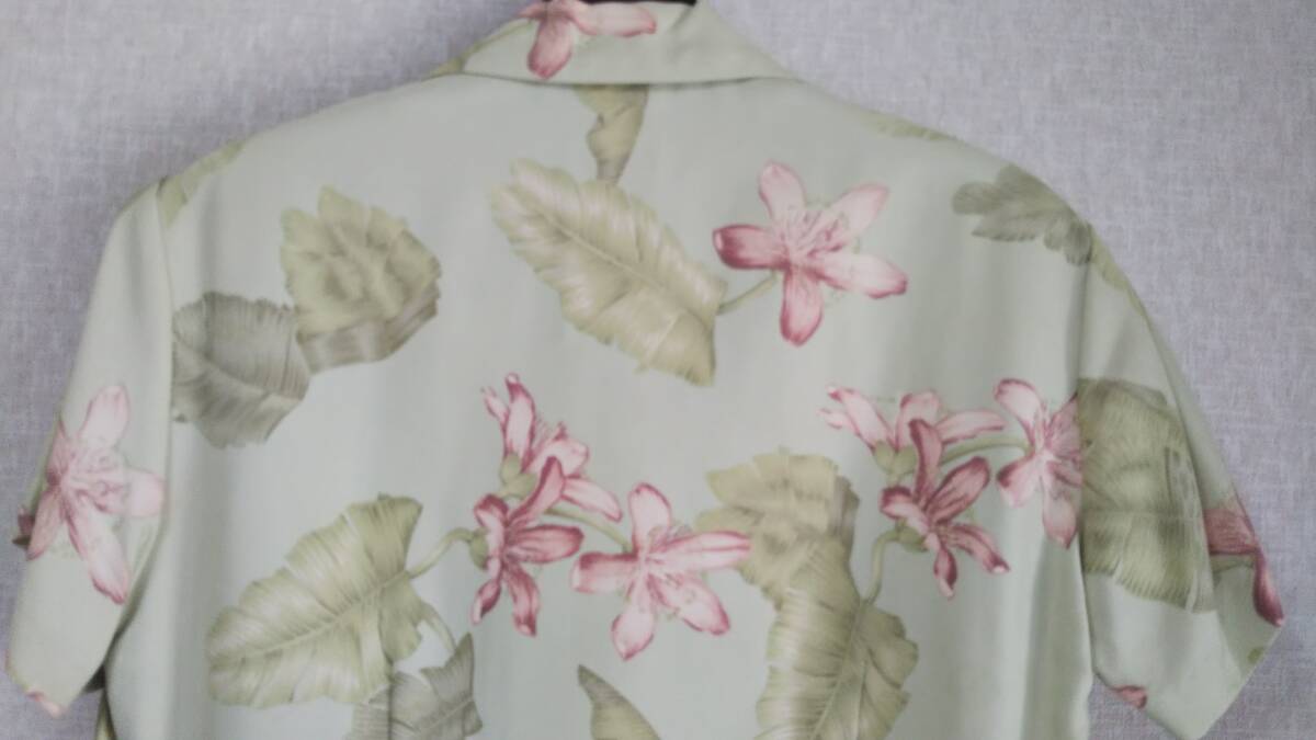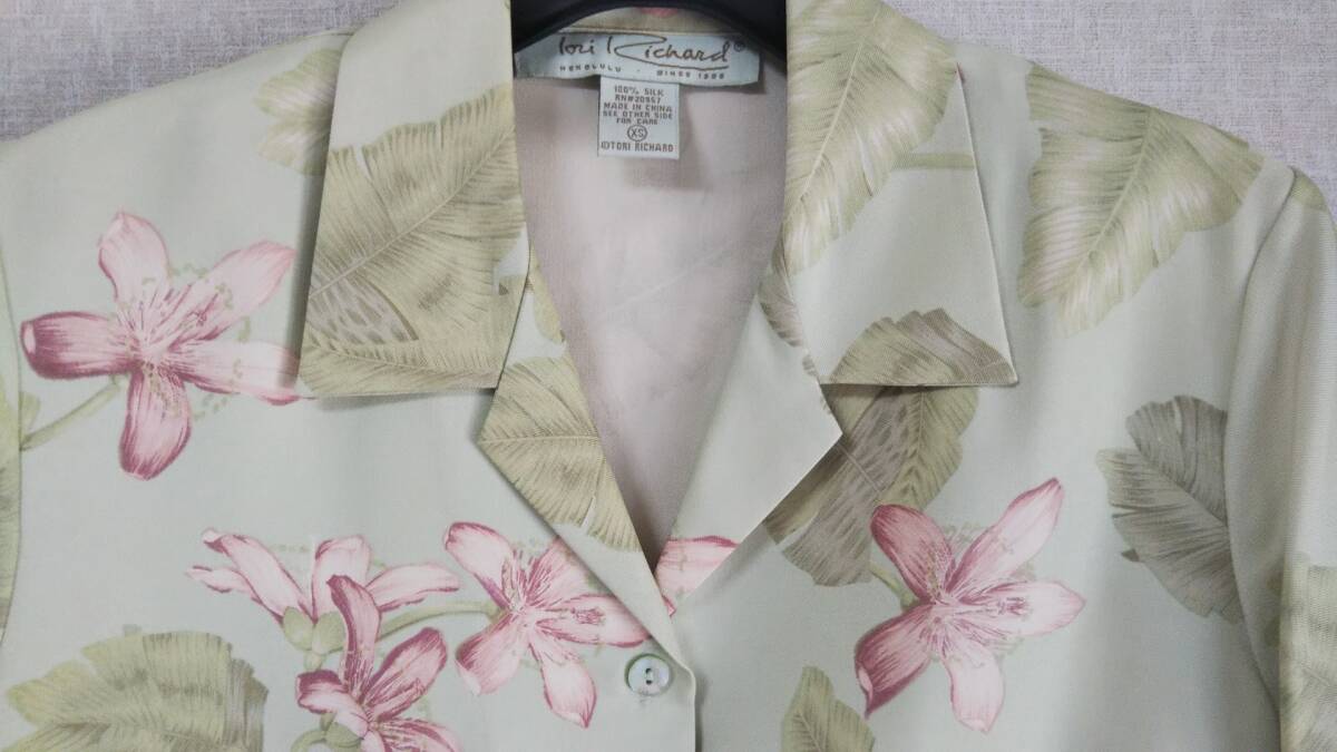 ★TORI RICHARDトリ・リチャード★シルク100%半袖アロハシャツ桜色花柄ミントグリーン/レディースSサイズ7号/上品リゾートウエア絹ハワイ★