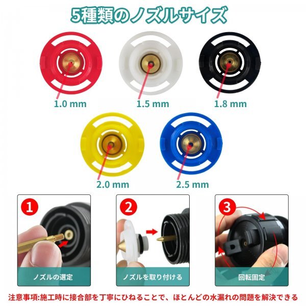 - 5種類の銅製ノズル(1mm、1.5mm、1.8mm、2mm、2.5mm)が付属、ニーズに応じたスプレーが可能。