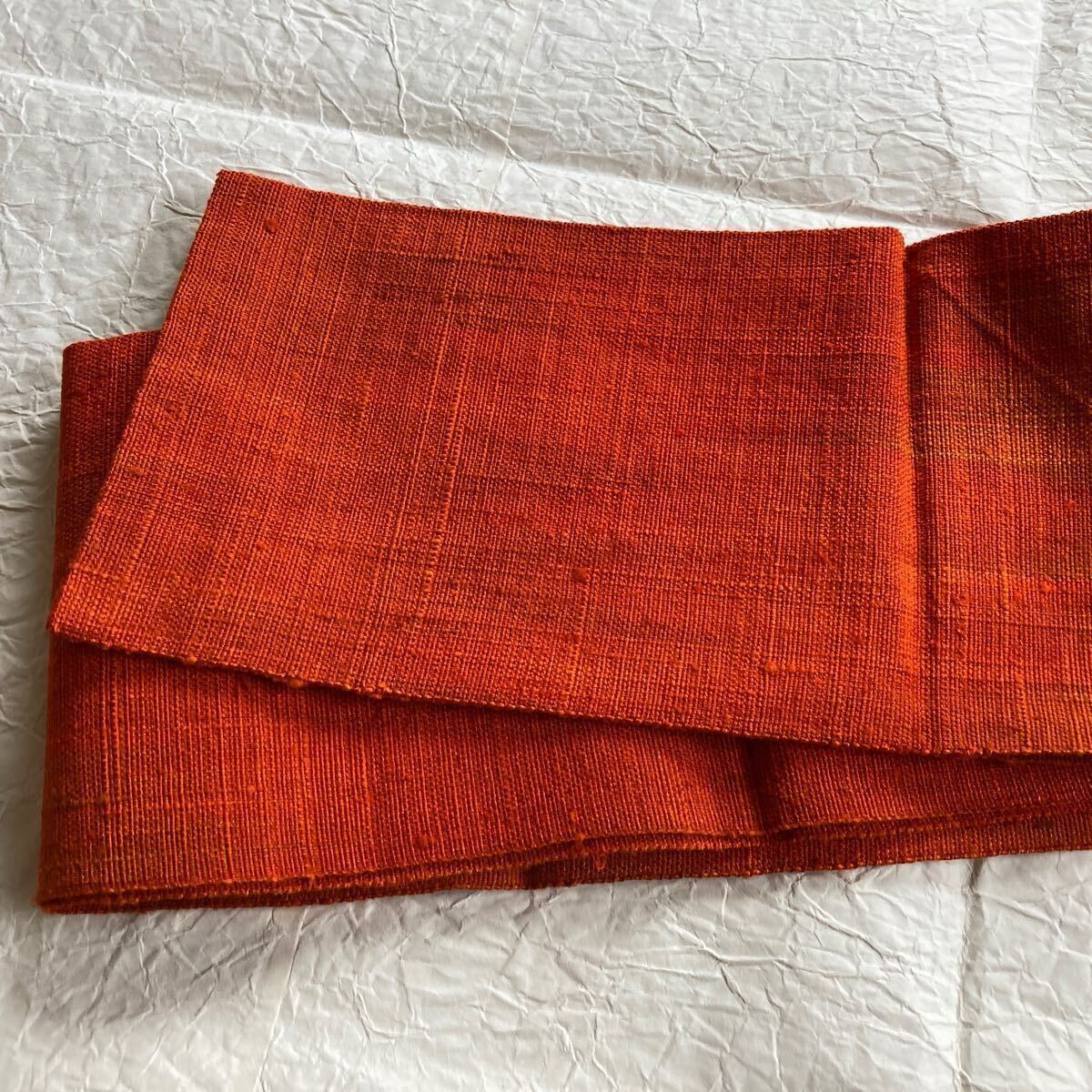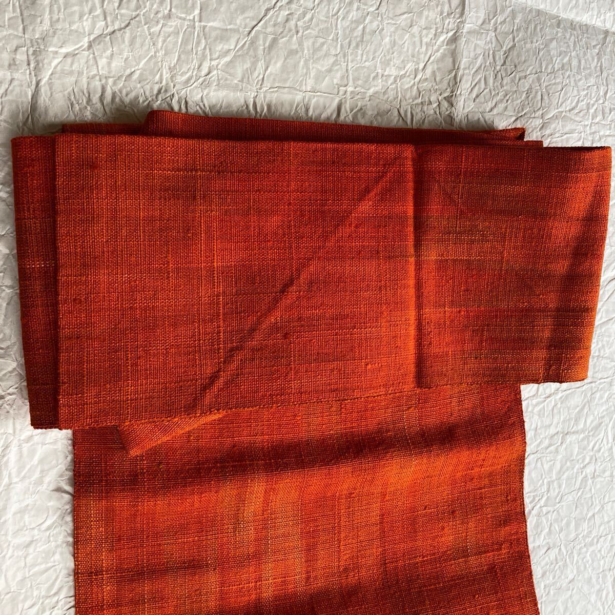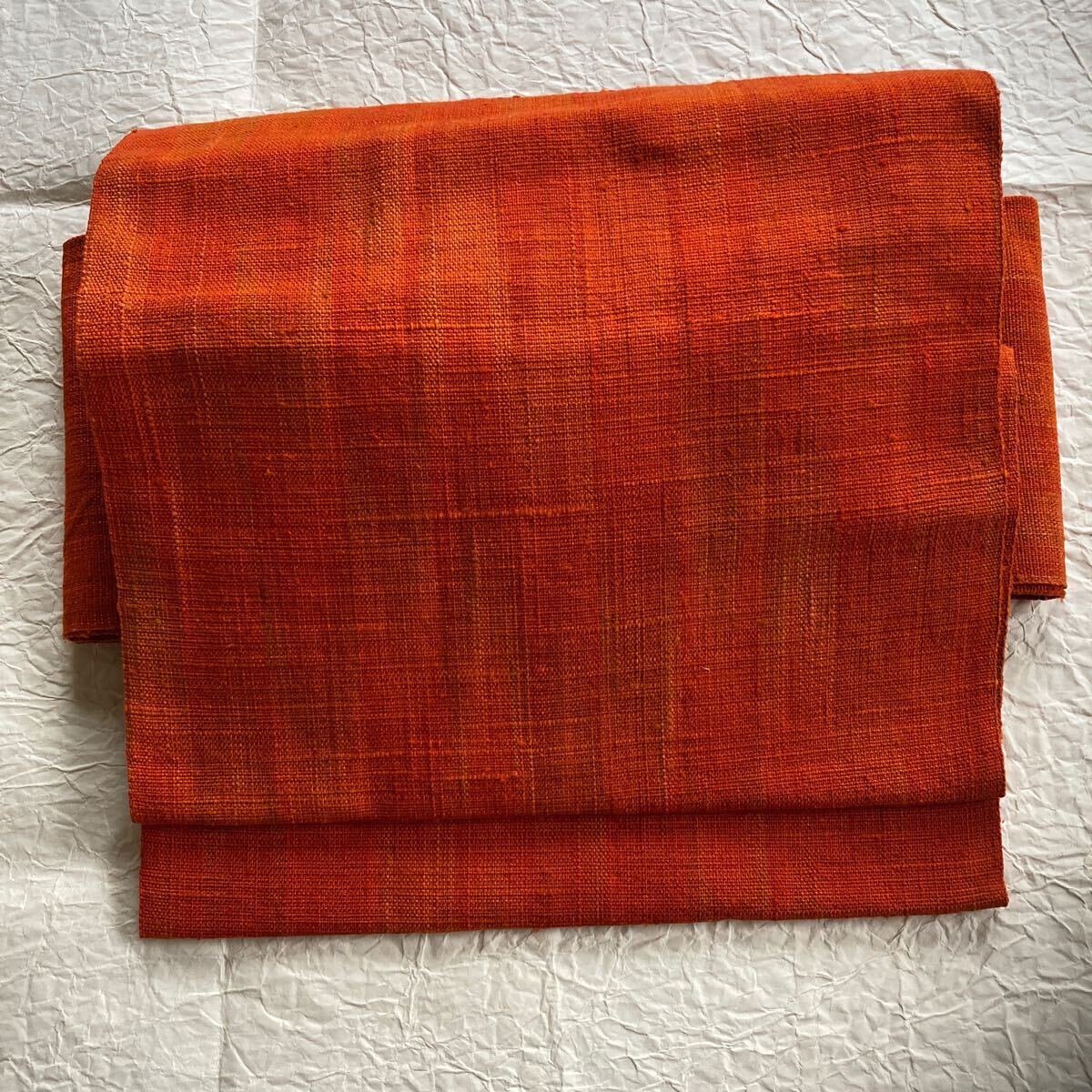 以前に購入したものです。オレンジ色の紬の単帯です。リメイク素材としてもいかがでしょうか?中古のご理解頂ける方に。宜しくお願い致します。