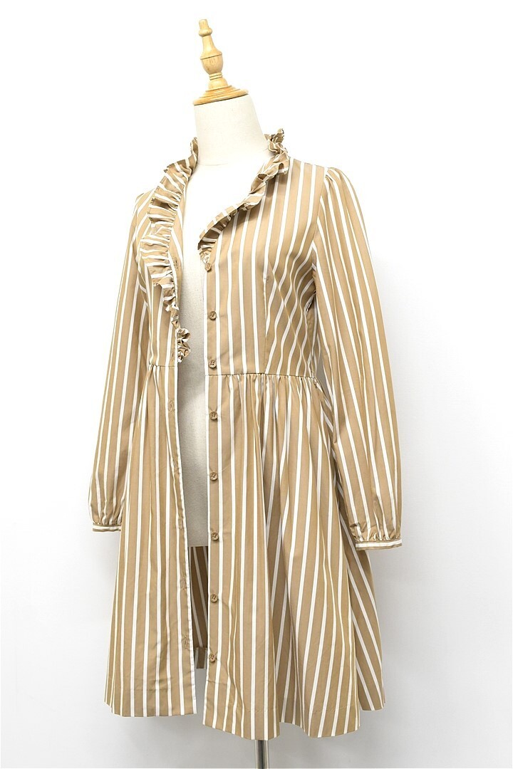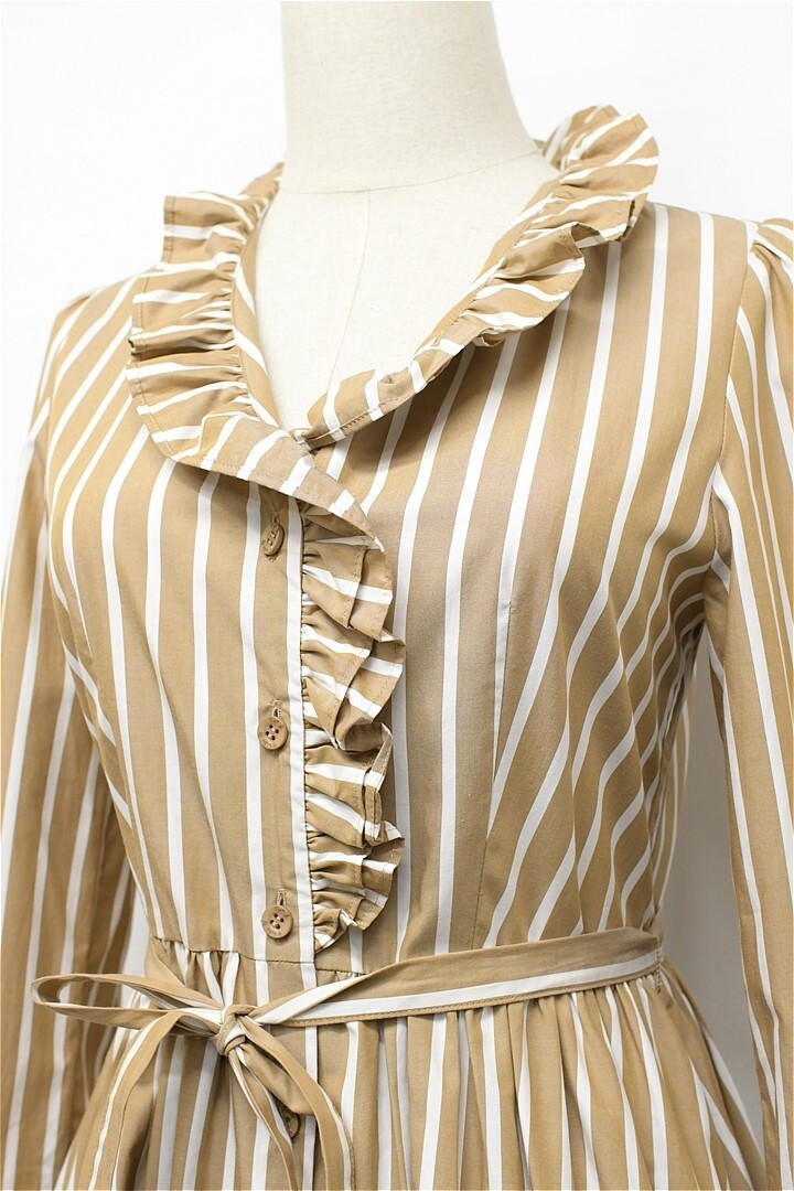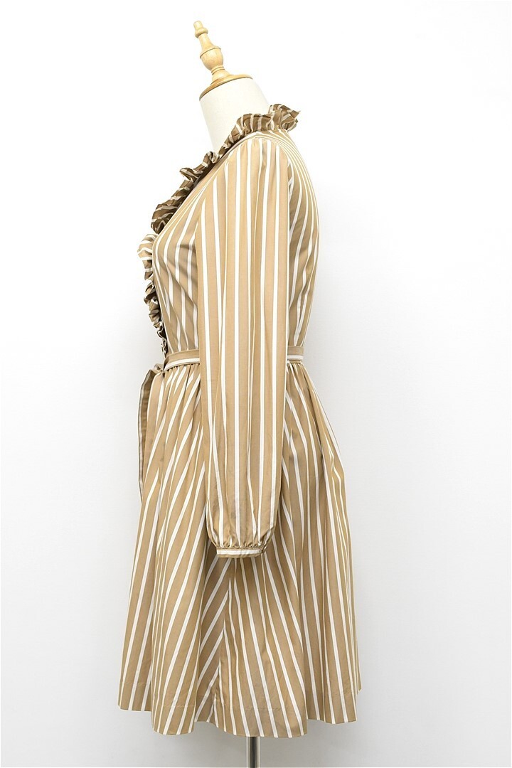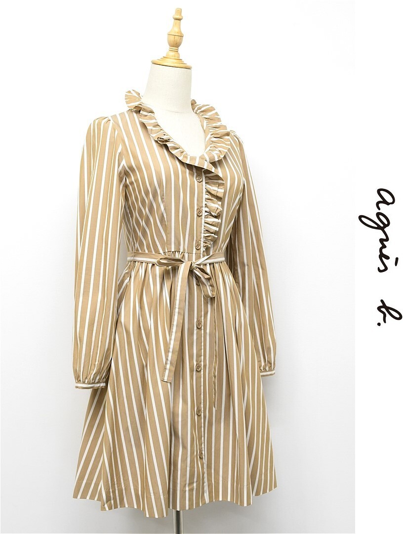 C495/To b agnes b. ひざ丈シャツワンピース ドレス ストライプ 長袖 ウエストリボン フリル 36 S ブラウン