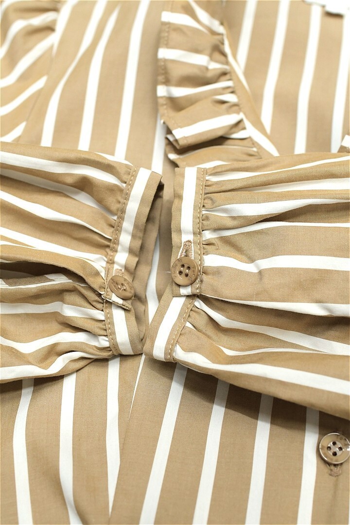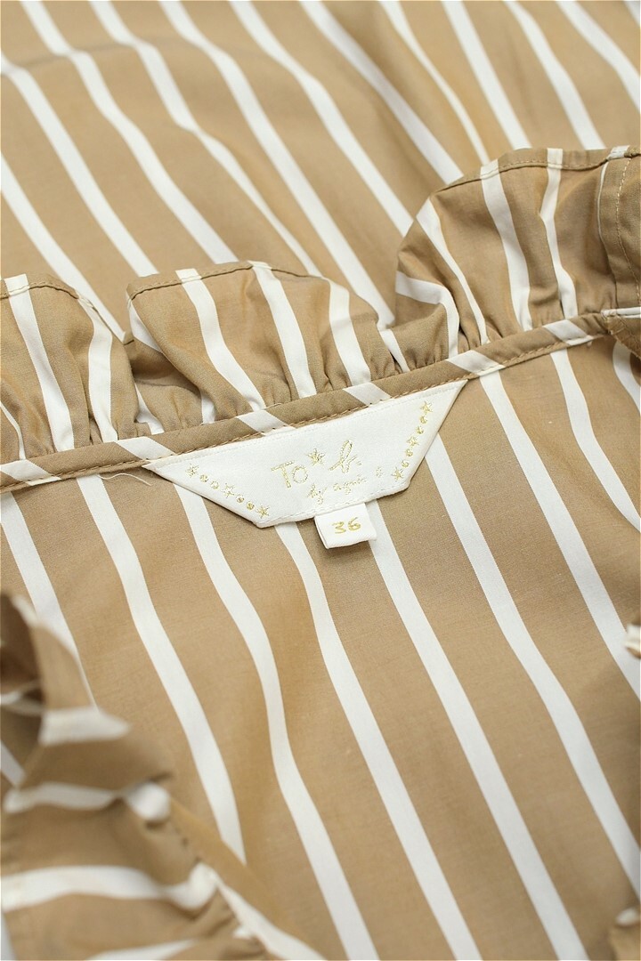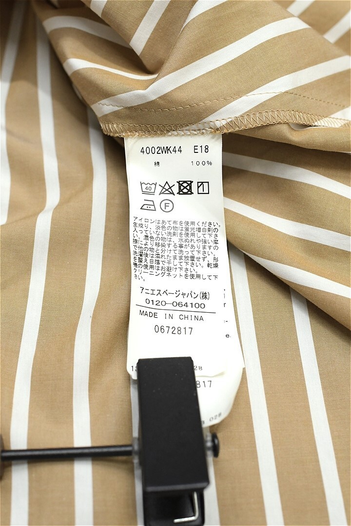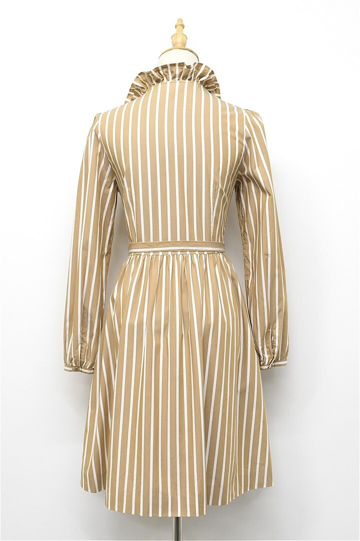 C495/To b agnes b. ひざ丈シャツワンピース ドレス ストライプ 長袖 ウエストリボン フリル 36 S ブラウン