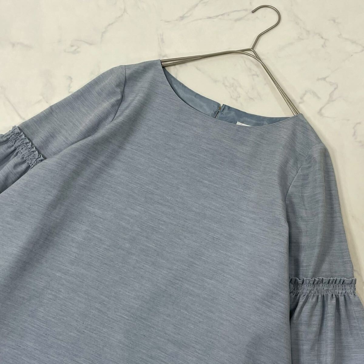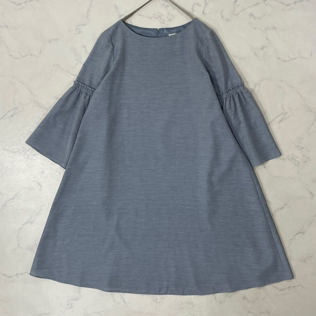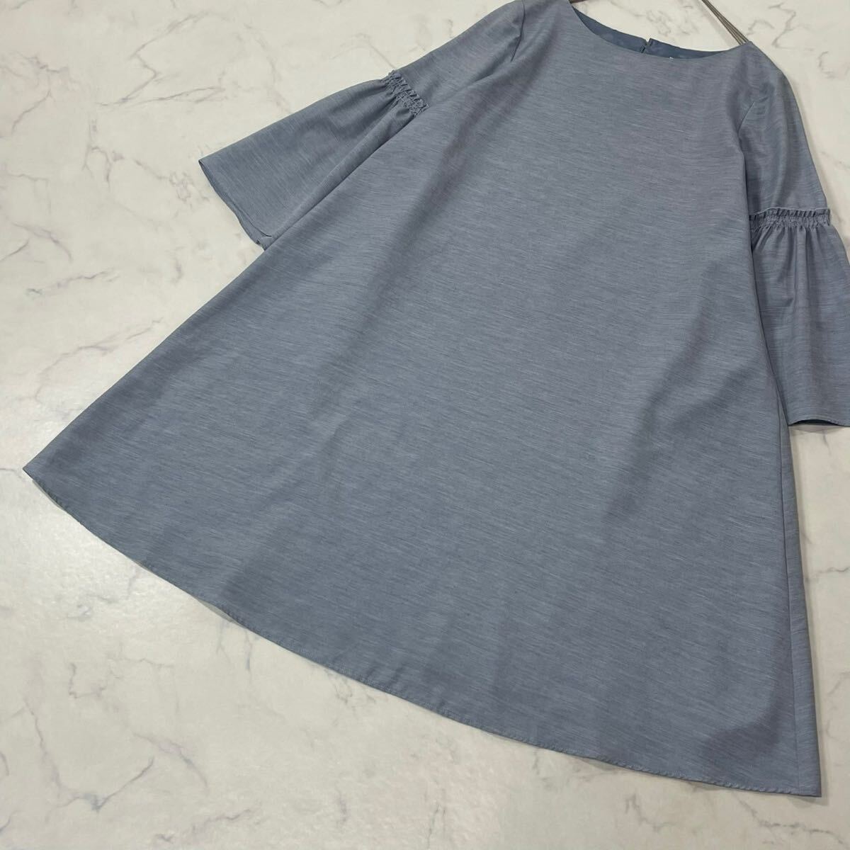 日本製 大きめ 切替 杢調 裏地付き ギャザー ボタン クルーネック フレアスリーブ 長袖 ひざ丈 ワンピース