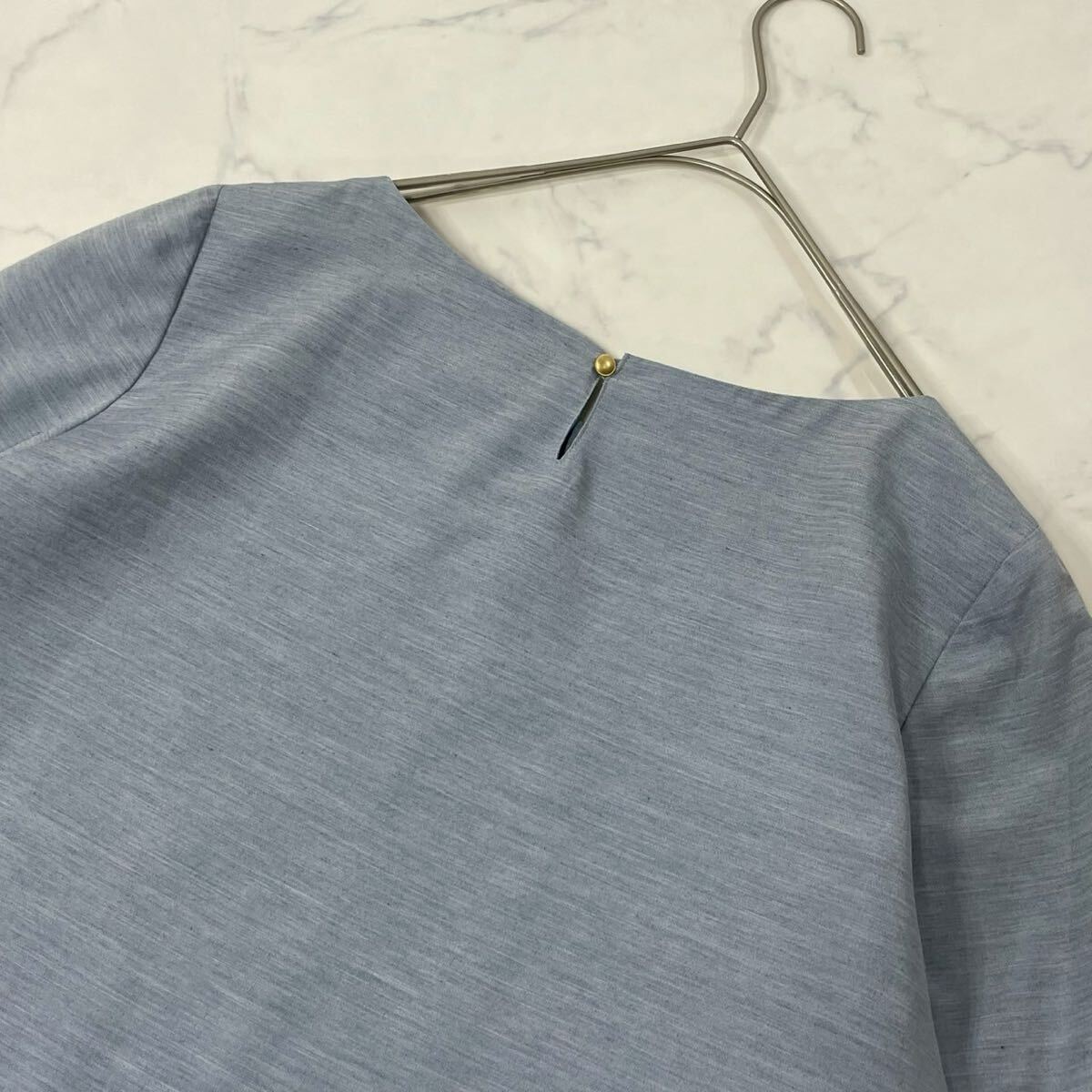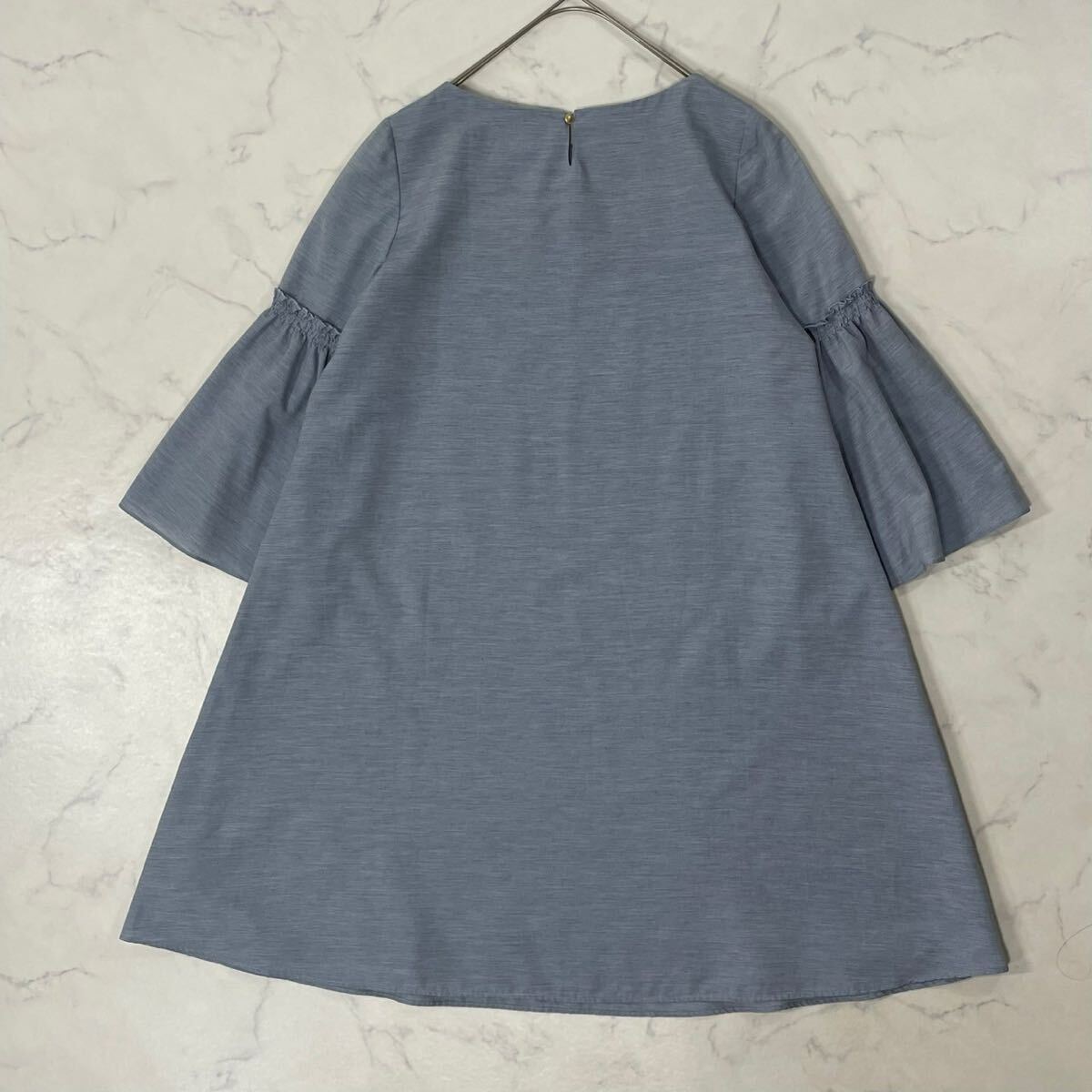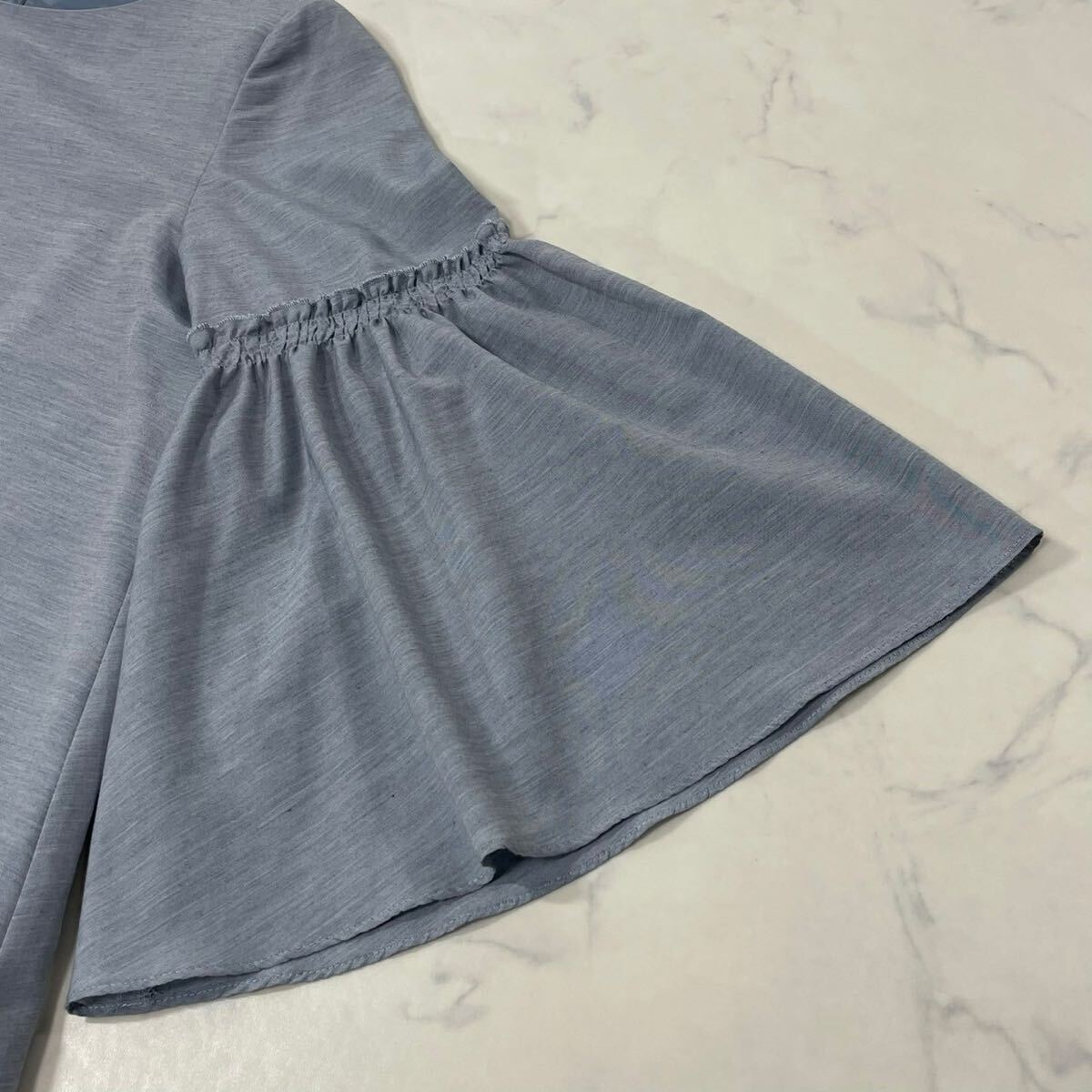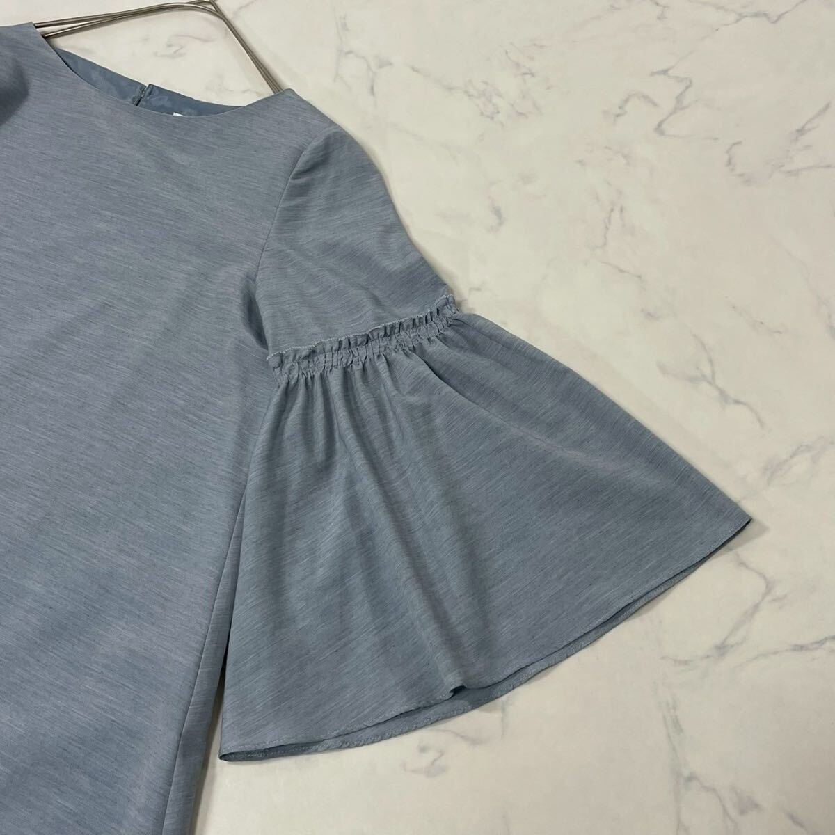 日本製 大きめ 切替 杢調 裏地付き ギャザー ボタン クルーネック フレアスリーブ 長袖 ひざ丈 ワンピース