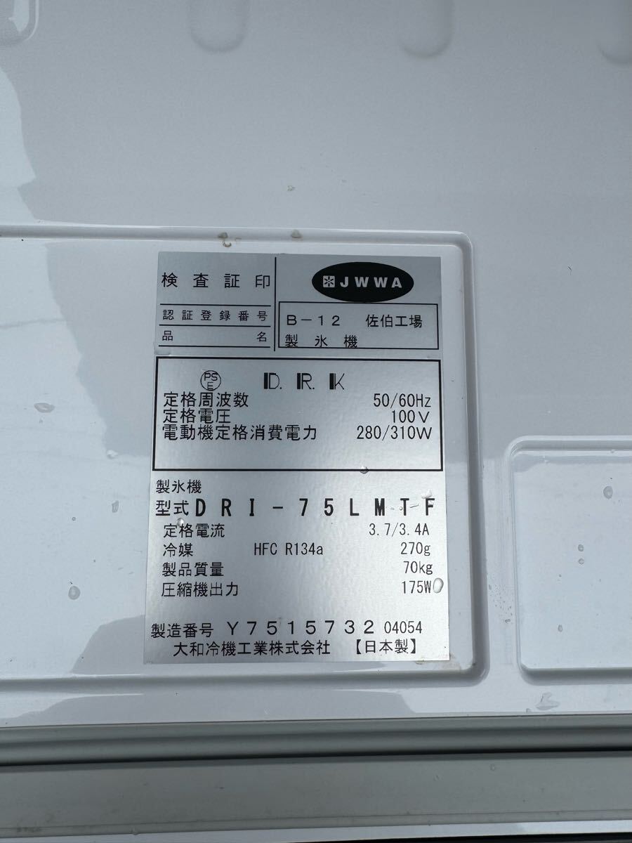 2024年8月新品導入 大和冷機 Daiwa キューブアイス 製氷機 DRI-75LMTF 単相100V 幅1000×奥行600×高さ820(800)mm 大阪府茨木市