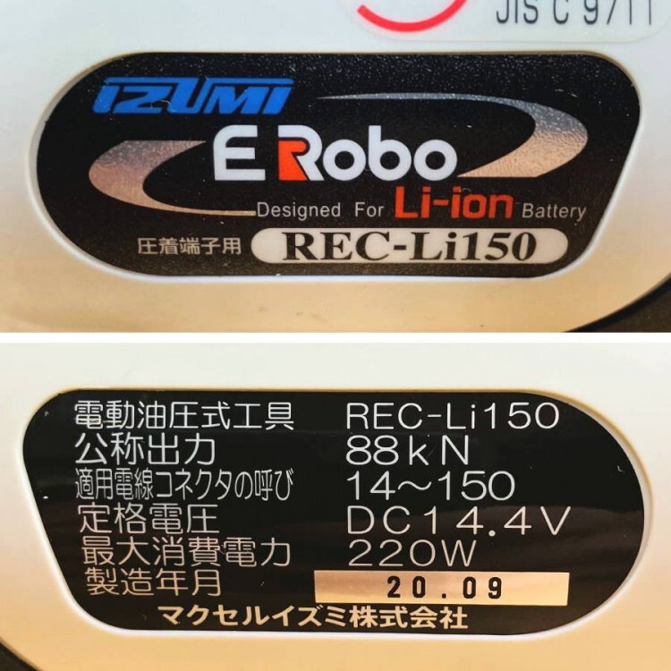 | 管理番号:1100000104889 メーカー:IZUMI/イズミ(泉精器) 型番:REC-LI150S1 規格・仕様: 【仕様】 電動機:14.4V DCモータ 出力:88kN 圧着範囲:14〜150mm2 寸法:337×288×84mm 質量:3.5kg(バッテリ・ダイス含む) 詳細備考: 本体は使用感の少ない美品になります。 スライドピンの引き抜き、ヘッド部の回転、ピストンの下降確認等問題なく行えました。 ケースに小傷が複数あり。 肩かけベルトが欠品しております。 状態は画像にてご確認ください。 【付属品】 バッテリパック×1 充電器 アルミケース オスダイス 14、22、38〜70、80〜150 商品は写真に写っているもので全てです。(※背景などにある無関係の物は含まず) 他に付属品はありません。 ご質問はお気軽にどうぞ。分かる範囲でお答えします!! ※上記は型番などから調べたデータを抜粋したものです。 |