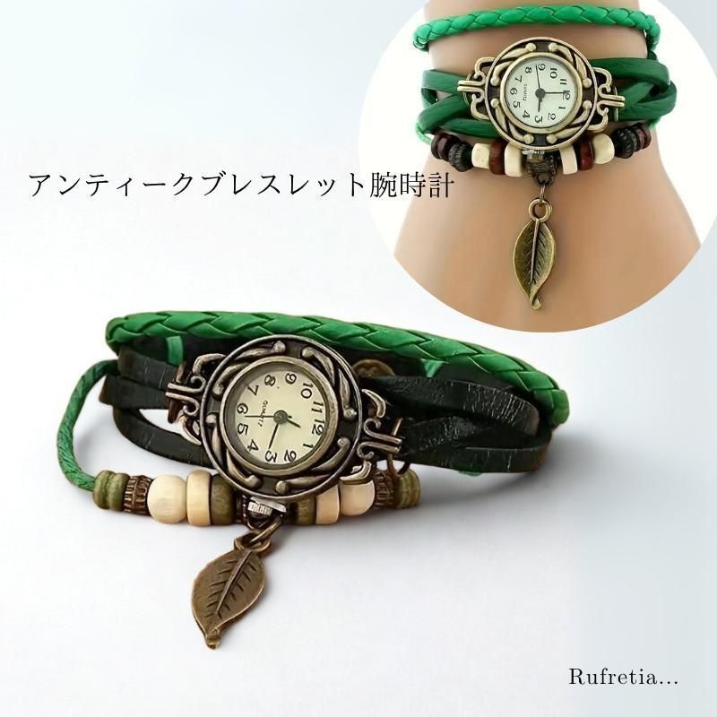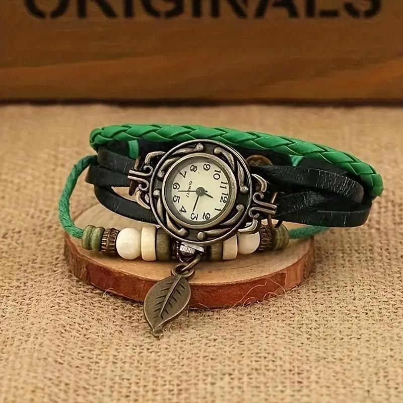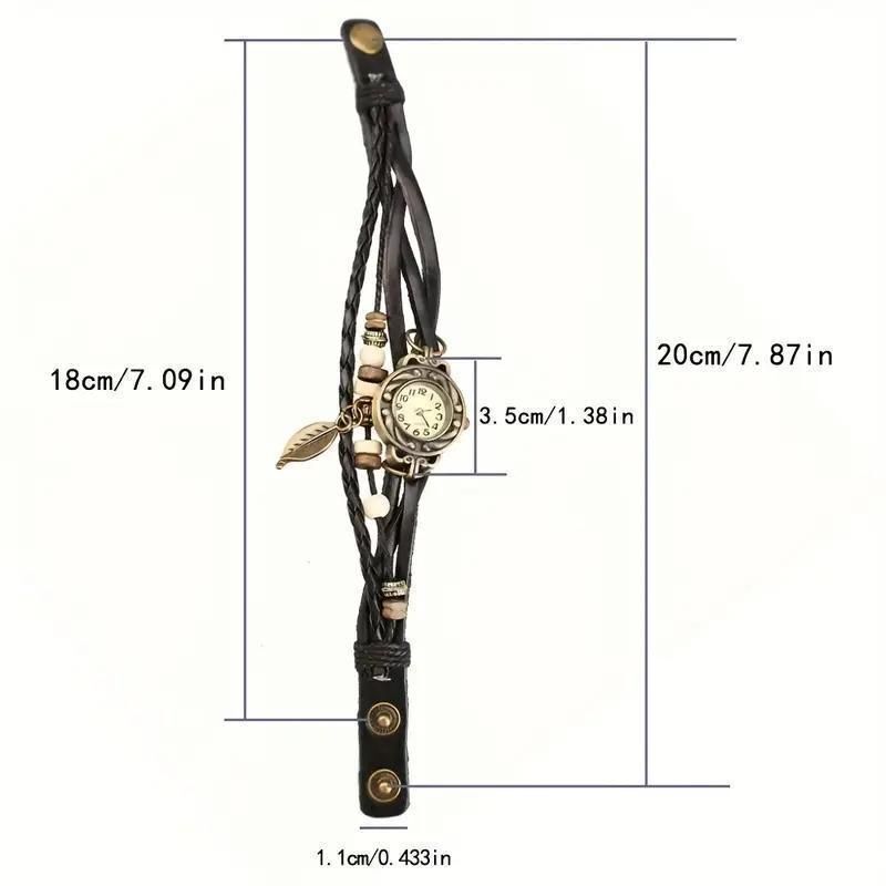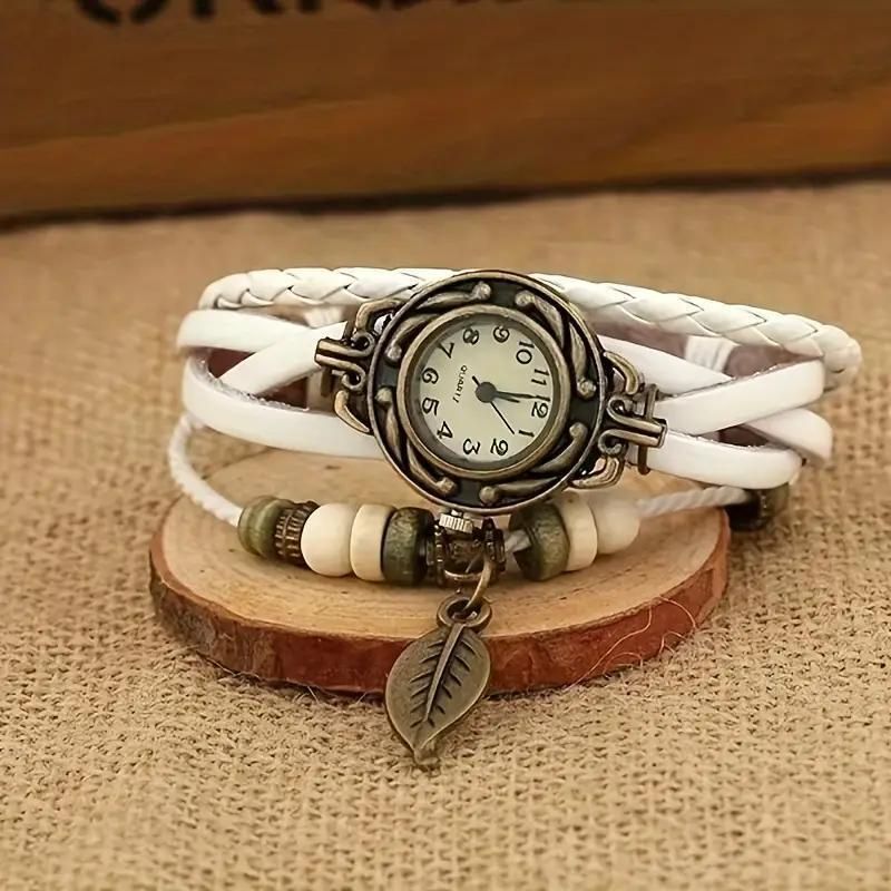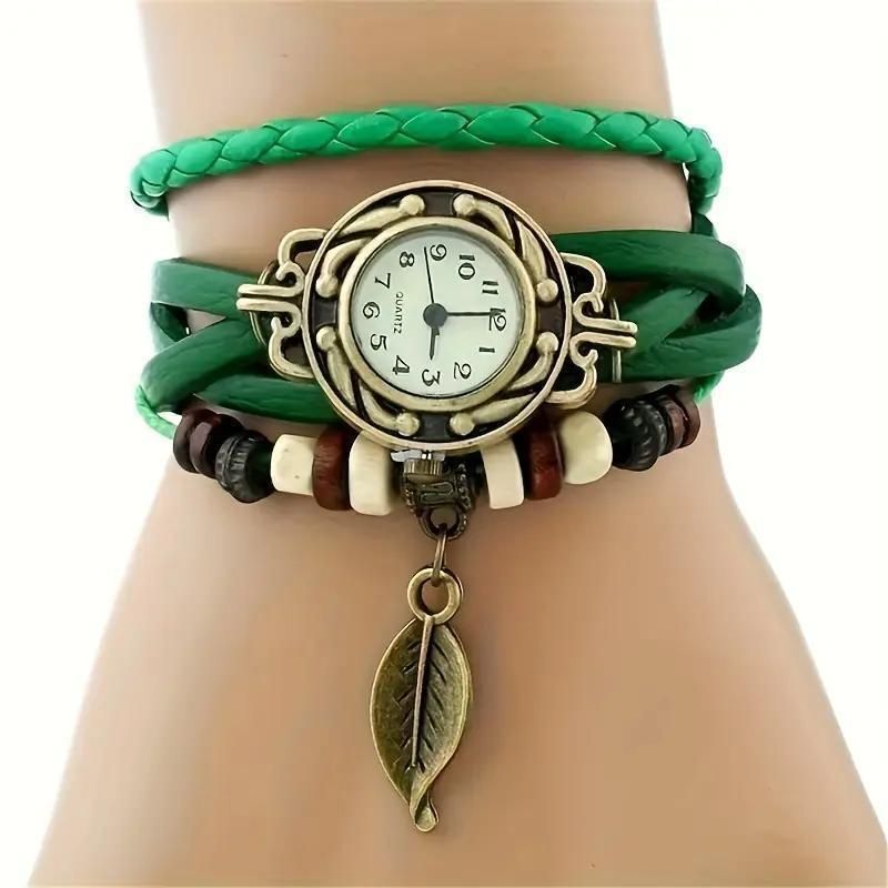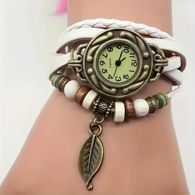 ナチュラルで個性を感じさせる、葉のチャーム付きボヘミアンスタイルのレディース腕時計。