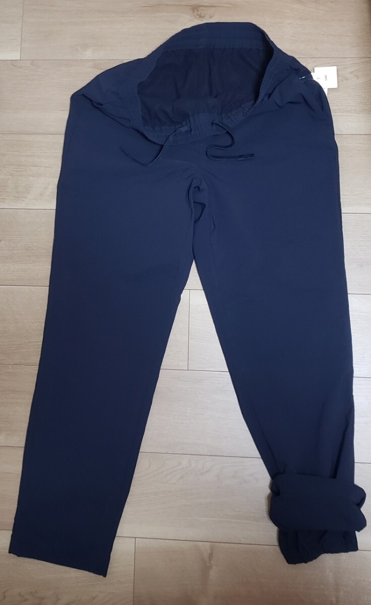 Lサイズ(画像サイズ表参照)、カラーネイビー、ウェスト総ゴム、両サイドポケット、右後ろポケット有り、裾二重防風デザインです。