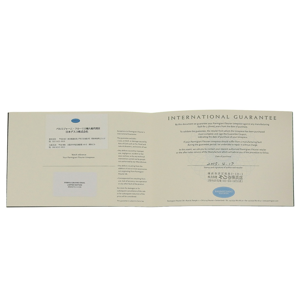 | 商品説明 | ■管理番号:☆☆H152825243☆☆ ■ブランド:【PARMIGIANI FLEURIER】パルミジャーニ・フルリエ ■商品名:腕時計 ■モデル名:フォルマ グランデ ■型番:PE009272 ■ライン:FORMA GRANDE LIMITED EDITION 100本限定 ■シリーズ:41/100 cal.331 ■対象:メンズ ■シリアル:113** ■素材:ステンレススチール ■生産国:スイス ■重量:約115g ■付属品:ギャランティ | |