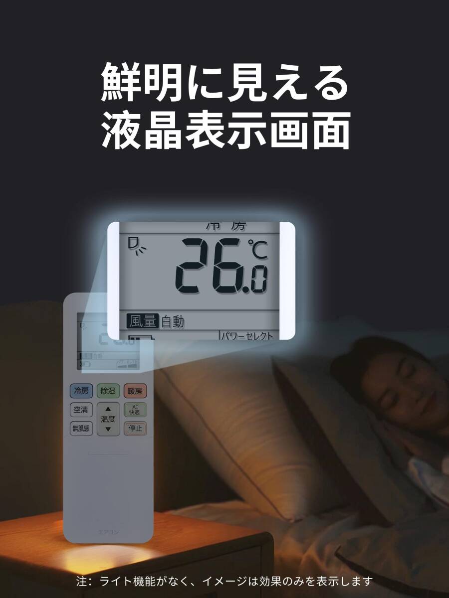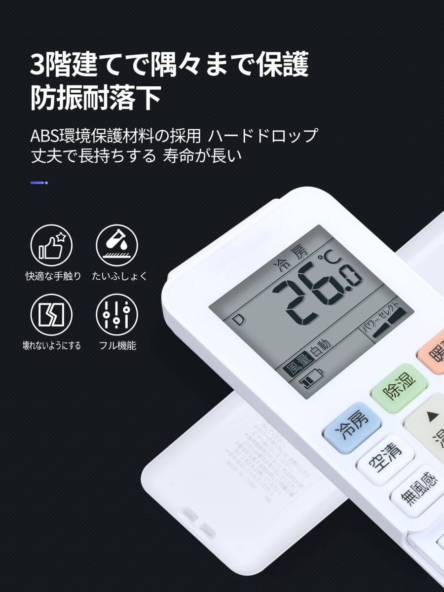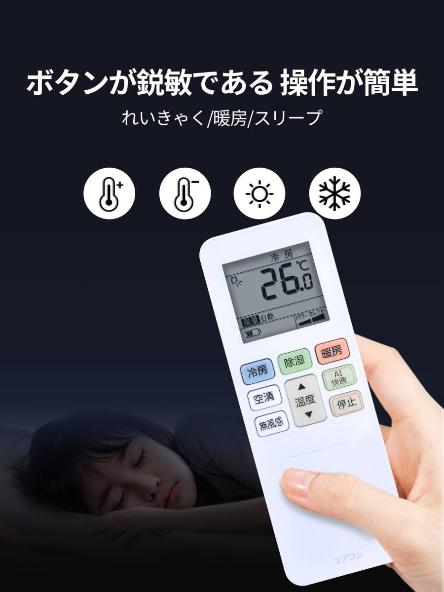 【操作簡単】よく使エアコンの基本機能を備え、操作しやすい大きめボタンを使用し、しかもボタンの上には分かりやすく文字を配布するため、目への負担を軽減し快適な操作を実現します。置いたままでも押しやすい安定感があり、つまんで操作、握って操作、置いたまま操作が出来ます。※機種によっては一部の機能が操作できない場合があります。