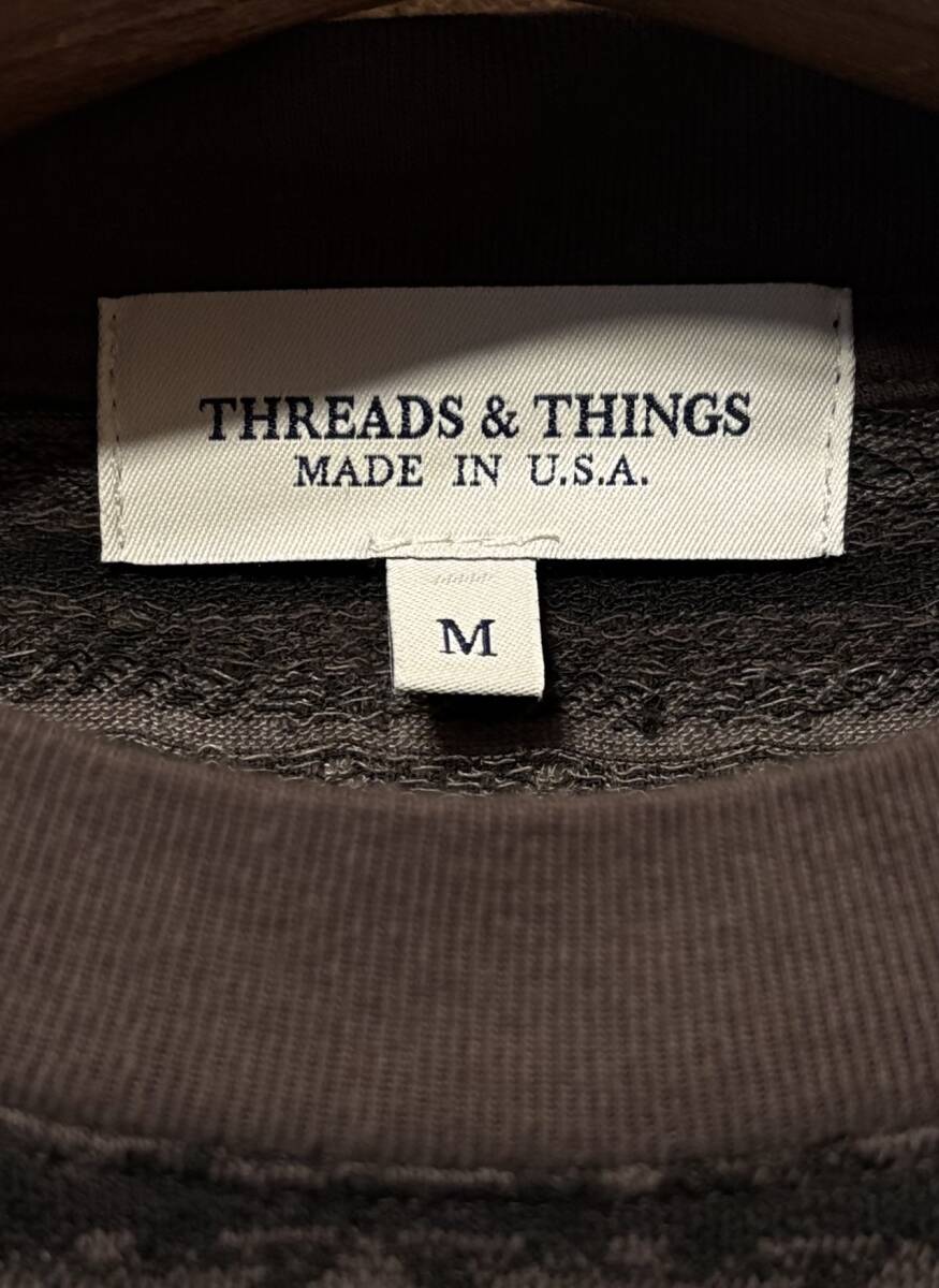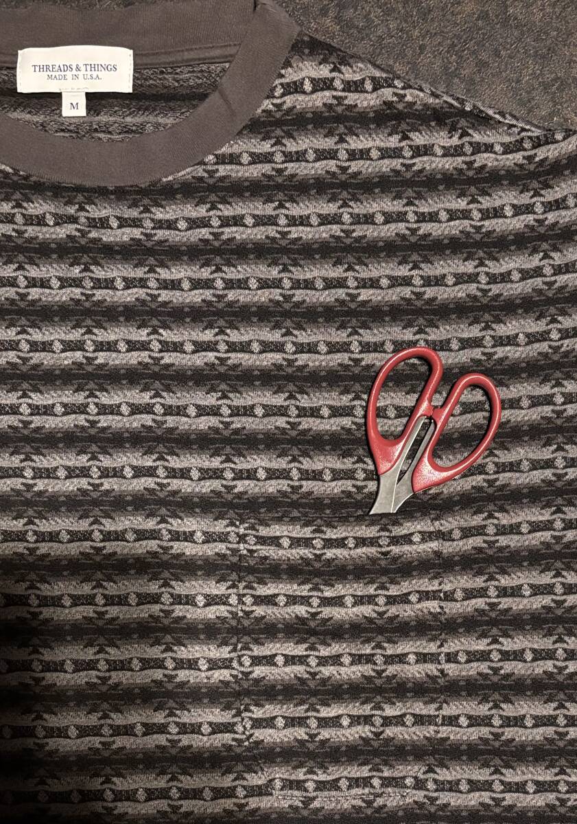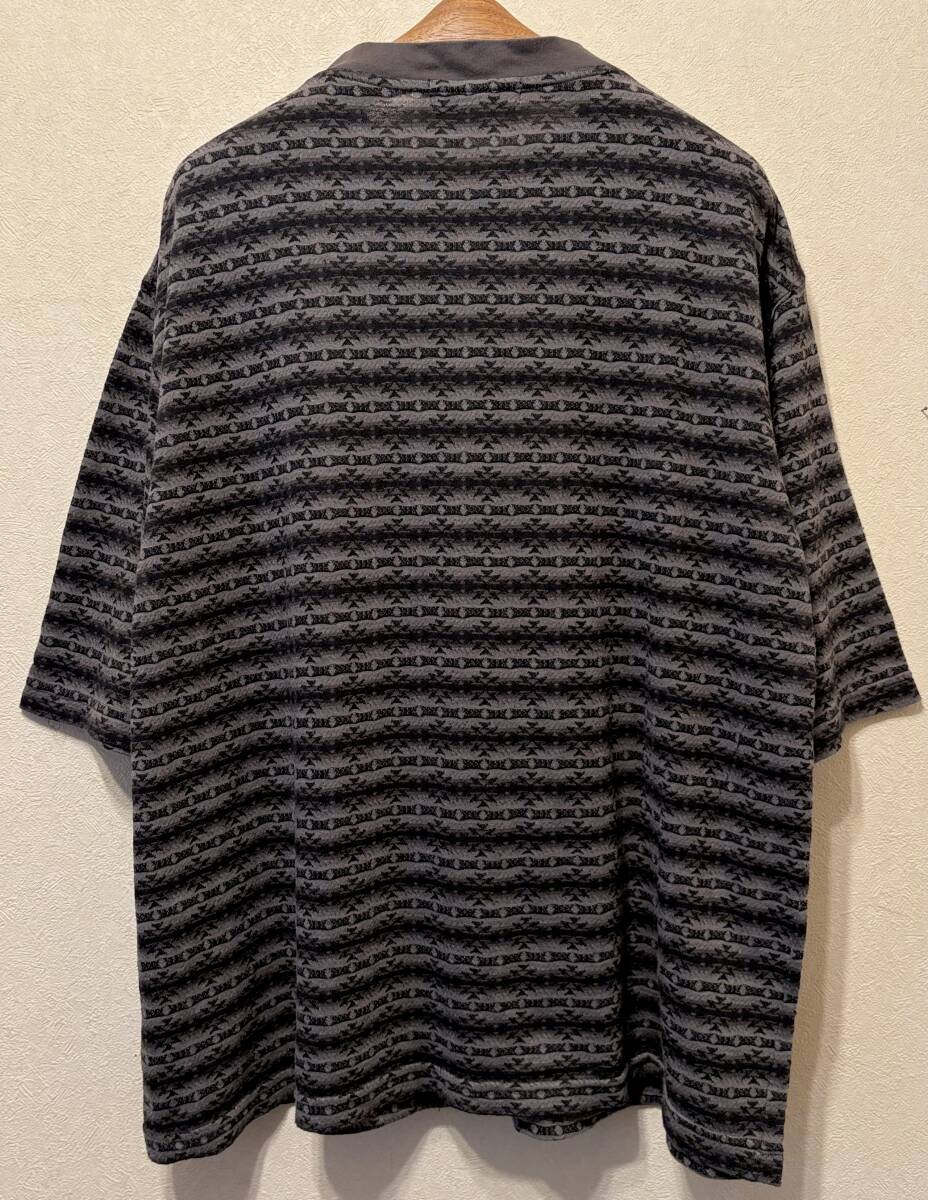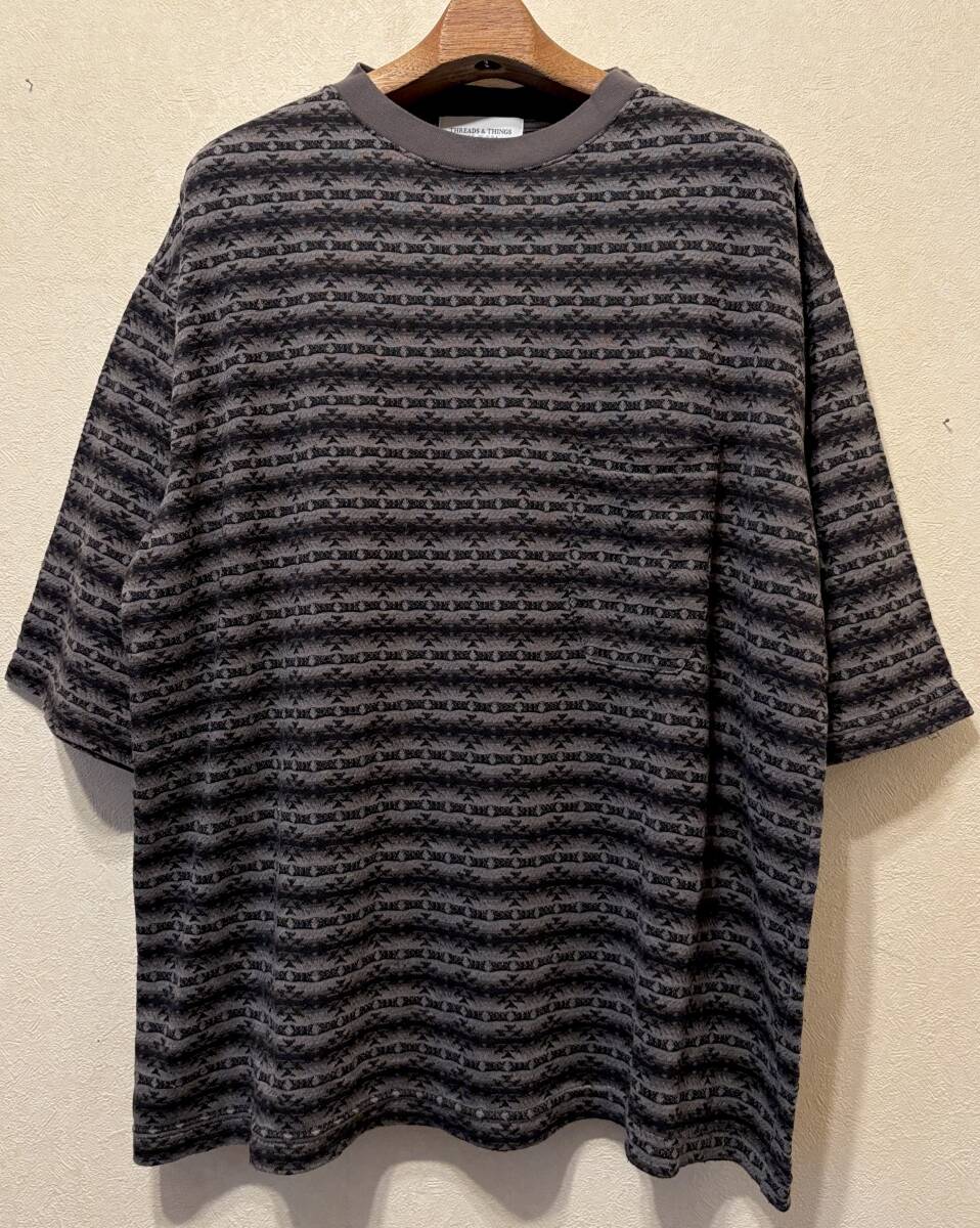 美品USA製THREADS&THINGSネイティブ総柄ボーダー胸ポケットTシャツL~ビッグシルエットMグレー黒ジャガード編み柄レーヨン混ポケT米国製US製