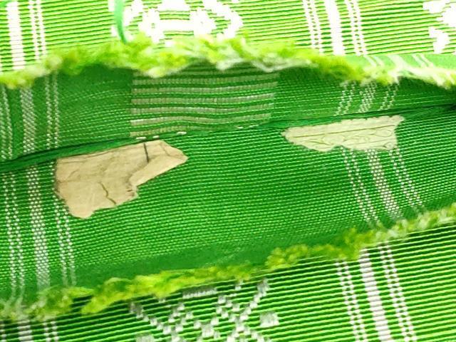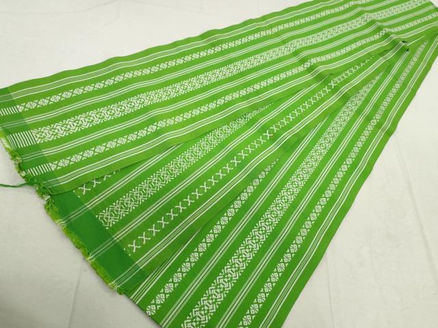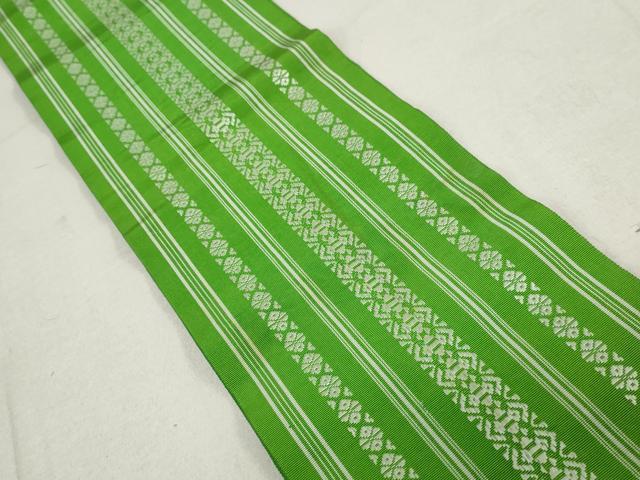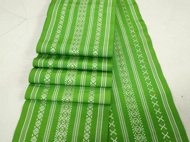 【正絹】 詳細に関しましては、画像をご確認ください。 本場筑前博多織は、 福岡県福岡市博多区やその周辺で生産される絹織物です。 仏具のひとつである独鈷、華皿を基にした幾何学模様が織られています。 江戸時代に筑前藩主だった黒田長政が幕府への献上品にしたことから、 博多献上、献上博多とも呼ばれます。 横畝が際立って見える経畝織りという織りになっています。 30〜60本の細い経糸を使うため、こしやはりがあり、 地合が硬く、光沢感があります。 きちんと締まり、くずれにくい、締めやすい帯といわれています。 大変上質な逸品になります。 お安く出品致しますので、是非この機会にいかがでしょうか? ※たれ先に証紙跡がございます。 |