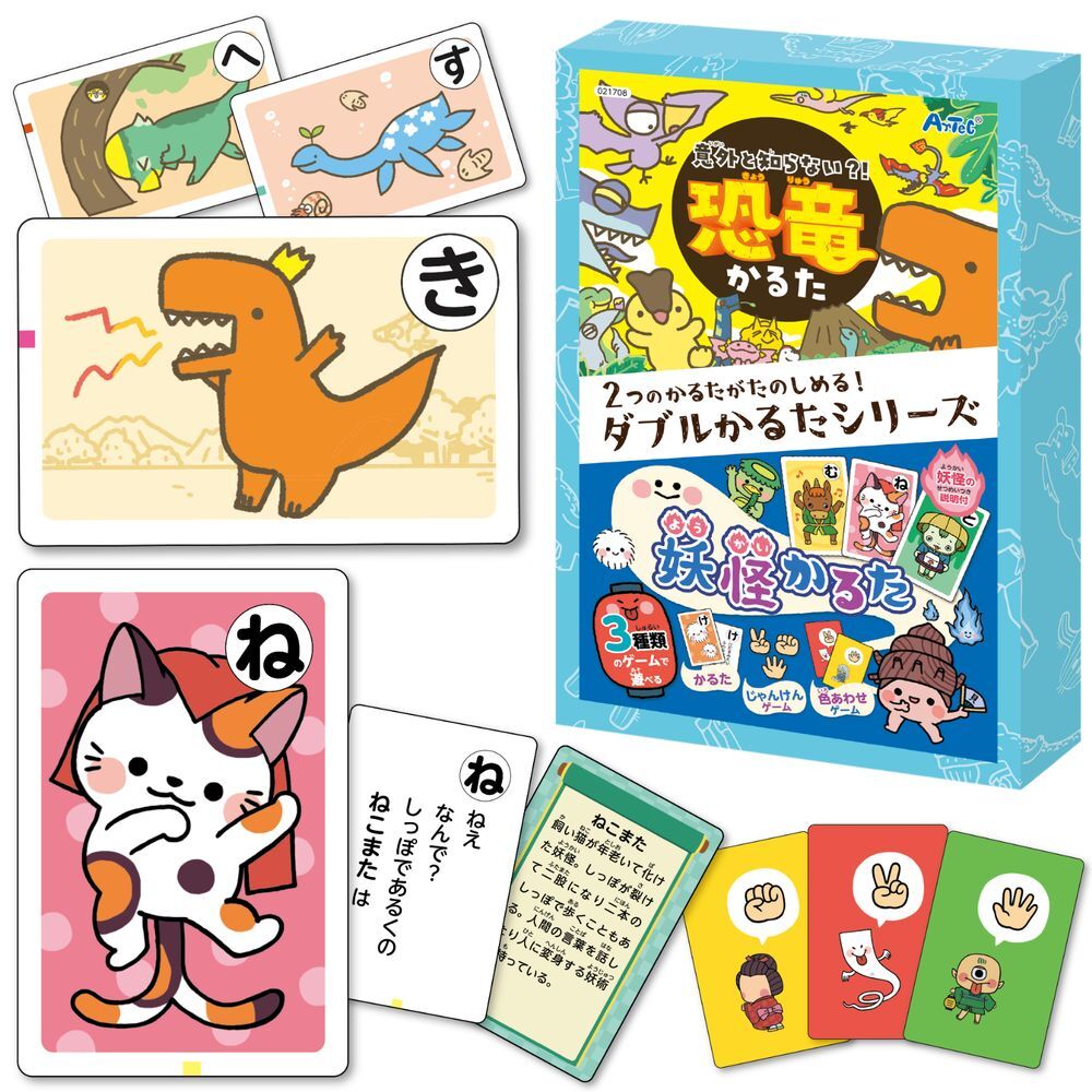 1セットで2種類のかるたが楽しめるダブルカルタシリーズです。親子での時間や学びの一環として、遊びながら知識を深められる特別なセットです。【恐竜かるた】:三畳紀から白亜紀までのいきもの45種類を可愛いイラストで紹介。生息時期や化石の発見場所、大きさなどの特徴を楽しく学べるカード付きです。【妖怪かるた】40種類の妖怪が登場し、それぞれの説明も書かれています。遊び方は、通常のかるた、神経衰弱スタイルの『いろあわせ』、そして手持ちカードを使った『じゃんけんゲーム』の3種類。さまざまな楽しみ方で、子どもから大人まで夢中になれます。