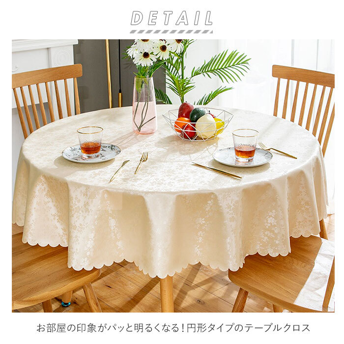 商品説明 | ・お部屋の印象がパッと明るくなる!円形タイプのテーブルクロス。 ・いつものテーブルにかけるだけで、テーブルをキズや汚れから守ってくれる◎ ・撥水性のある生地を採用しているから、食べ物をこぼしても生地に染み込まない! ・調味料をこぼしても、サッと拭くだけでOK。お手入れが楽ちんなのが嬉しい。 ・デザイン違いで揃えれば、季節や気分によってカンタンに模様替えできる♪ |