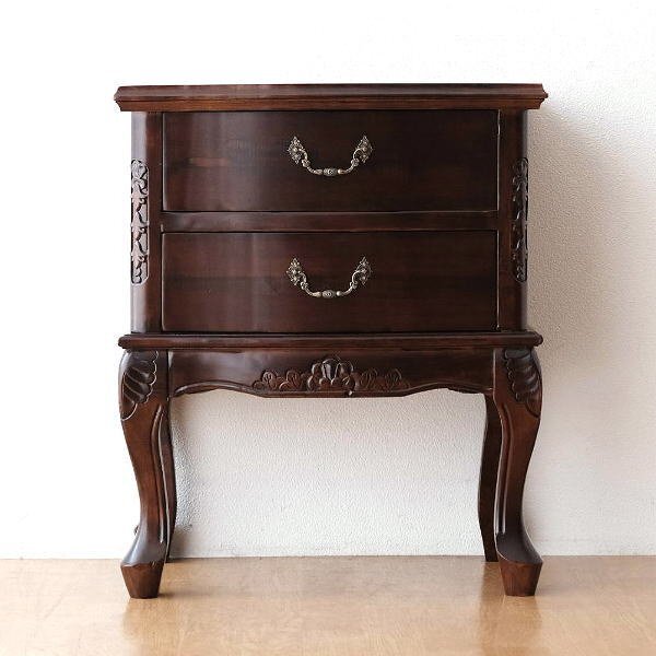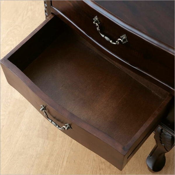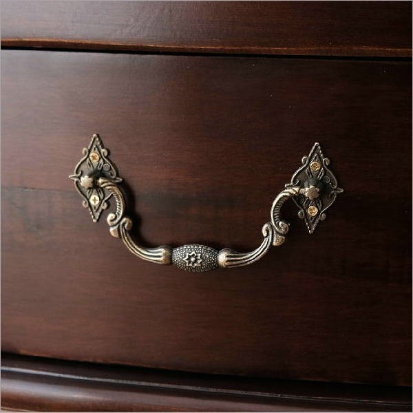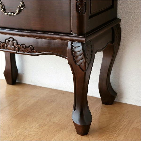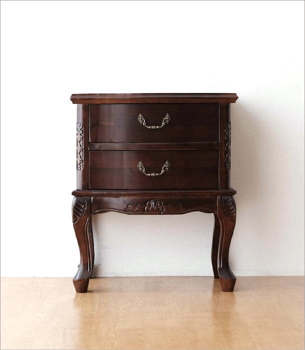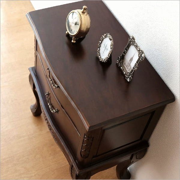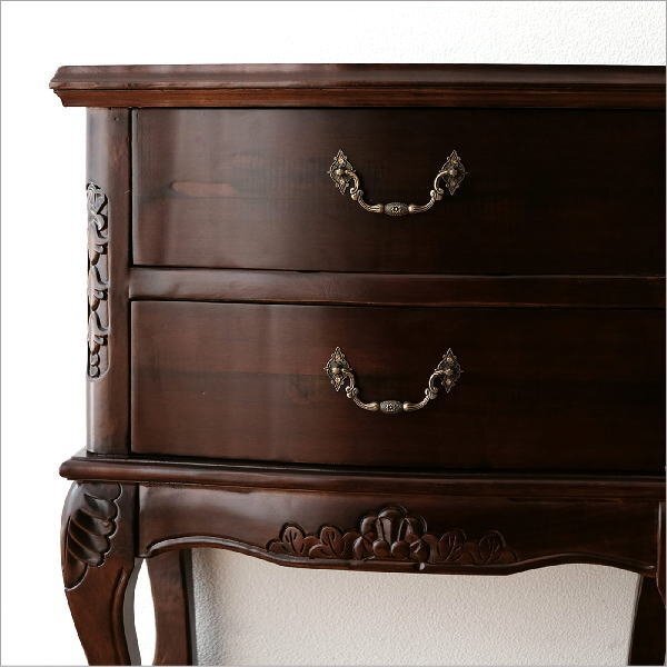 クラシックで上品な雰囲気ただよう アンティークな家具の世界… 一緒に置いたり飾ったりする小物も いっそう上品な印象を与えます 花模様などの飾り彫刻や 緩やかなカーブを描いた天板など シックなカラーに気品と重厚感が漂う 存在感たっぷりの個性派フェイスの家具は アジアン、エスニック、アンティーク リゾート風、和風など 幅広いインテリアに似合いそうです 高さ61cmの引き出し付きスモールチェスト 鉢花を飾る花台にしたり ベッド横のナイトテーブルにもオススメです。 商品名 : アンティークな二段引き出しチェスト 商品番号 : diz6555 全体サイズ(cm) : 幅52×奥行31×高さ61.5 天板サイズ : 幅52×奥行29.5~31 引出内寸 : 上下共通) 幅37×奥行21~22×深さ10.5 ※ストッパーなし 脚内寸 : 幅39×奥行17.5×空間高さ24.5 材質 : 栃 重量 : 約7kg 塗装 : ウレタン 組立状態 : 完成品 生産国 : 中国 ※使用に問題のない細かな仕様変更がある場合がございます ※床のキズ防止フェルトをお付けします ※本物のアンティーク家具ではございません ※アジアン家具特有のアバウトさが見られる商品です ※引き出し内部は塗装の匂いが幾分か致します |