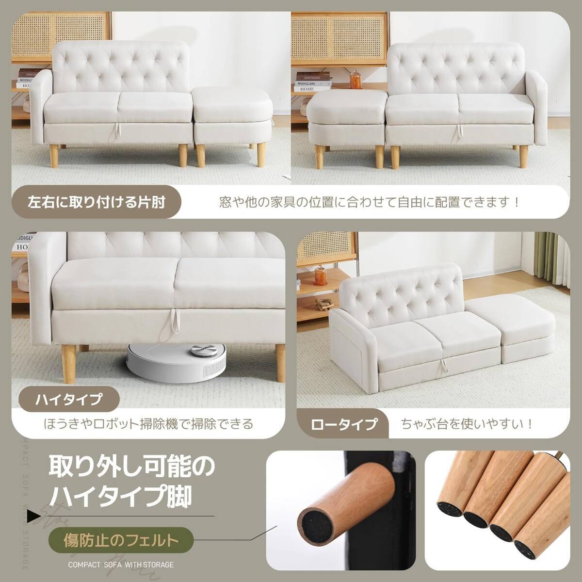 Product FeaturesI型のカウチソファ:全ての部品を一続きに組み合わせ、整然とした直線状のソファーを形成します。広い空間に最適で、家具全体の調和を保ちます。L型のカウチソファ:2つの部分をL字型に配置し、一辺には2人掛け、もう一辺には脚置きを設置して、快適なコーナーを作り出します。くつろぎながら空間を効率的に活用できます。2人掛けと脚置きを分けて使用:2人掛けと脚置きを別々の位置に配置し、家族の活動に柔軟性をもたらし、整頓された空間を保ちます。2. 大容量の収納スペース:私たちの収納ソファーは現代生活の実用的なニーズを考慮し、座面と脚置きの下に広々とした収納スペースを設計しています。これらの隠れた収納スペースは、季節ごとの衣類や家庭用品を収納するだけでなく、家族の空間を効果的に整理し、快適で清潔な居住環境を提供します。3. ハイタイプとロータイプの脚デザイン:多機能性を高めるために、私たちの収納ソファーは高低の脚構造を採用しています。木製の高脚を取り付けると、ソファーは地面から少し浮き上がり、掃除や通気が容易になります。木製の脚を外すと、ソファーは直接床に接するため、日常の使用や家庭生活に適しています。この設計は使用経験を最適化するだけでなく、全体的な外観を美しくします。4. カウチは左右で組み替え可能:製品の実用性と適応性を高めるために、私たちの収納ソファーは左右に組み替え可能なカウチ機能を備えています。扶手を左側または右側に移動することで、さまざまな空間配置と個人の好みに簡単に対応し、柔軟性と利便性を提供します。5. 美しいデザイン:収納ソファーの外観デザインは洗練されたシンプルさで、全体的に美しく見えます。6. ファブリック素材:高品質のファブリック素材を選んでおり、ソファー表面が柔らかく快適で、手触りが繊細です。この天然素材は環境に優しく健康的であり、ソファーの温度と湿度を効果的に調整し、快適な座り心地と使用体験を提供します。7. 快適な座り心地:最も重要なのは、私たちの収納ソファーが綿密に設計され、座面と背もたれに高密度のスポンジを使用していることです。これにより、体をしっかりと支え、長時間座っていても圧力を軽減し、家族の集まりや日常の休息時間に極上の快適さを提供します。8.背もたれも美しく、壁に寄せなくても設置可能:さらに、背もたれも美しいデザインで、壁に寄せずとも配置可能です。Description収納ソファーの特徴現代の家庭では、ソファーは単なる家具に留まらず、家族の中心的存在であり、個性と趣味を表現する重要な要素です。私たちの収納ソファーは多様な組み合わせ方法と実用的なデザインで、お部屋に柔軟性と美しさをもたらします。1. 三種類の組み合わせ方法 収納ソファーは、3種類の主要な組み合わせ方法を提供しています。これにより、さまざまな空間とニーズに応じて自由に配置できます。 I型のカウチソファ:全ての部品を一続きに組み合わせ、直線状のソファーを形成します。このスタイルは広い空間に適しており、家具の調和を保ちます。また、バックレストを壁に寄せることで、空間を最大限に活用できます。 L型のカウチソファ:2つの部分をL字型に配置し、一辺には2人掛け、もう一辺には脚置きを設置します。このスタイルはコーナーに最適で、空間を効率的に利用できます。リビングルームの隅や小さな部屋でも、最適な配置が可能です。 分けて使用する2人掛けと脚置き:2人掛けと脚置きを別々の位置に配置し、家族の活動に柔軟に対応します。この配置を変更することで、空間を整えることができます。特に、季節ごとの家具の配置を変えたい場合や、お客様をお迎えする時に便利です。 これらの組み合わせ方法は、自宅のレイアウトやライフスタイルに合わせて、ソファーを自由にカスタマイズすることができます。 2. 大容量の収納スペース 収納ソファーには、座面や脚置きの下に広々とした収納スペースが設けられています。これにより、季節ごとの衣類や家庭用品を効果的に収納でき、家具を整理することができます。例えば、冬物のブランケットやクッションを、使わない時は隠すことができます。この機能により、リビングスペースを常に清潔で快適な状態に保つことができます。 3. ハイタイプとロータイプの脚デザイン 収納ソファーは、ハイタイプとロータイプの脚デザインを採用しています。木製のハイ脚を装着すると、ソファーは床から浮き上がり、掃除や通気が容易になります。一方、脚を外すと、ソファーは直接床に接するため、日常的な使用や家族の生活に適しています。このデザインは、使用状況に応じてソファーの機能性を最適化し、外観を美しく保ちます。また、脚の高さを調整することで、お好みの高さやスタイルに合わせて、ソファーをカスタマイズすることができます。 4. カウチは左右で組み替え可能収納ソファーは、左右に組み替え可能なカウチ機能を備えていま