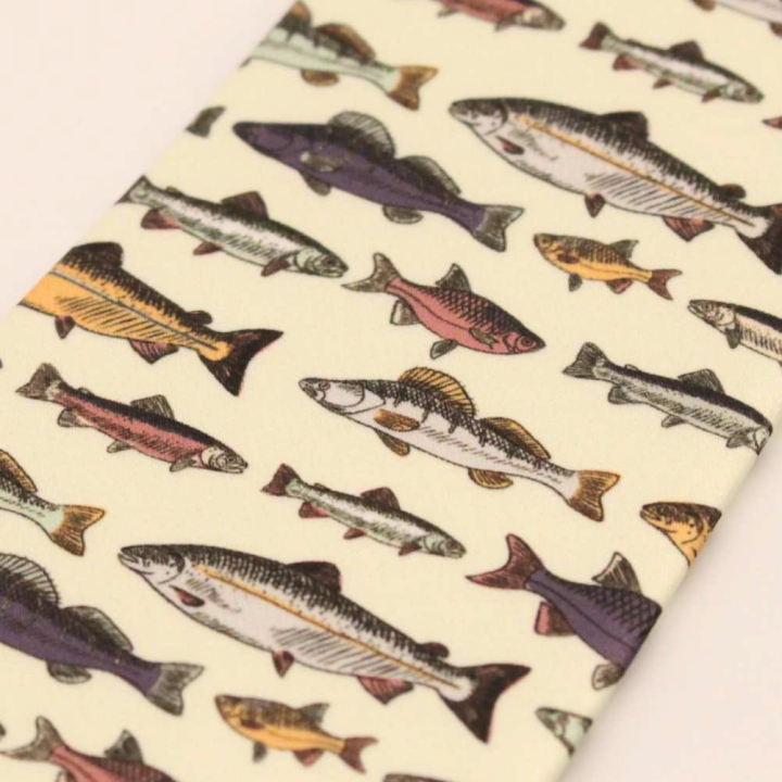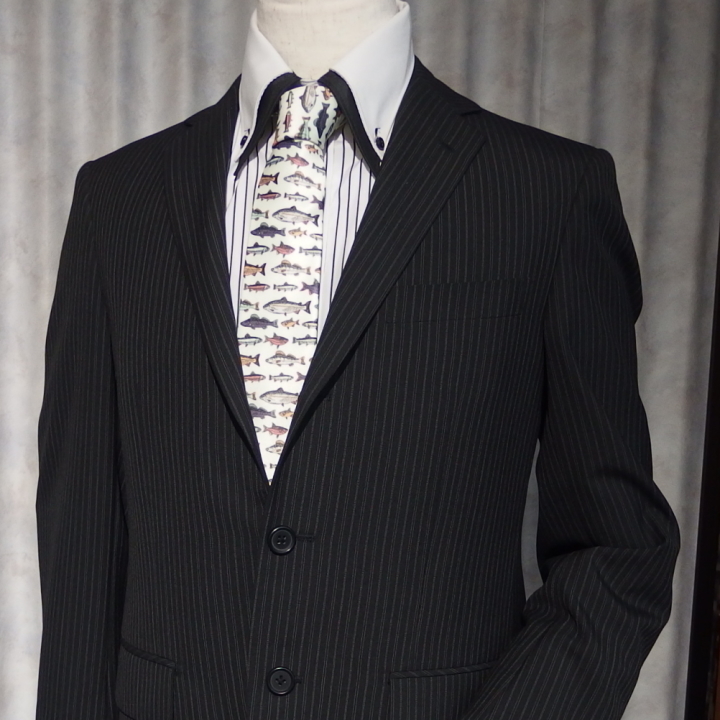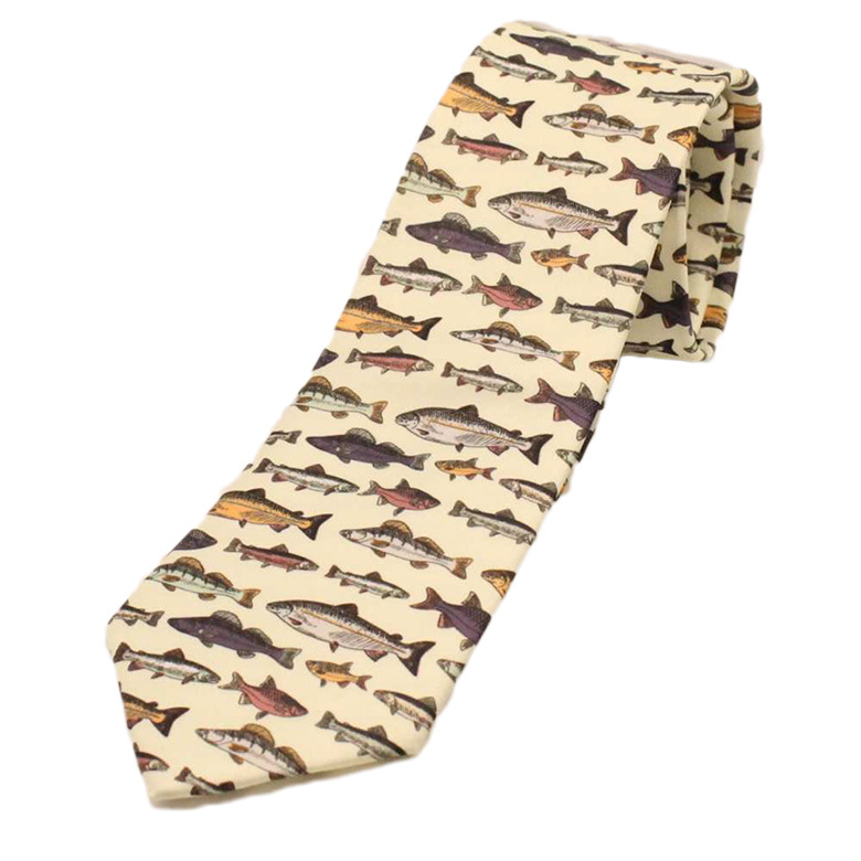 まるで図鑑の1ページから飛び出したような魚柄が特徴のこのネクタイは、釣り好きな方々にぴったりの一品です。鱗やヒレ、目まで細かく描かれたリアルなデザインは、周囲の注目を一身に集めること間違いなし!釣りの帰りや釣り仲間との食事会など、様々なシーンで存在感を放ちます。