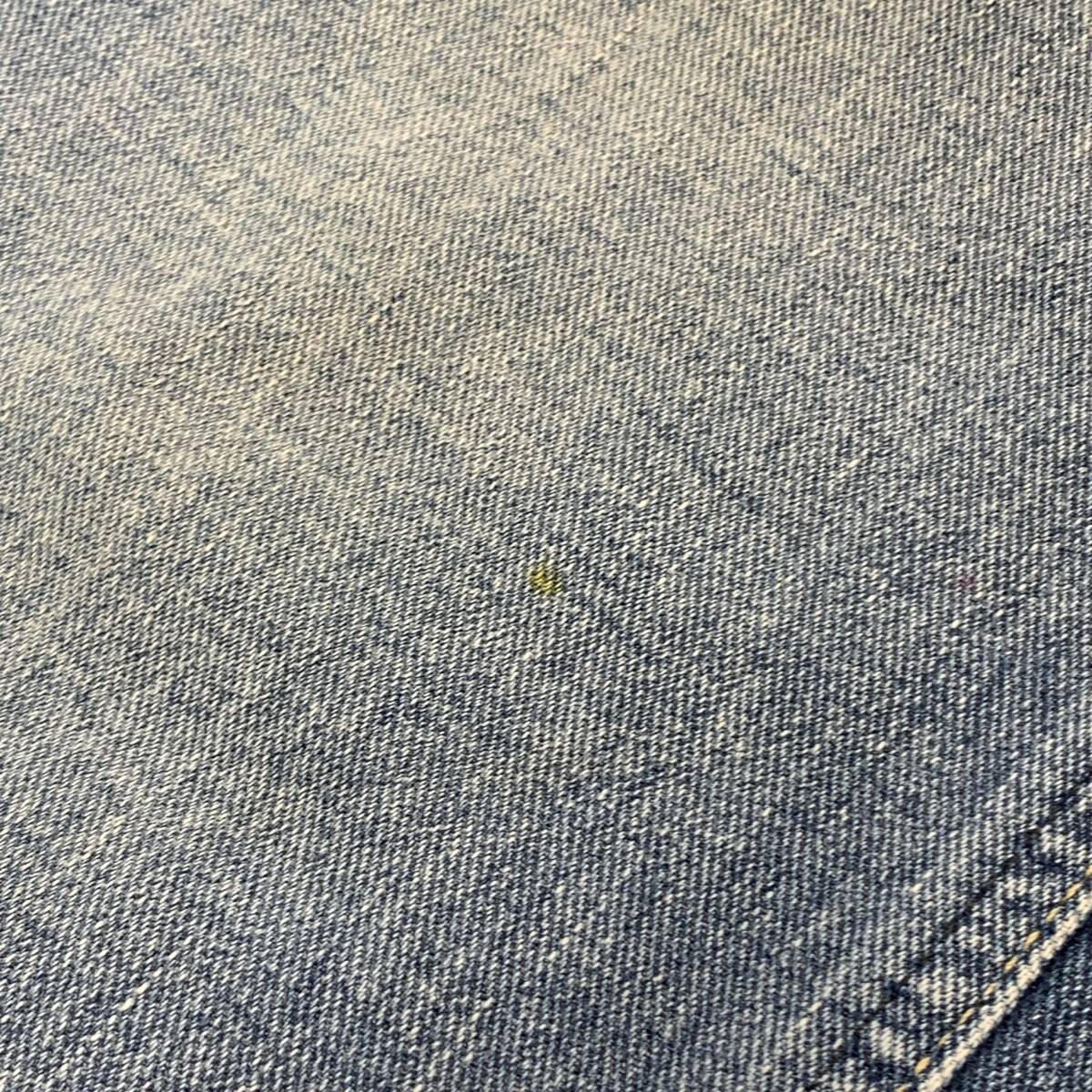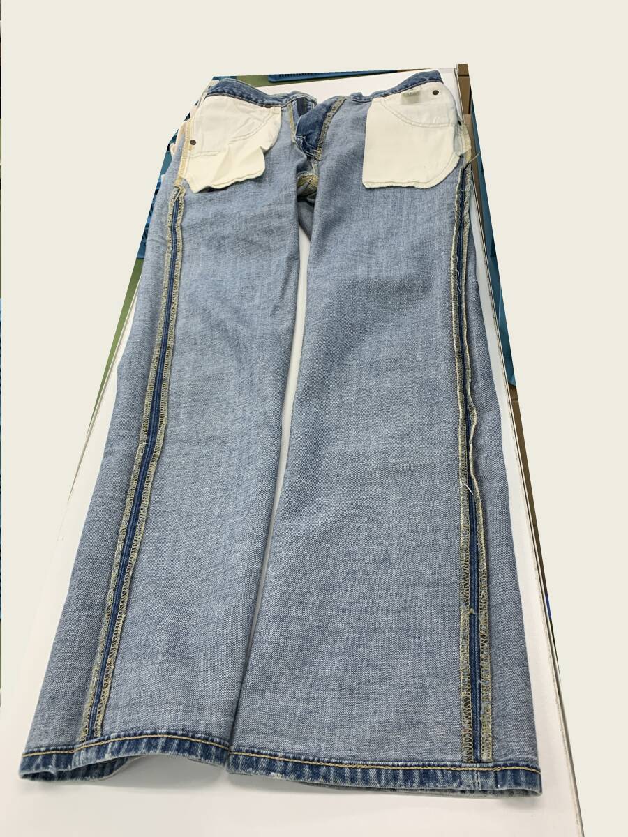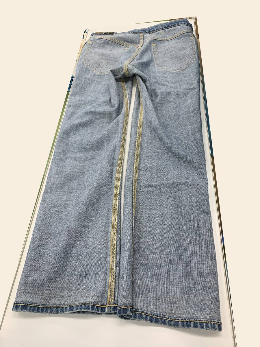 中古です。 右側太ももの箇所に汚れがあります。 全体的に退色感がありますが、加工になっているため、画像をご覧のうえでご判断ください。 サイズは素人による計測のため、誤差がある可能性をご了承ください。 サイズ:S/腰回り 80cm/総丈 103cm/股上 29cm 素材:綿100%/牛革(革ラベル) 製造国:日本 付属品:なし |